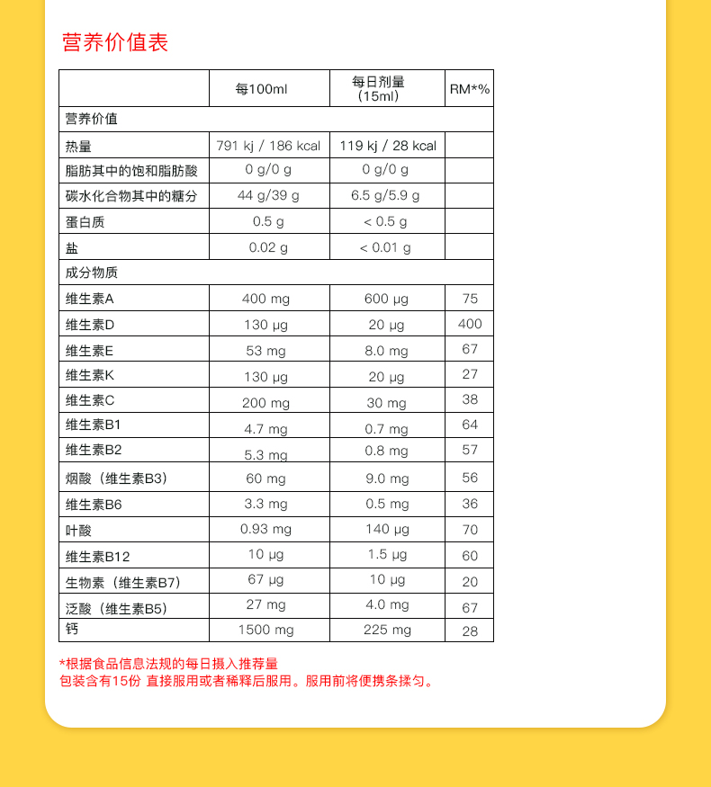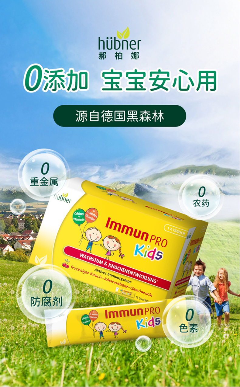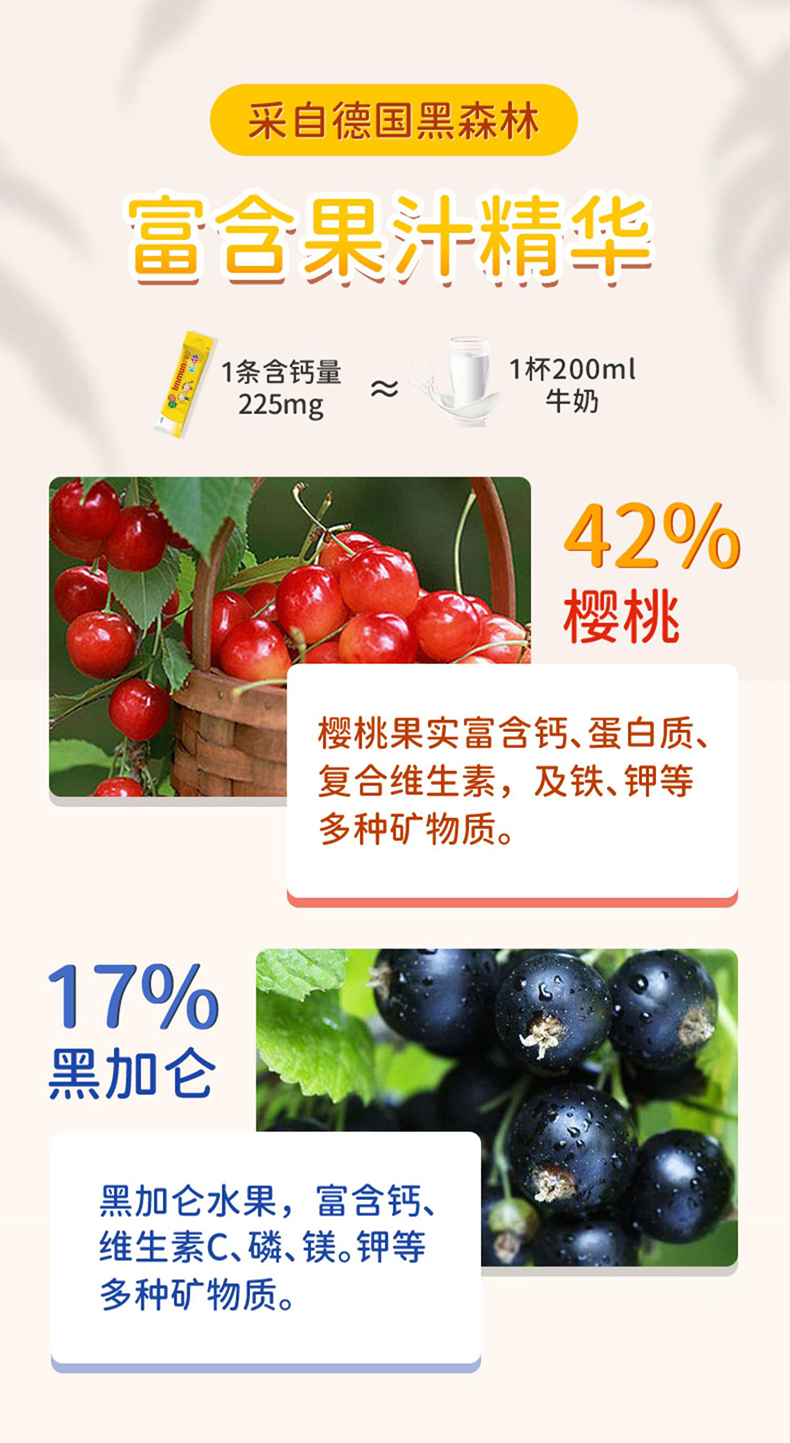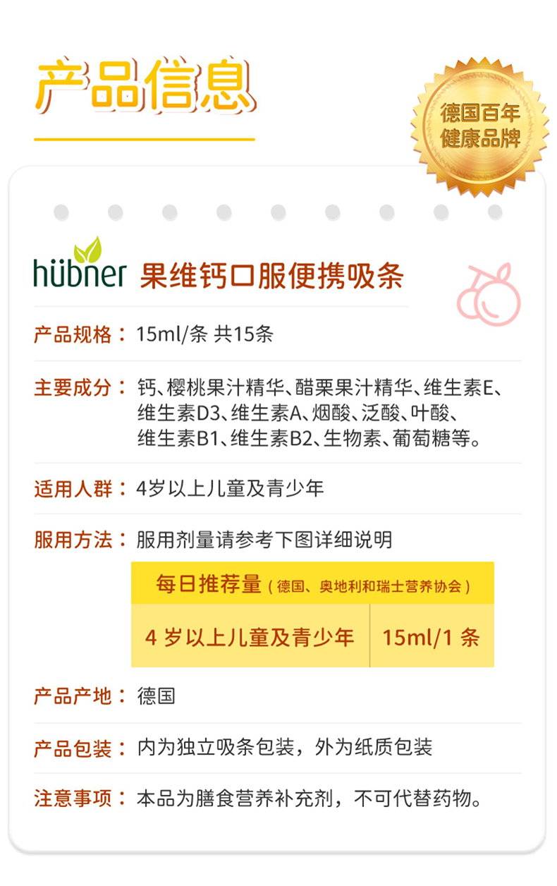 德国Huebner郝柏娜儿童液体钙樱桃水果味多维他口服液便携吸条15ml*15条