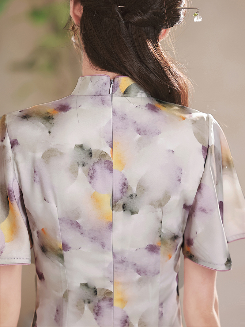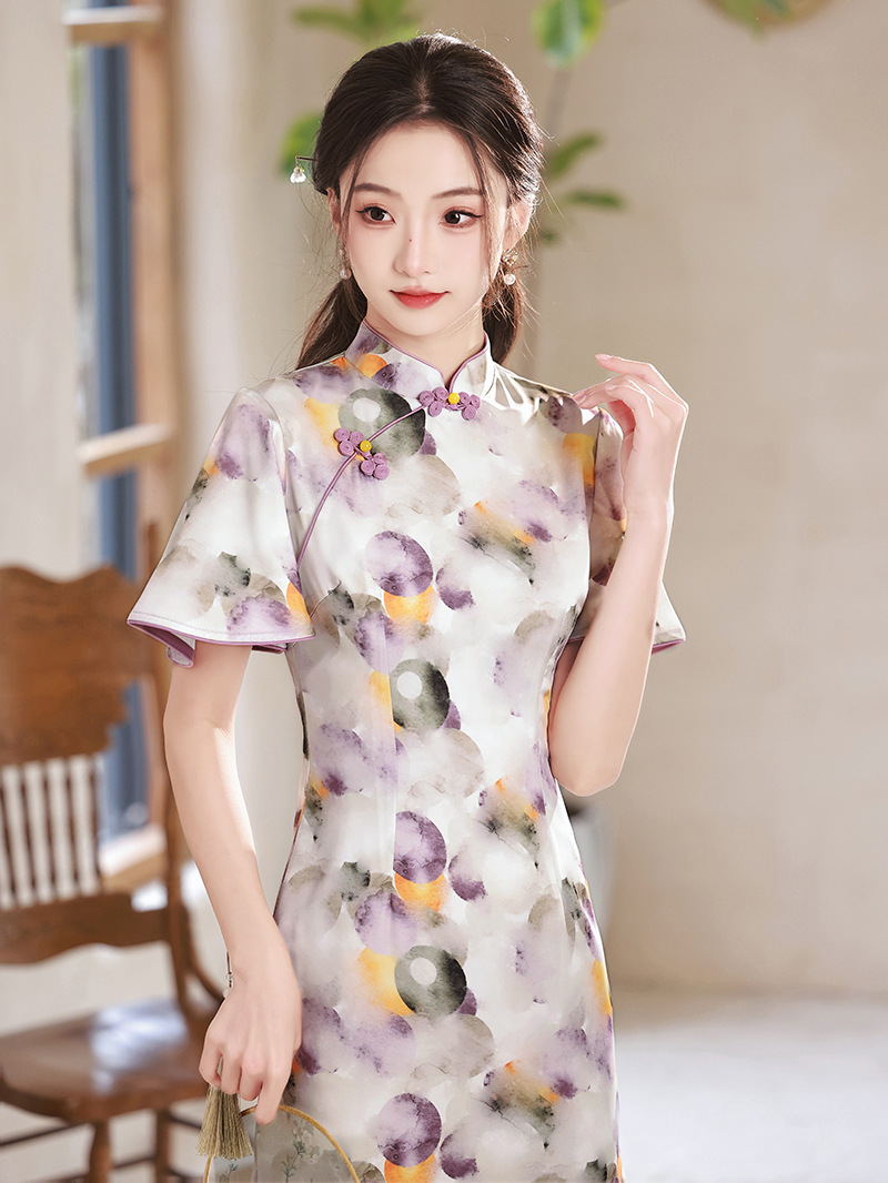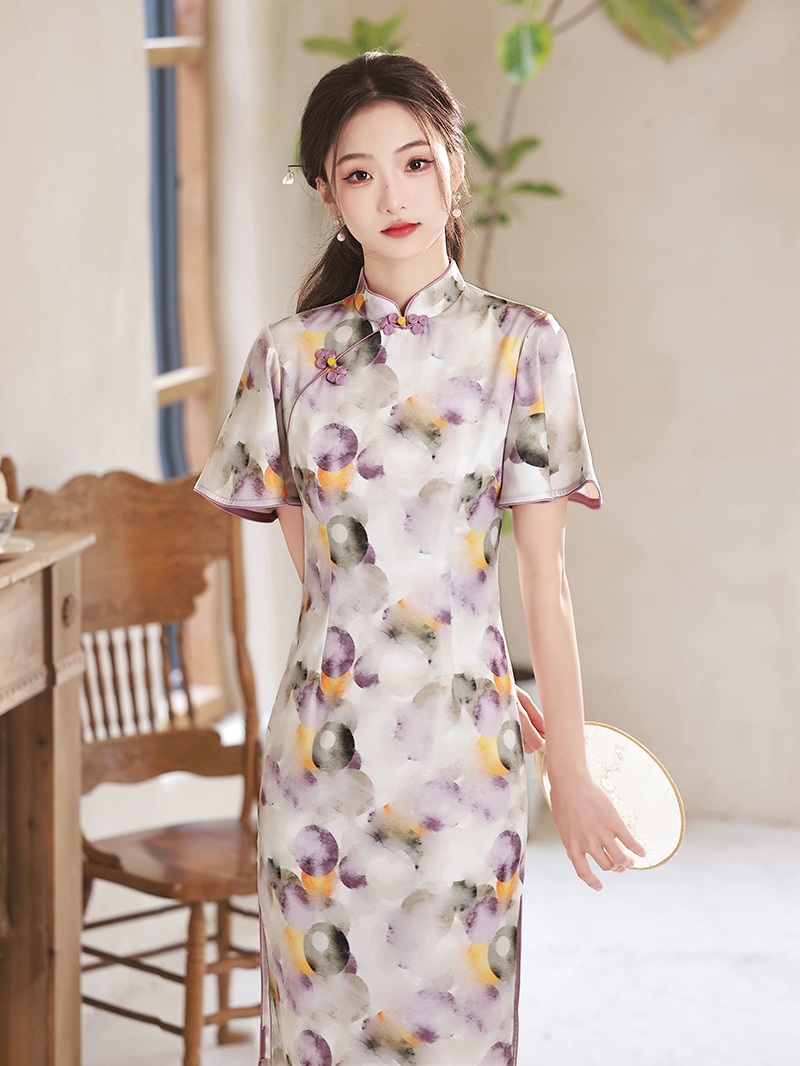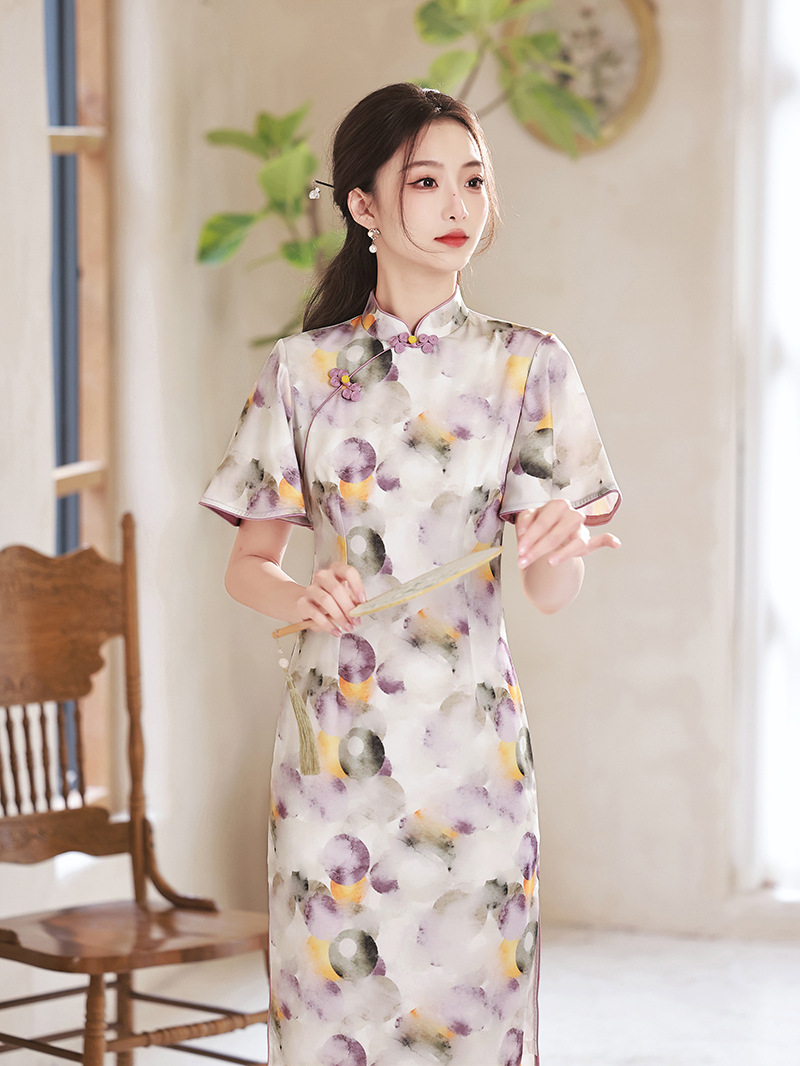 春夏新款,印花修身提花丝绸中长款旗袍XL-23133