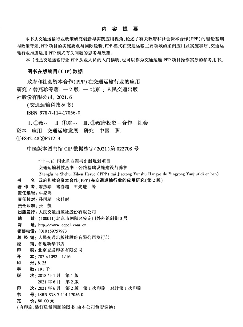 书名:政府和社会资本合作(PPP)在交通运输行业的应用研究(第2版)
