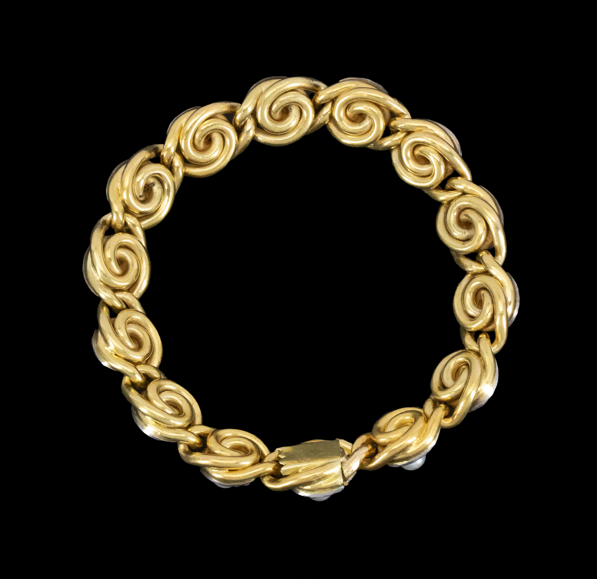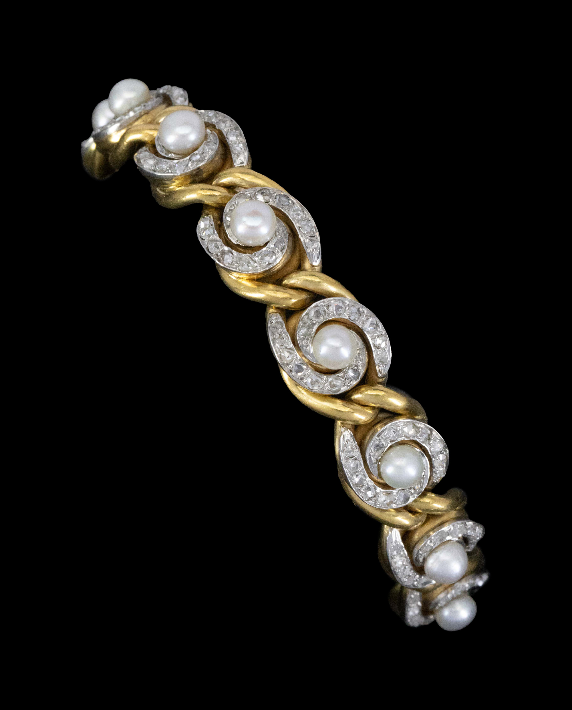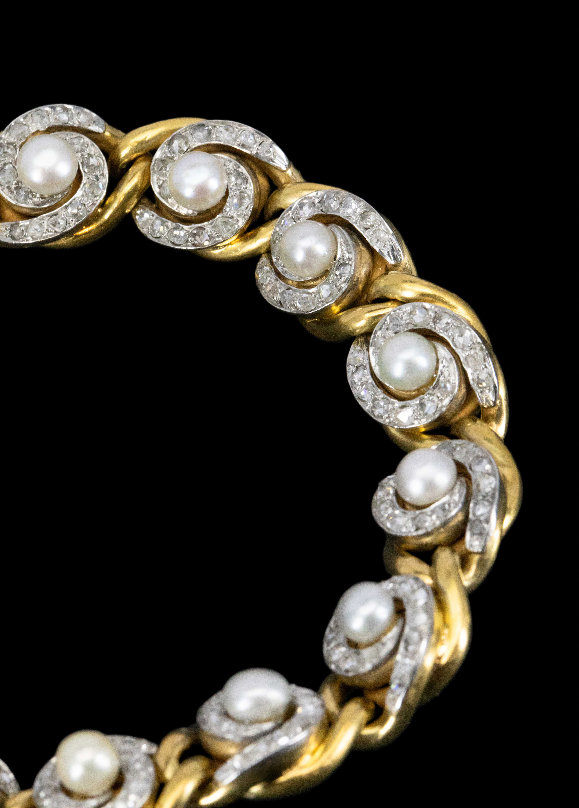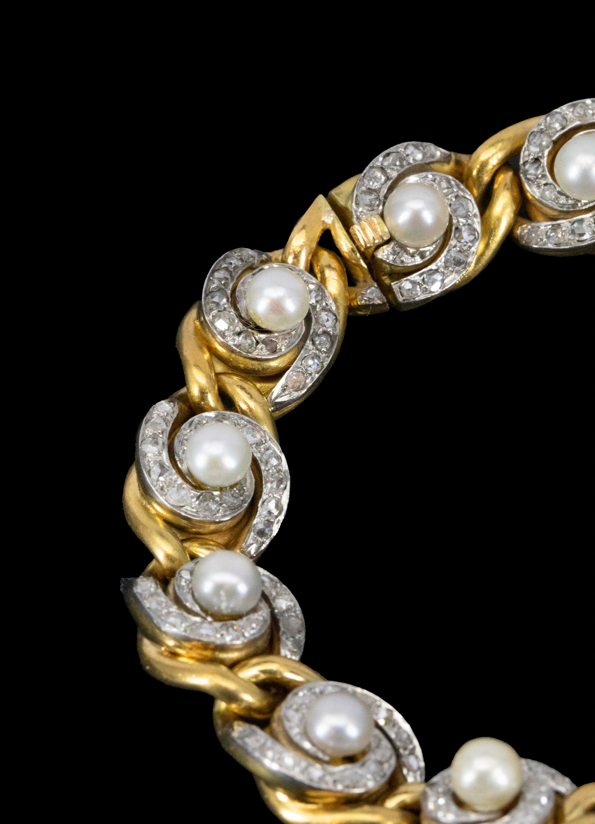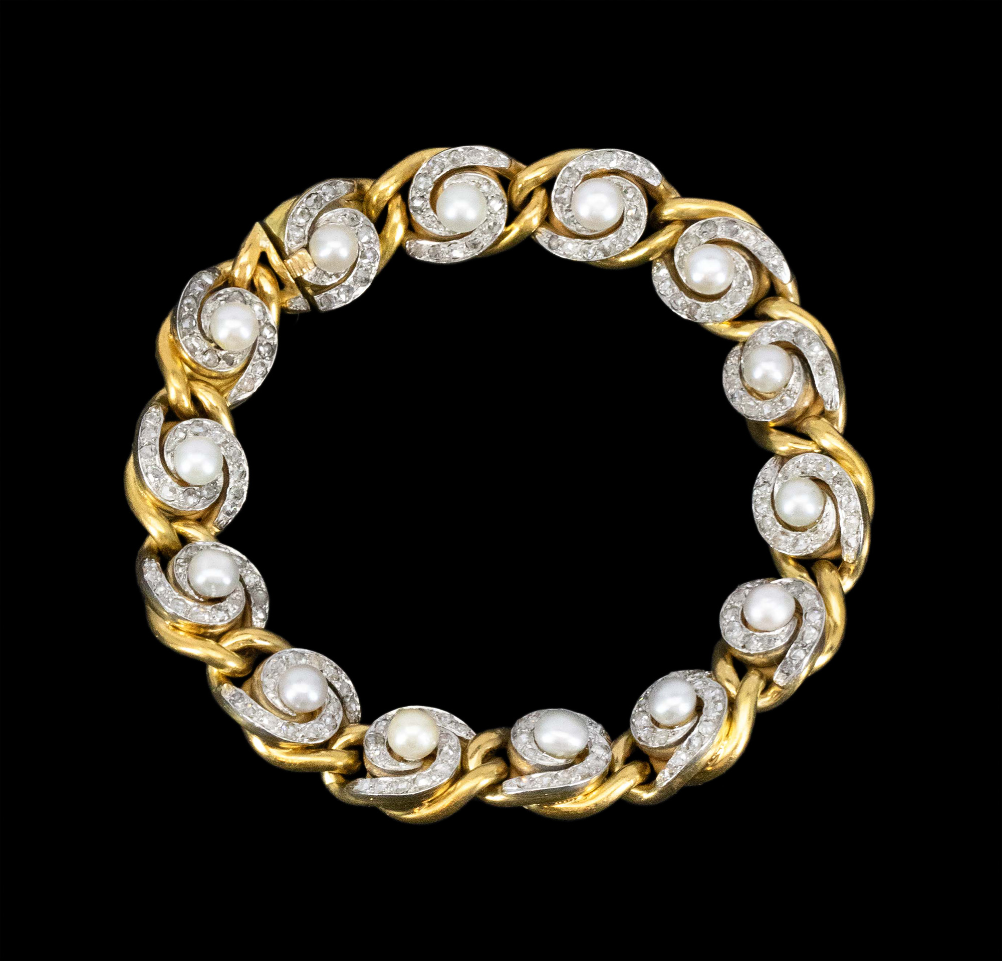 1900年代法国出品曲链式旋涡造型18K黄金镶嵌天然海水珍珠及钻石手链