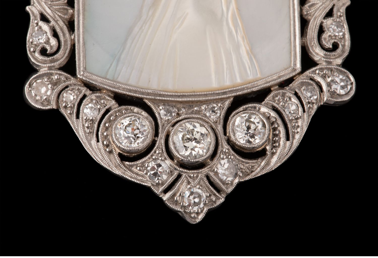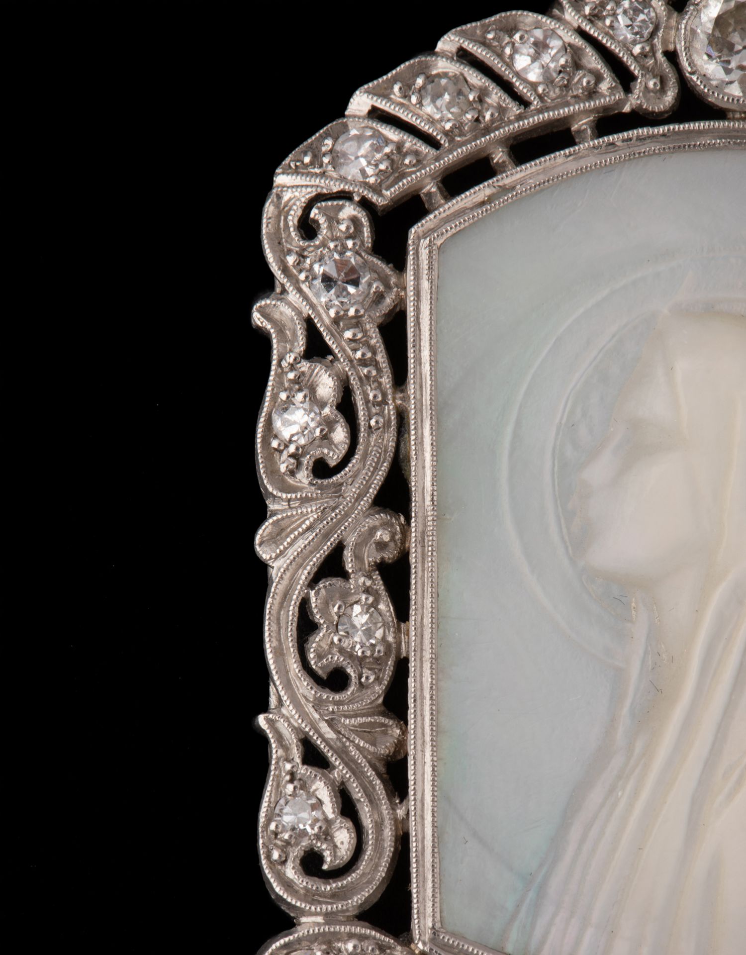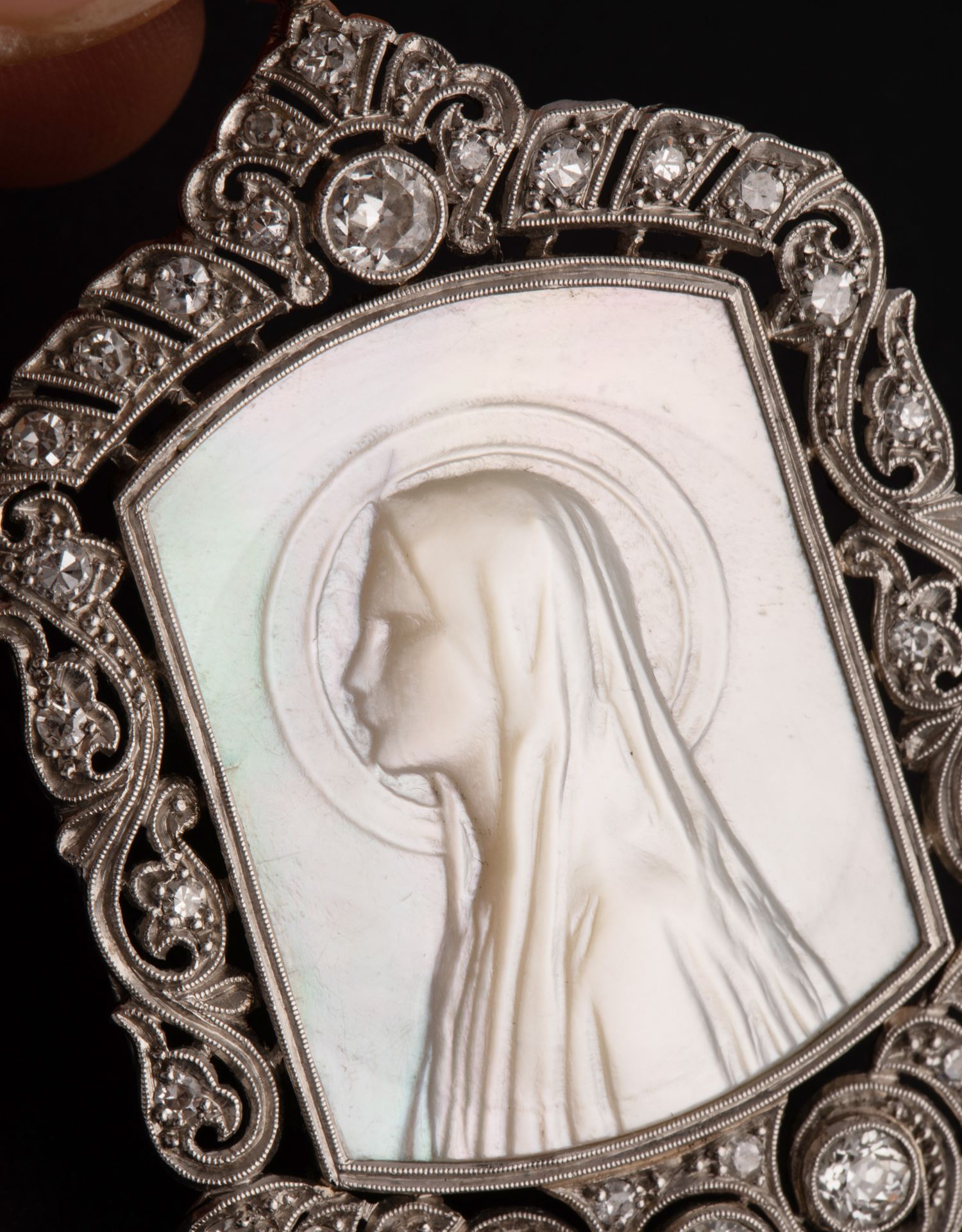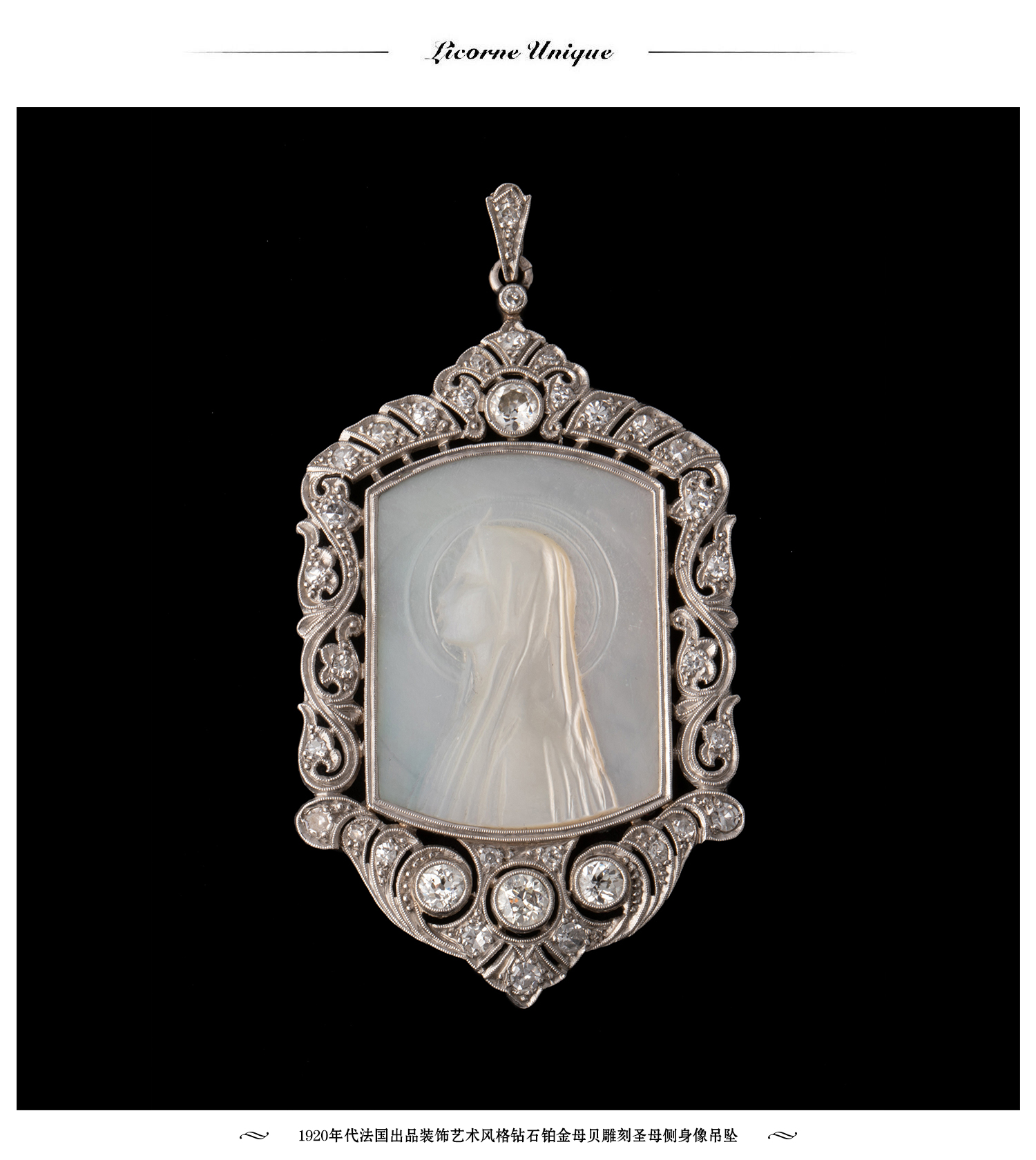 独角鹿西洋古董珠宝首饰装饰艺术钻石铂金母贝雕刻圣母侧身像吊坠