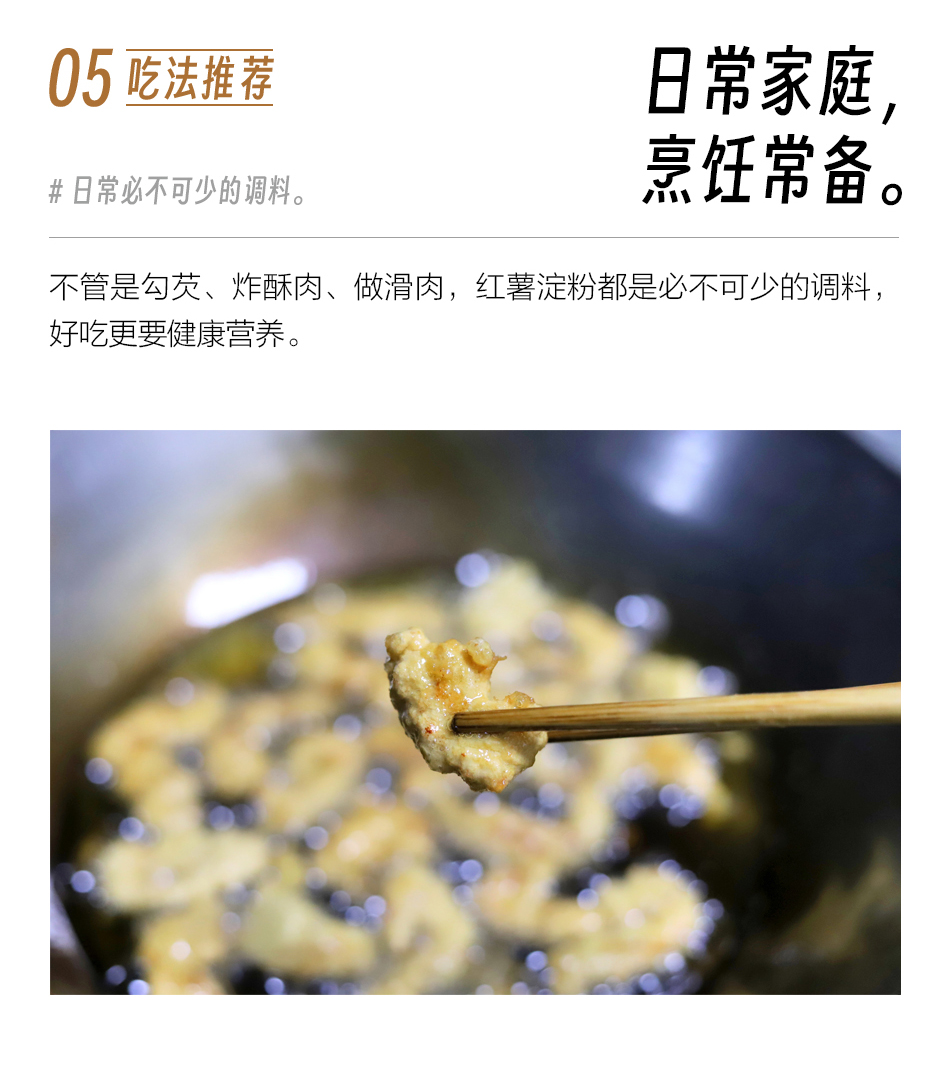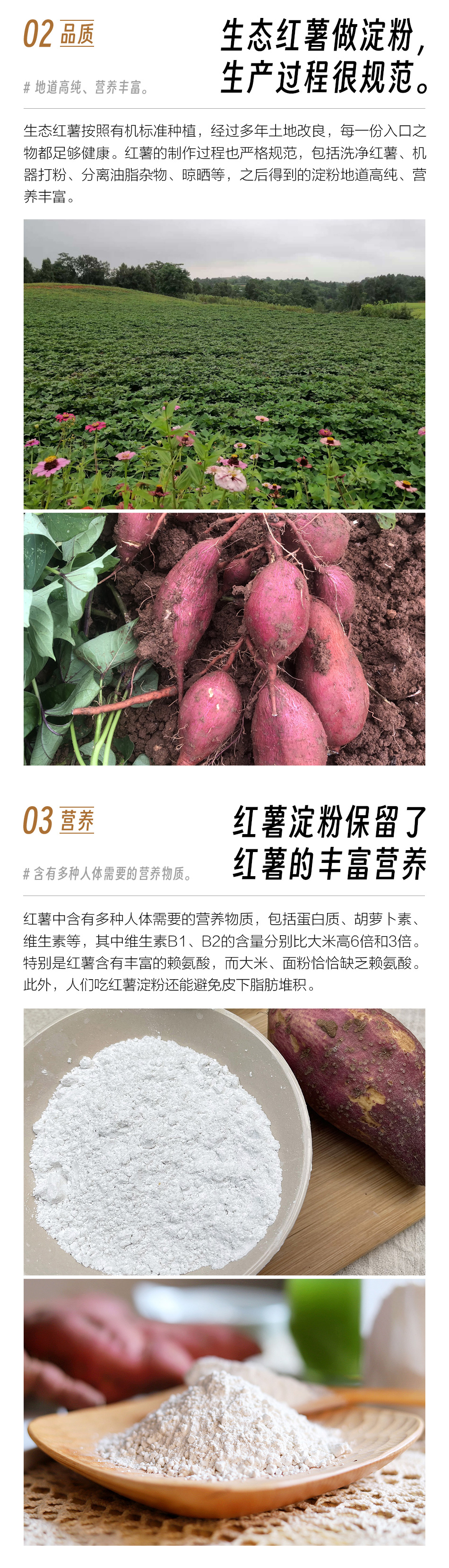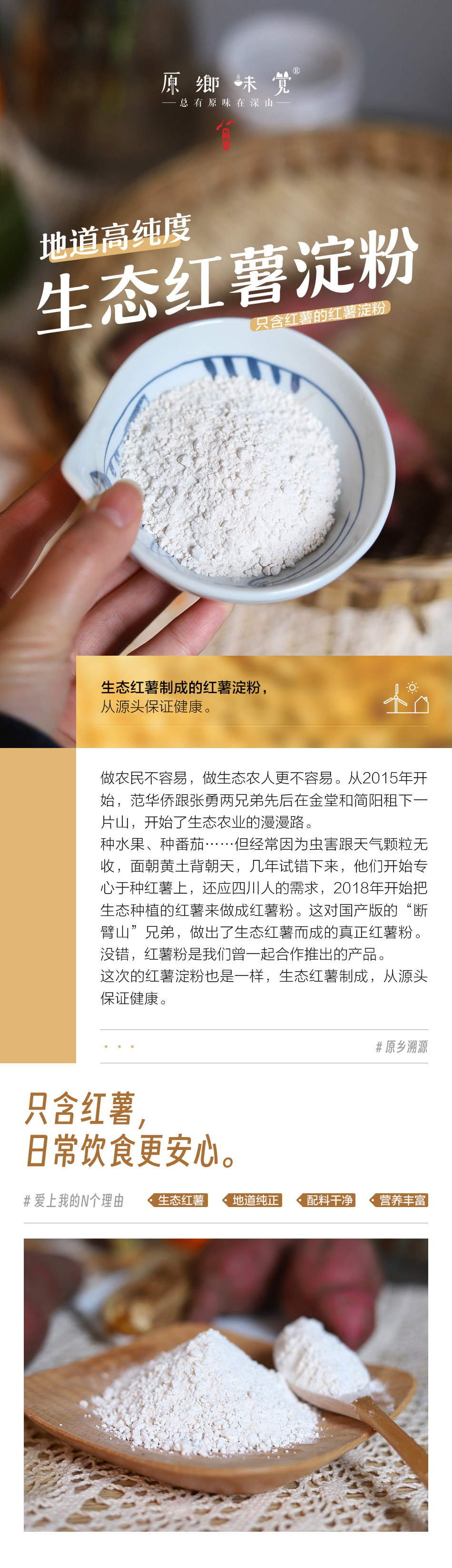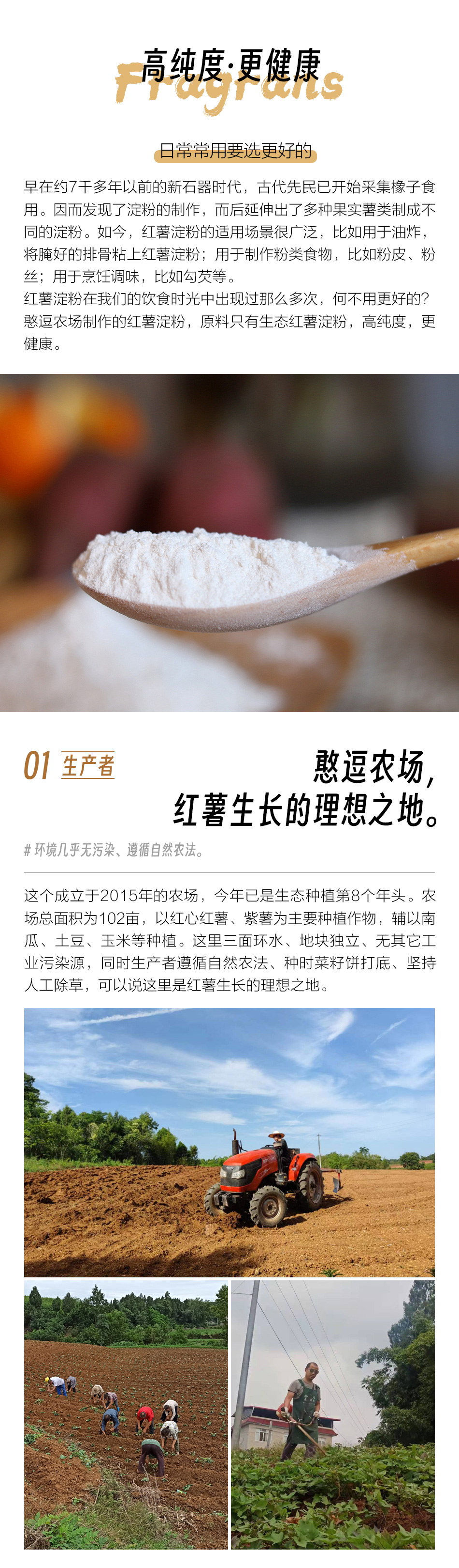 【品名】:红薯淀粉 【原料】:红薯 【规格】:250g / 罐 【生产者】:范华侨、张勇 【种植方式】:生态种植,无任何化肥农药等,人工除草 【生产日期】:见包装 【保质期】:18个月 【储存方法】:阴凉干燥处密封储存,勿受潮 【温馨提示】: 1、受天气或库存等原因影响快递可能偶有耽误,急单请发货前咨询客服,不接受没有提前沟通的拒收。 2、已发货后不接受没有沟通的退款申请。
