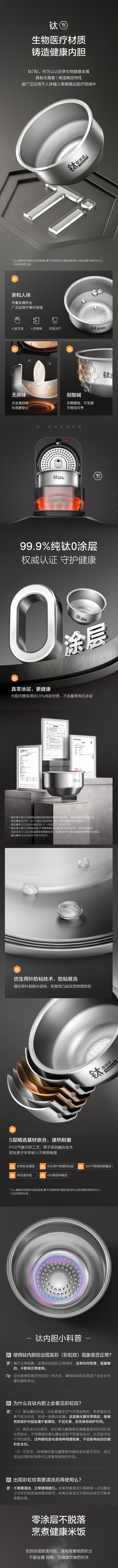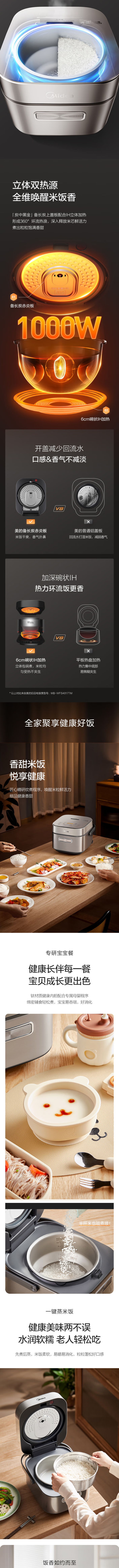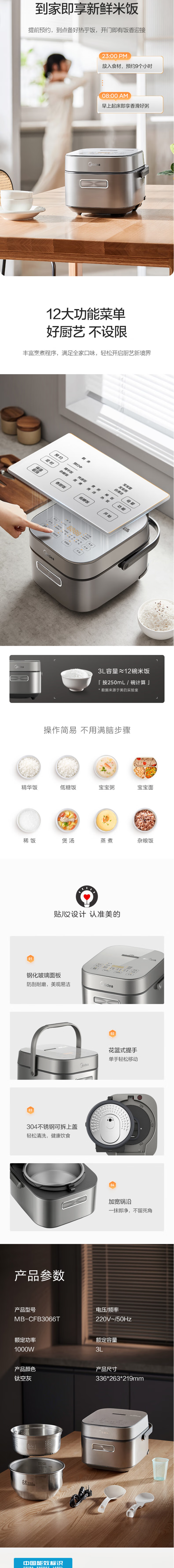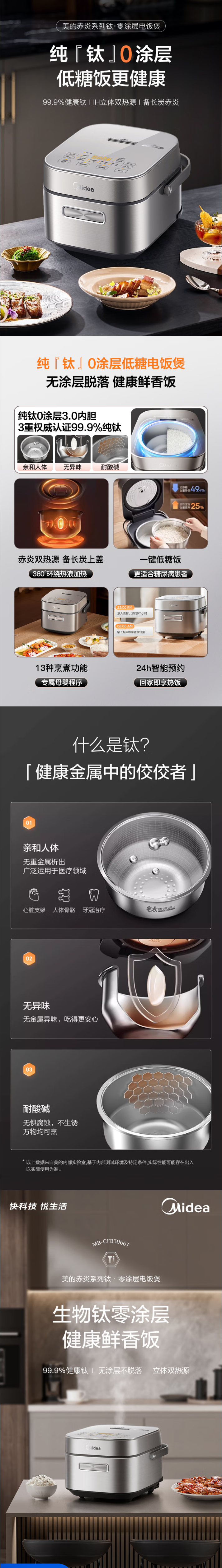 美的(510555)(Midea)纯钛0涂层低糖电饭煲3L电饭锅家用2-3人赤炎炭火1000W电磁IH双热源加热钛釜系列国家补贴CFB3066T