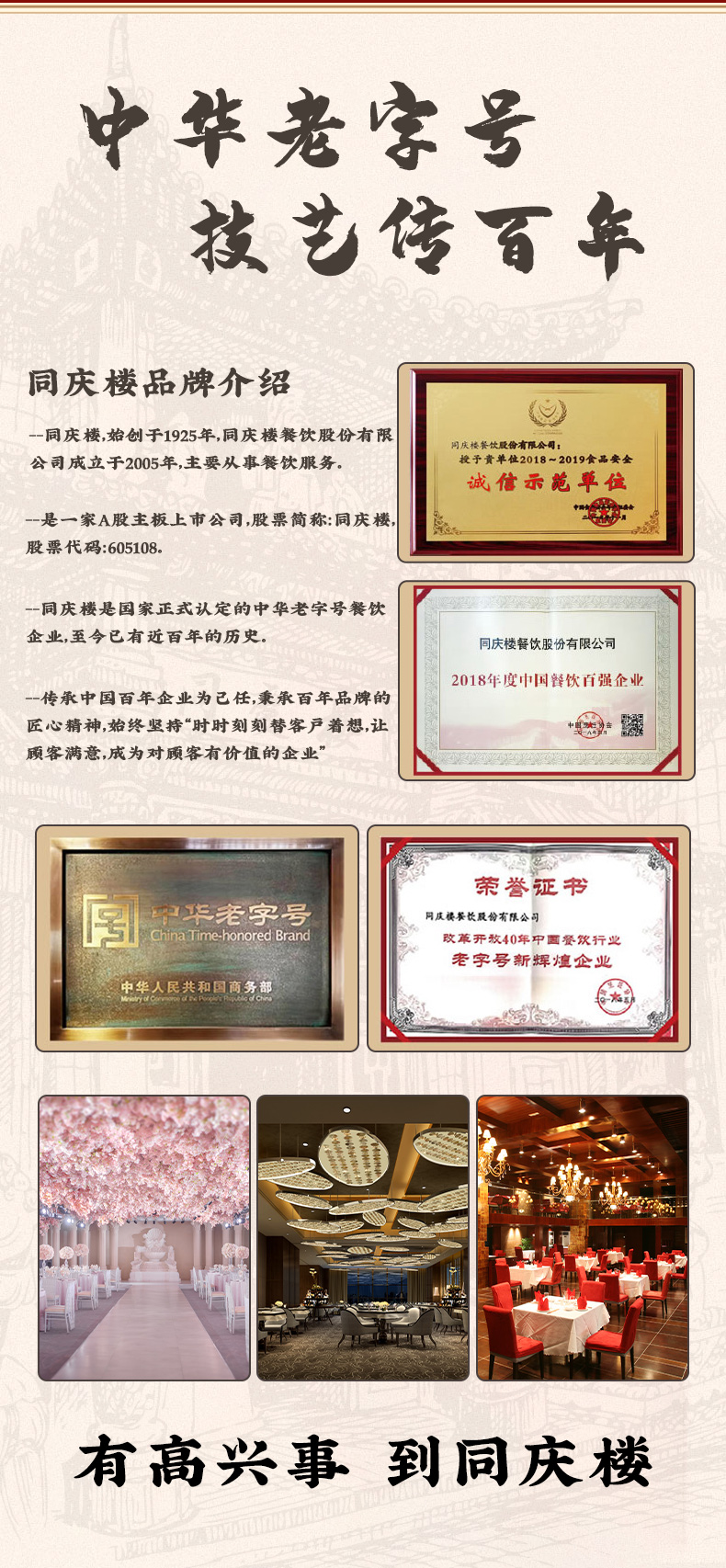 - 同庆楼品牌始创于1925年,是中华老字号,安徽和江苏两省餐饮龙头企业;是中国餐饮百强企业,荣获多项荣誉,深受各方关注和好评,赢得海内外宾客广泛赞誉