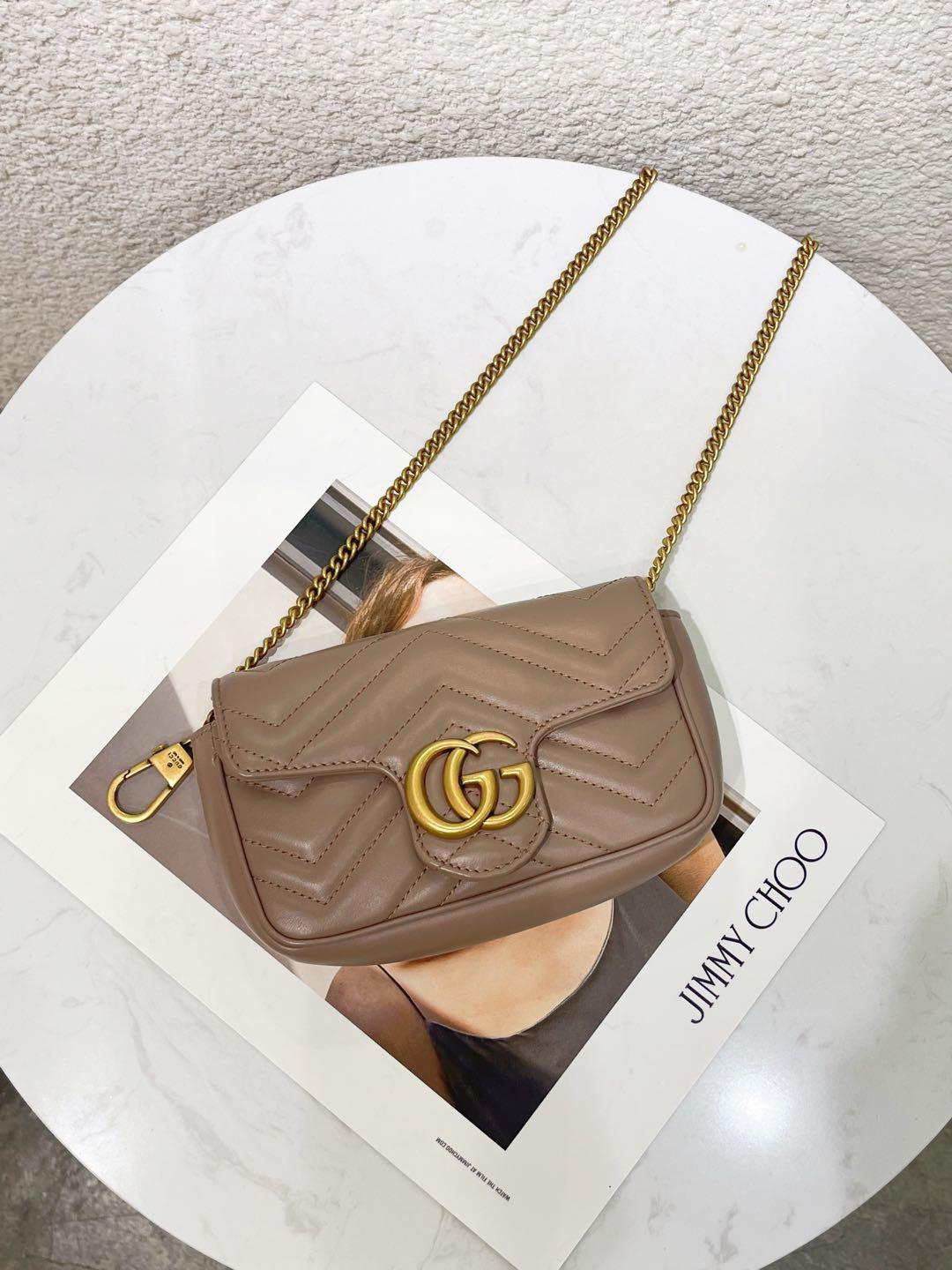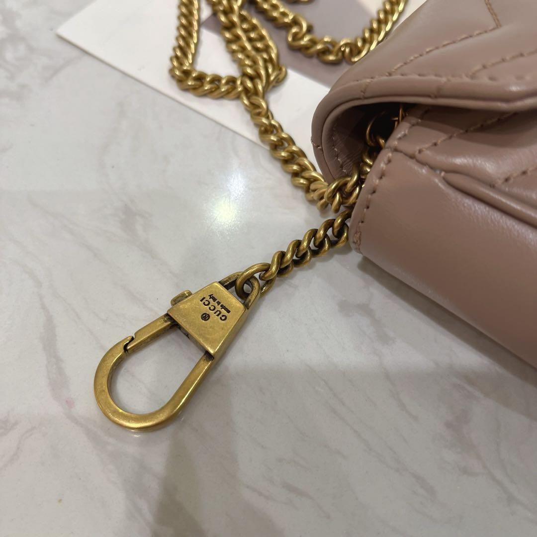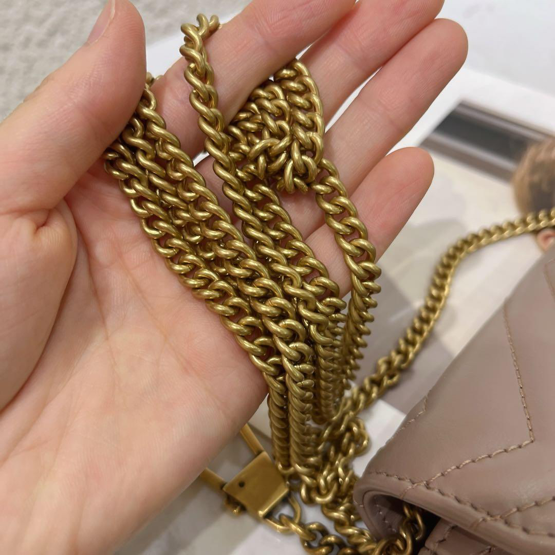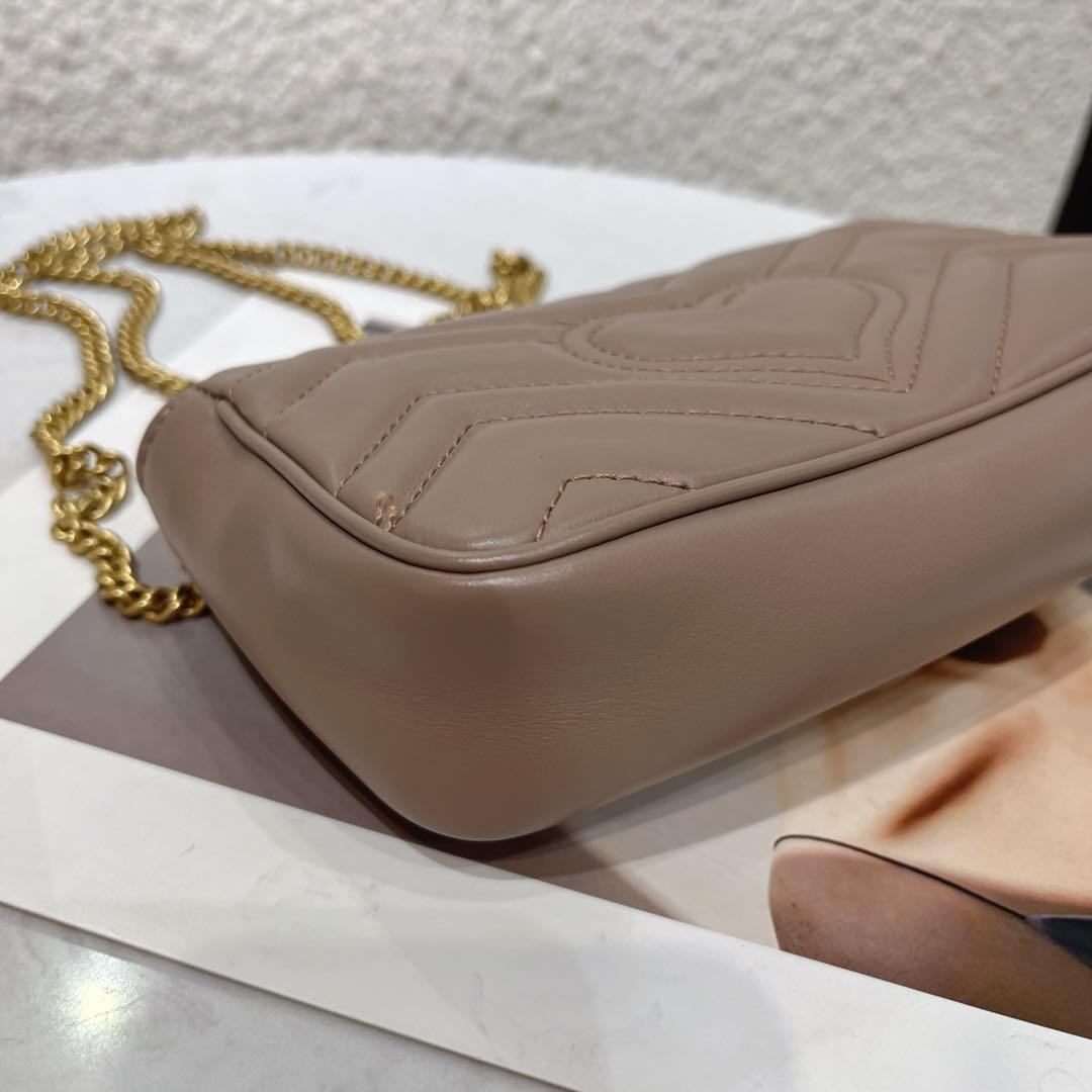 【商品詳情】正品二手 Gucci 马蒙 mini 牛皮 奶茶色 斜挎包🍿97新 17x9 配件:链条 龙虾扣 防尘袋。温柔可爱精致