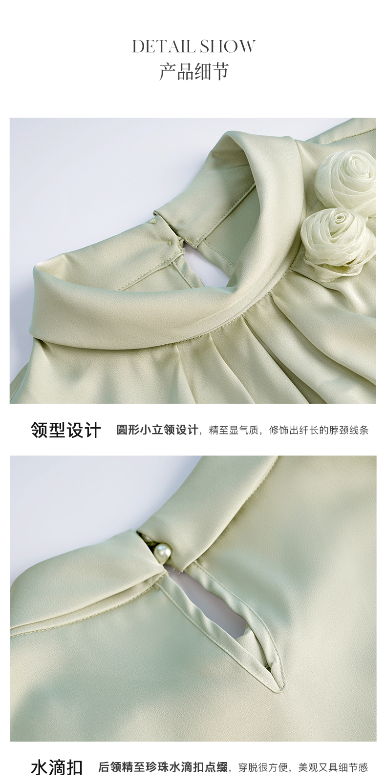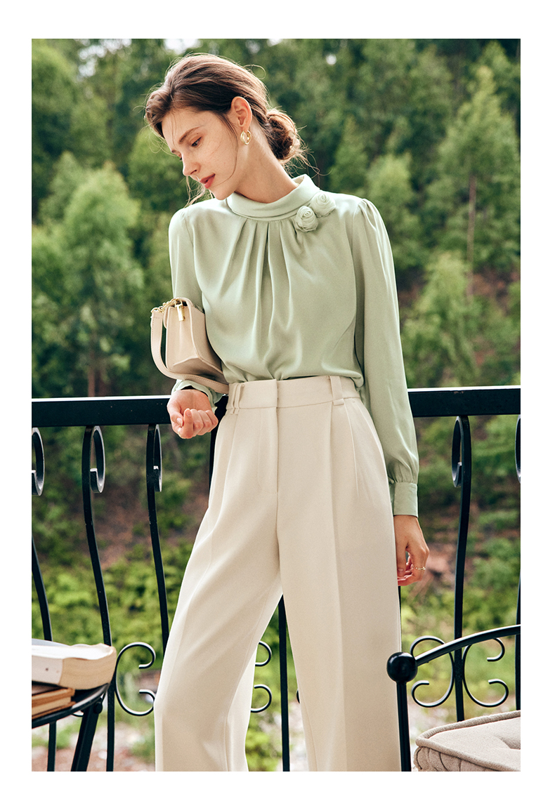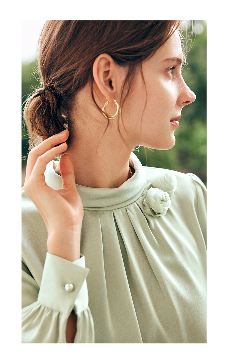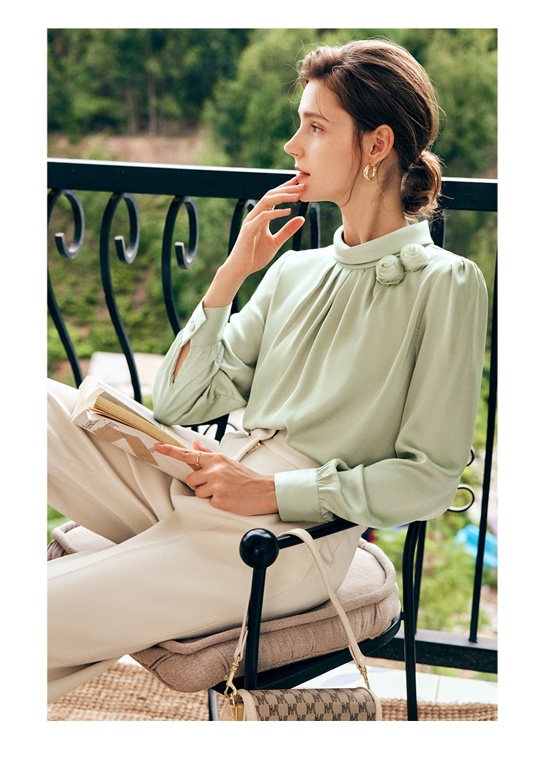 OLrain欧芮儿法式浅绿色雪纺蕾丝衫女早秋2022新款设计感立领上衣