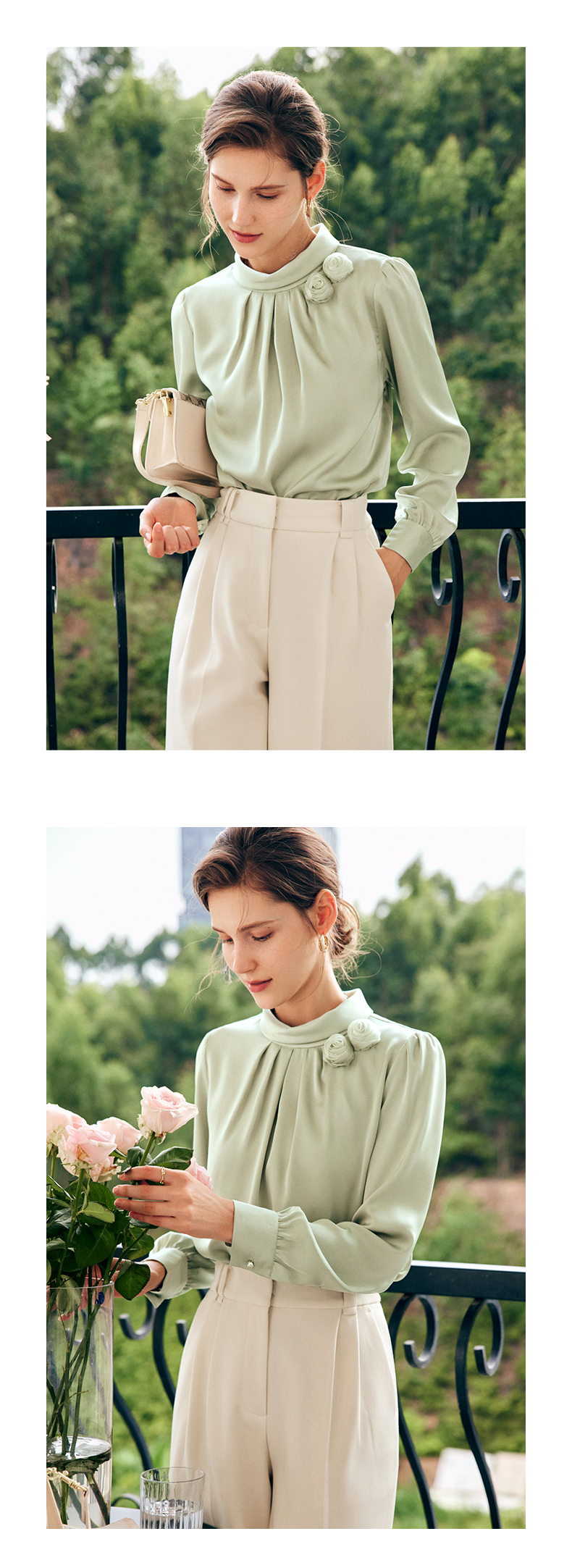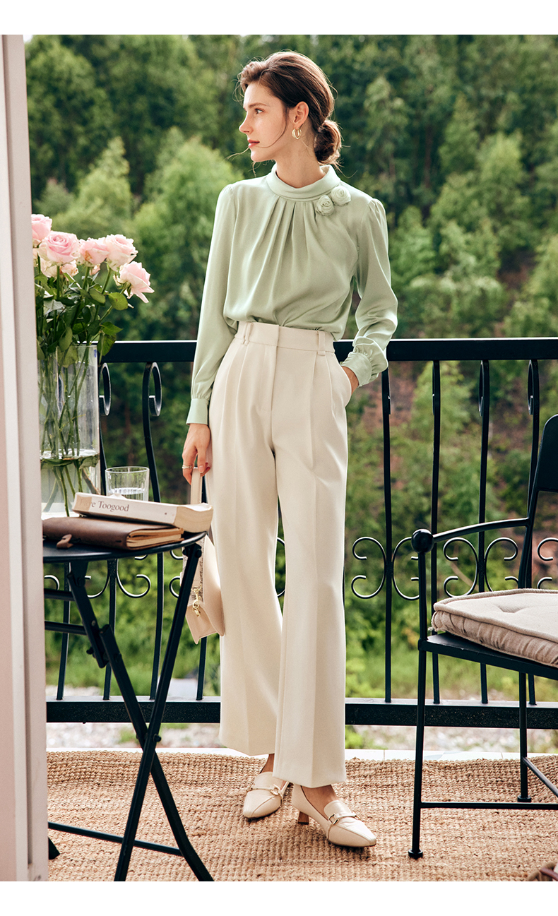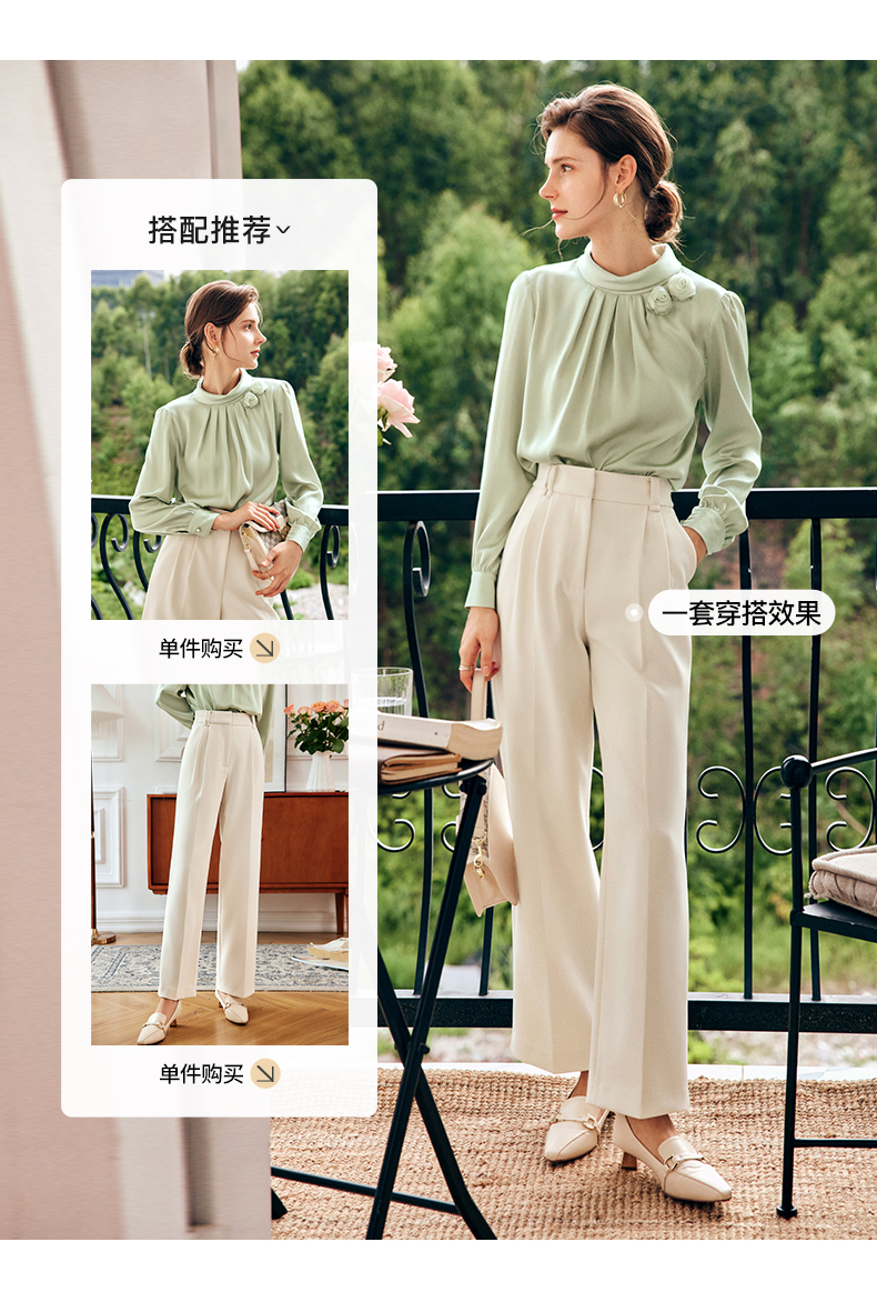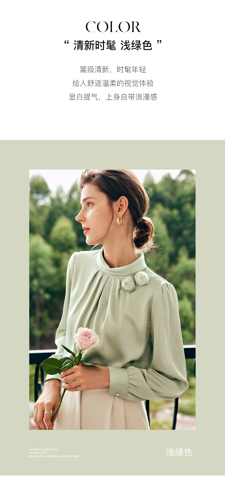 OLrain欧芮儿法式浅绿色雪纺蕾丝衫女早秋2022新款设计感立领上衣