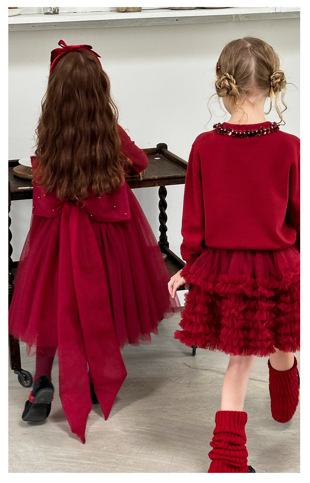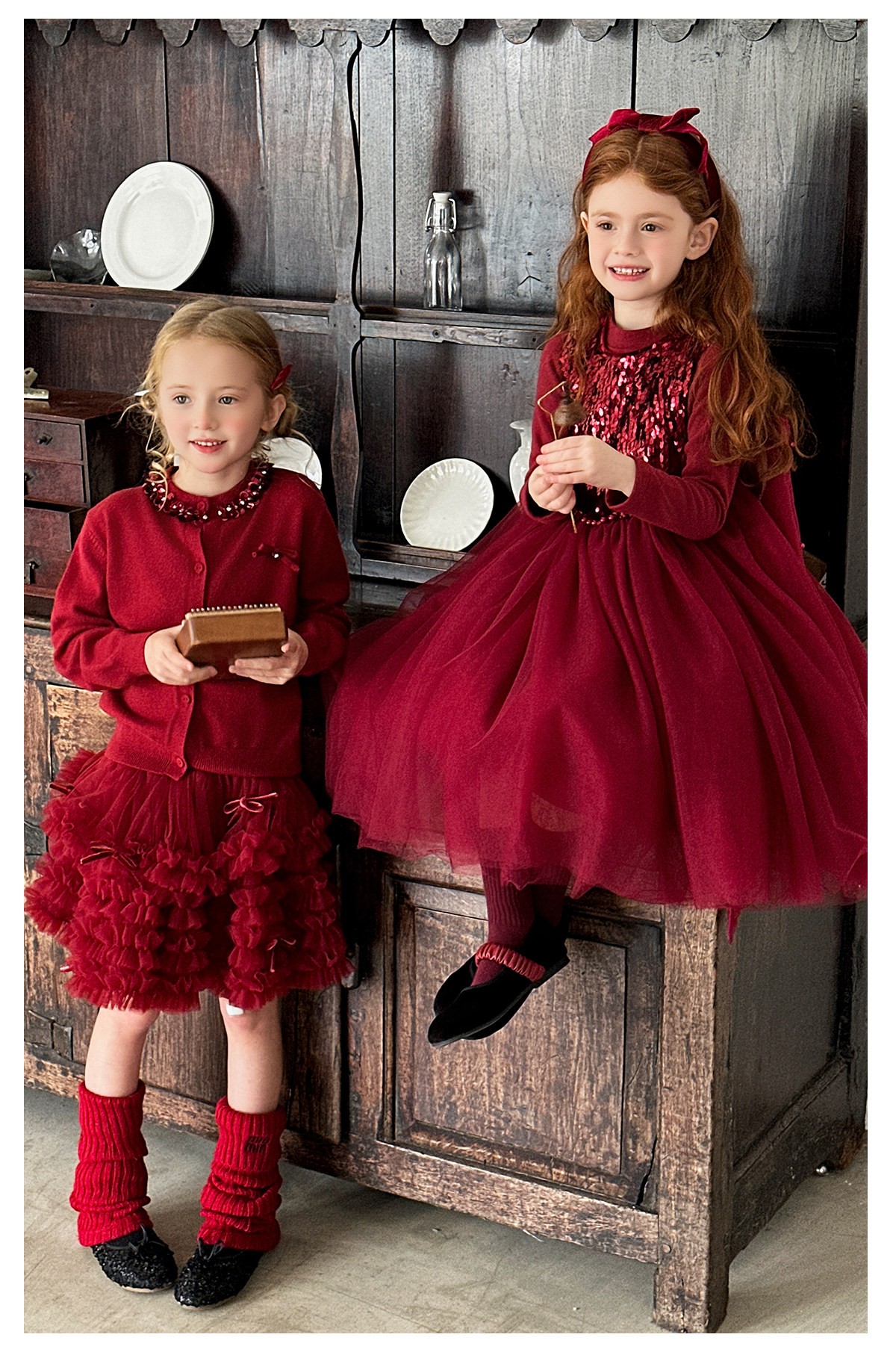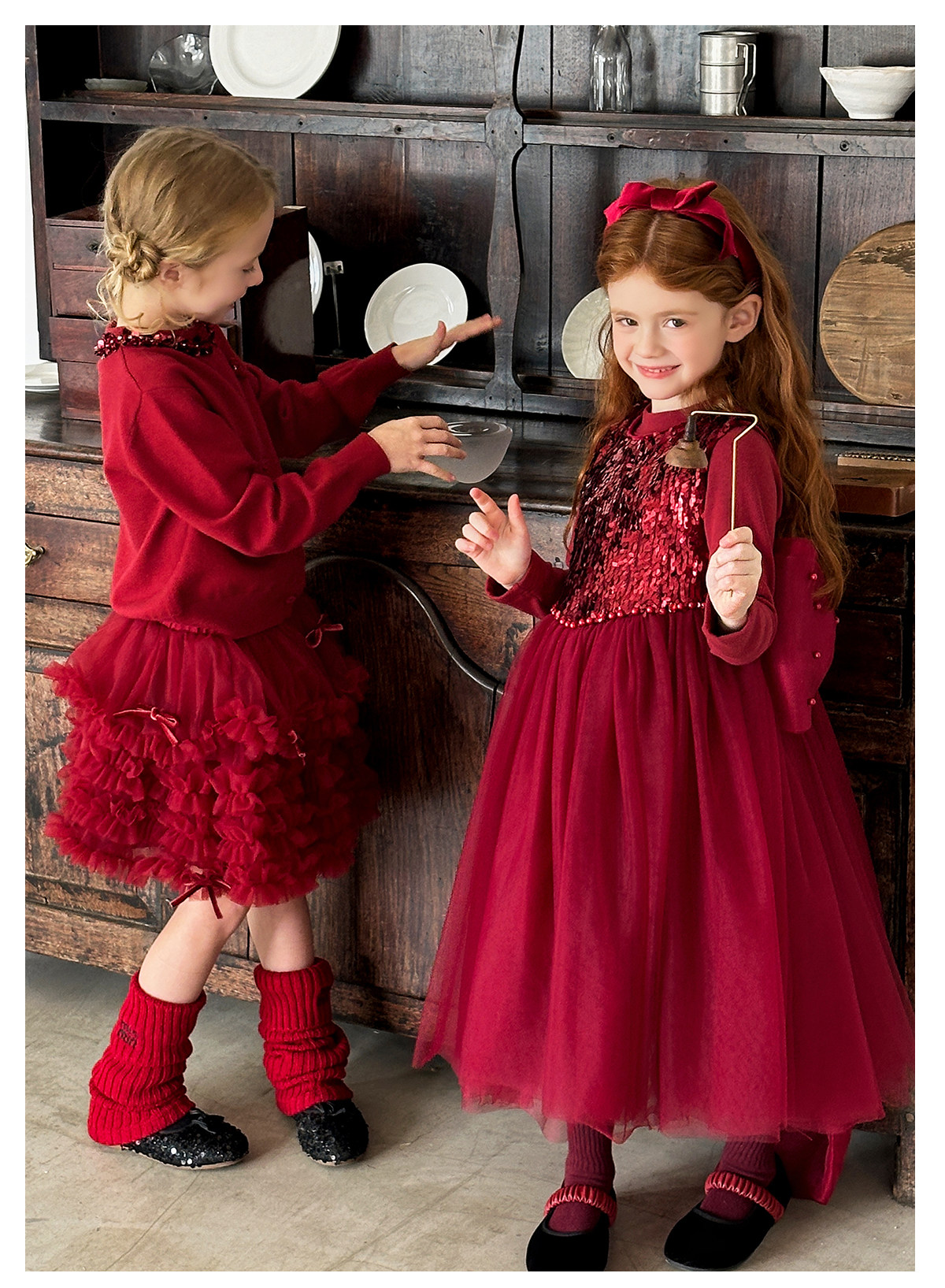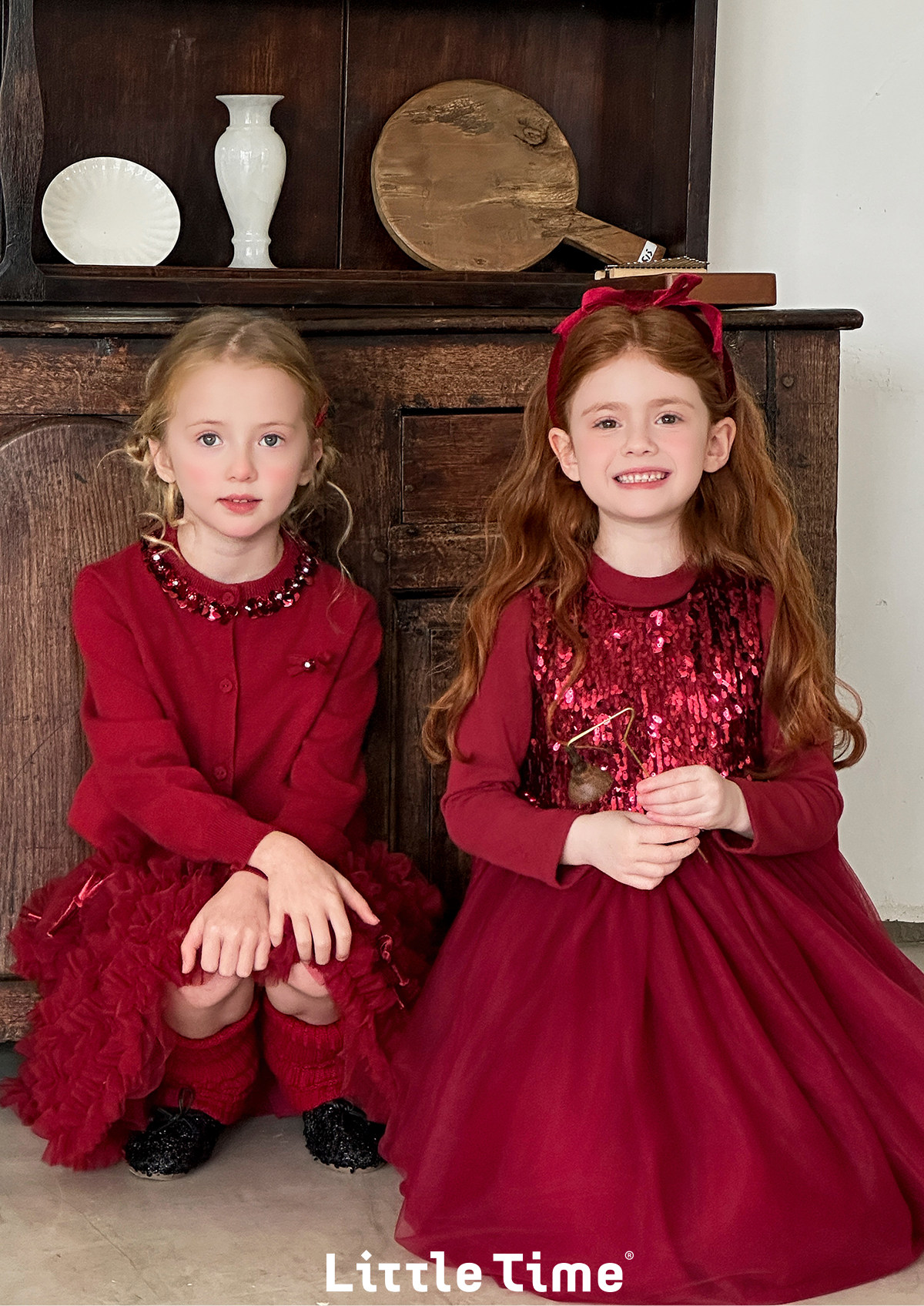 littletime女童红色亮片领针织开衫蓬蓬裙套装儿童演出服拜年服