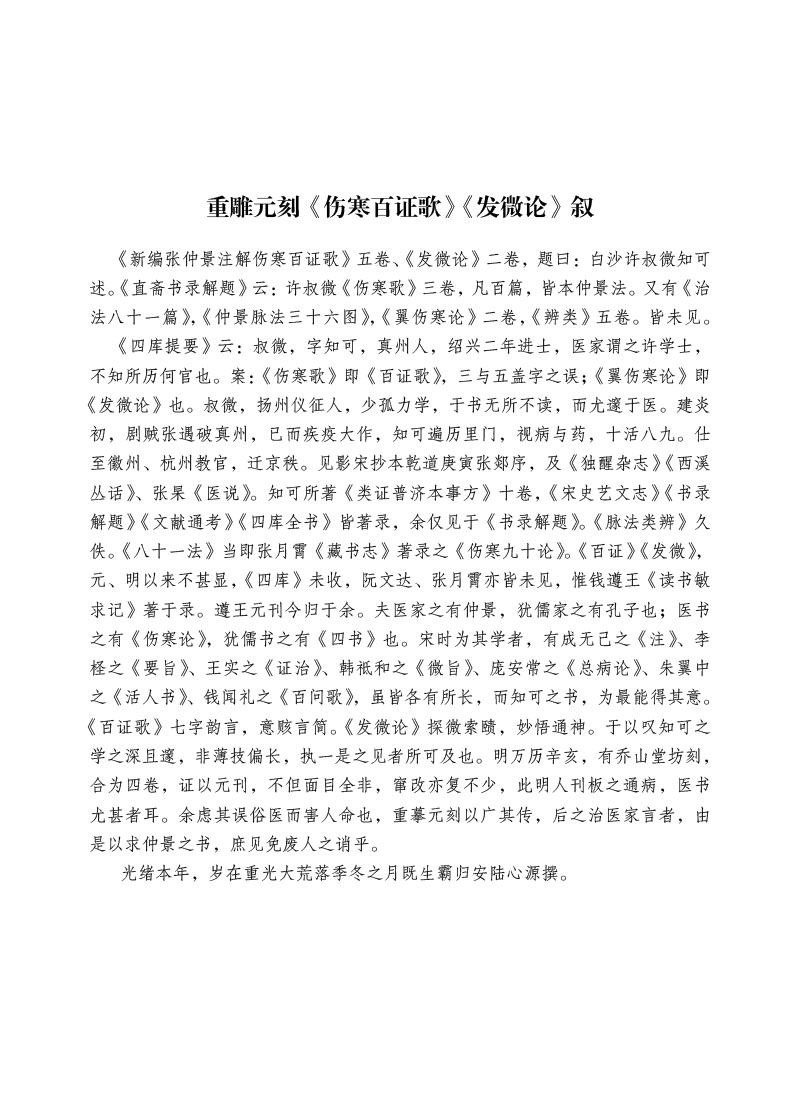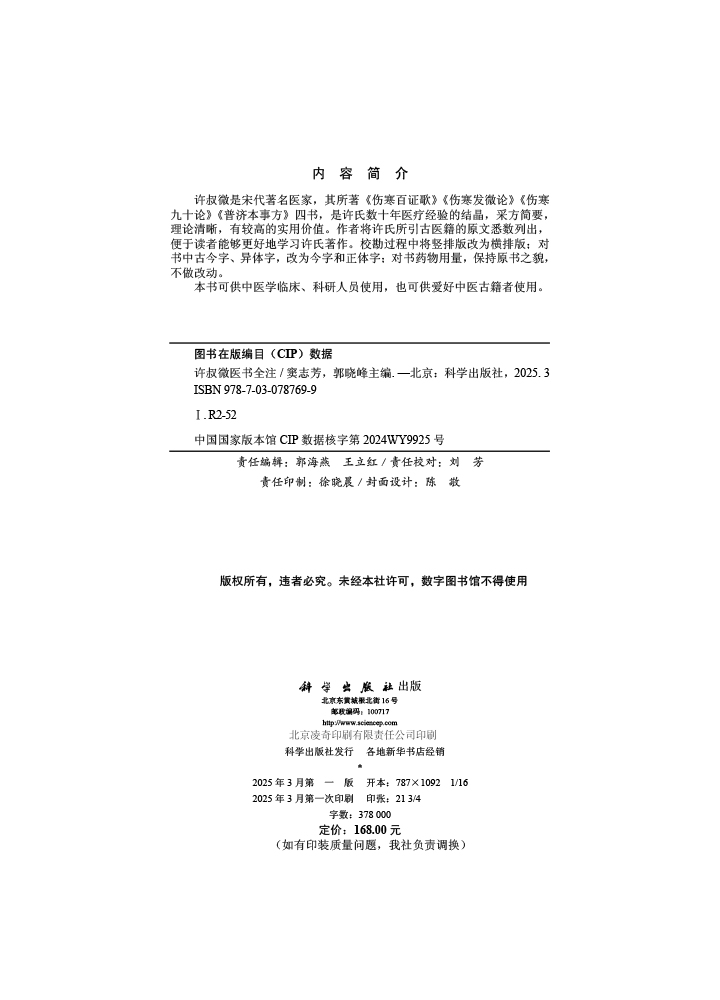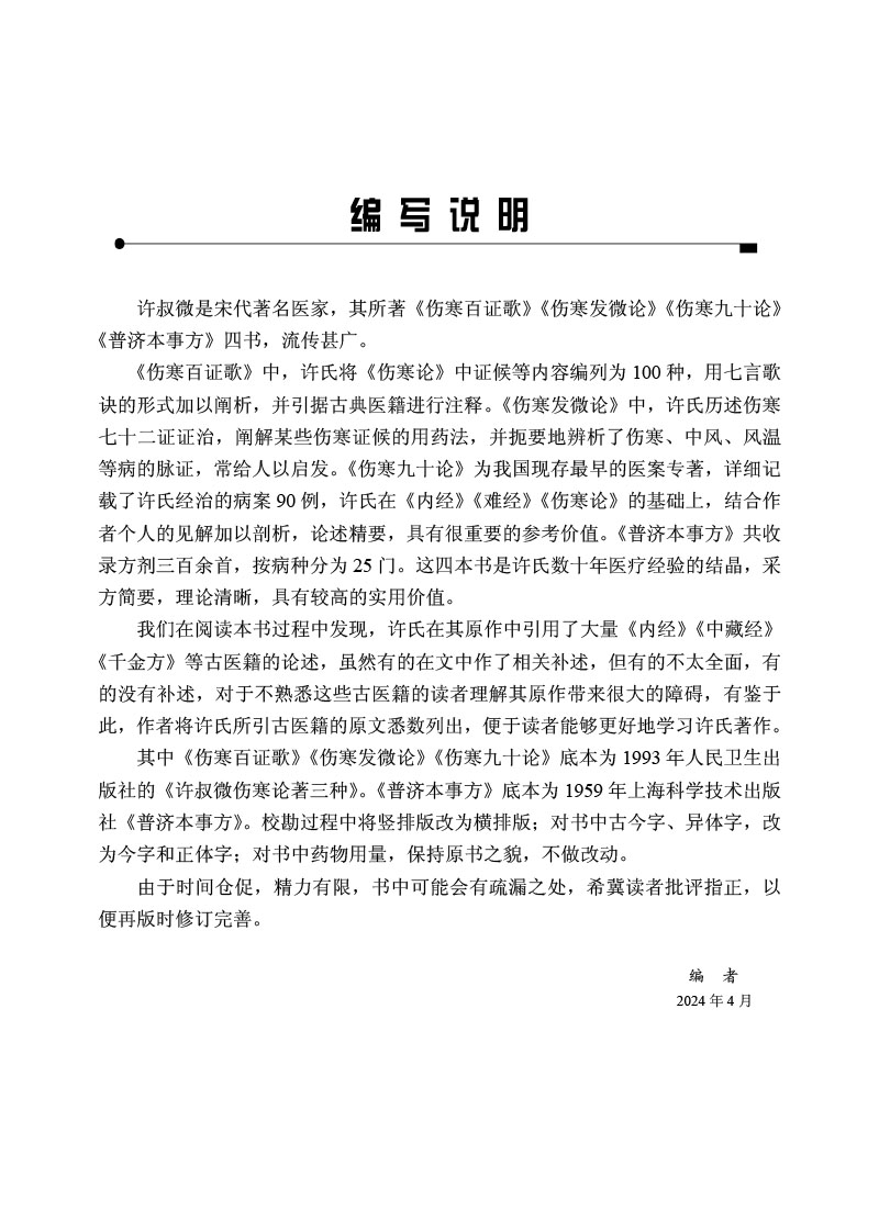 许叔微是宋代著名医家,其所著《伤寒百证歌》《伤寒发微论》《伤寒九十论》《普济本事方》四书,是许氏数十年医疗经验的结晶,采方简要,理论清晰,有较高的实用价值。作者将许氏所引古医籍的原文悉数列出,便于读者能够更好地学习许氏著作。校勘过程中将竖排版改为横排版;对书中古今字、异体字,改为今字和正体字;对书药物用量,保持原书之貌,不做改动。