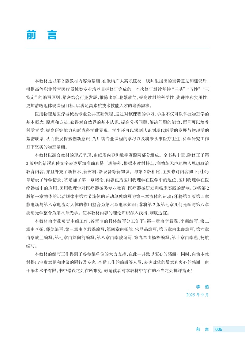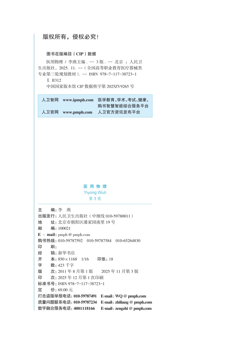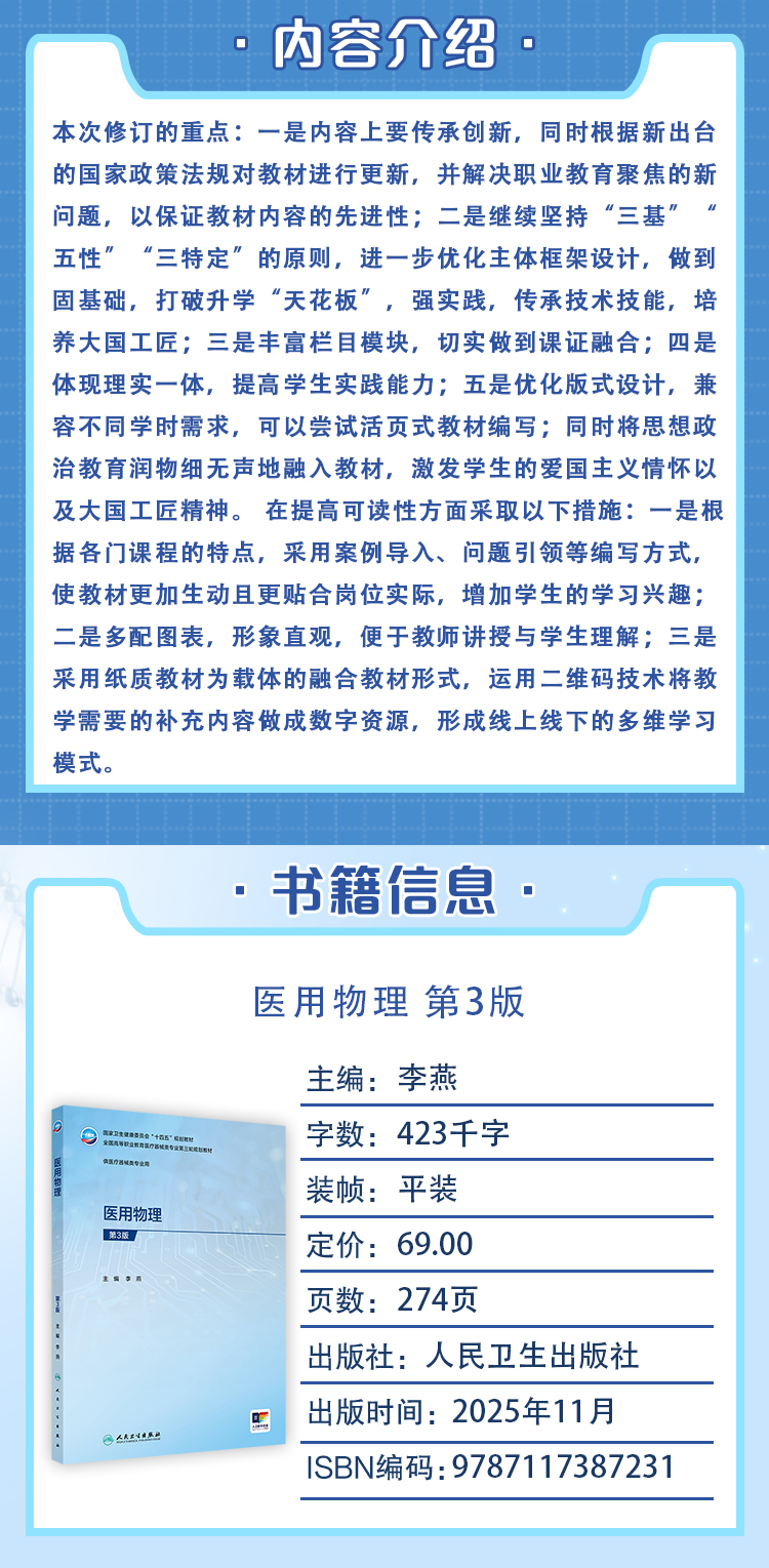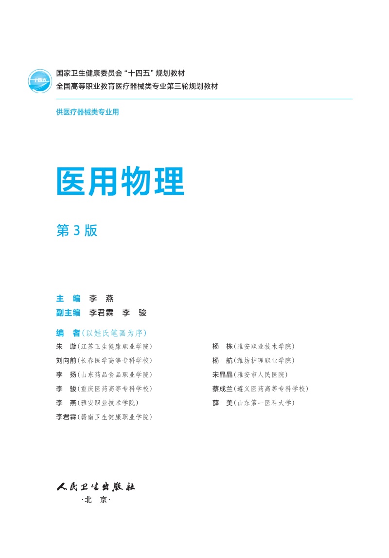 医用物理 第3三版 十四五规划教材 全国高等职业教育医疗器械类专业第三轮规划教材 李燕 主编 供医疗器械类专业用 人民卫生出版社
