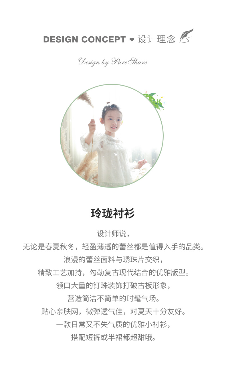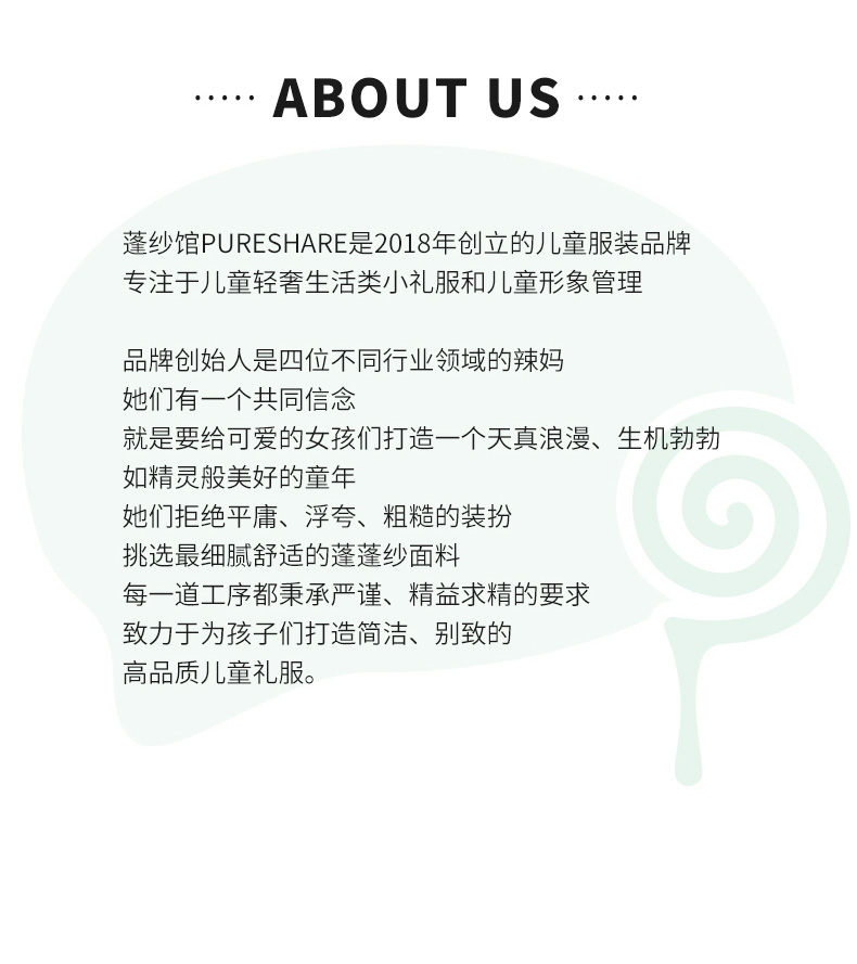 PureShare蓬纱馆,2018年创立的儿童服装品牌,专注于儿童轻奢生活类小礼服,主张“让孩子做最独特的自己”的品牌理念,为孩子们提供时尚简洁、优雅而又不失童真的生活类礼服。