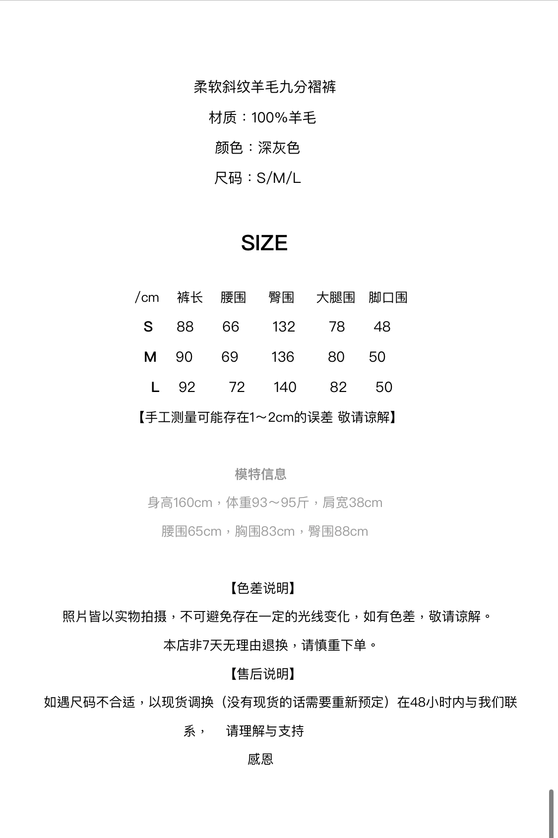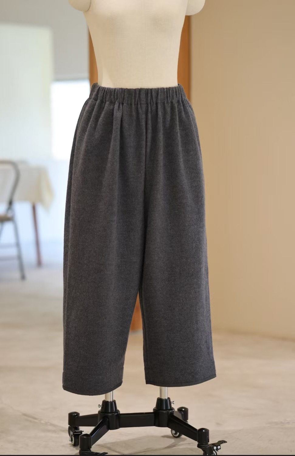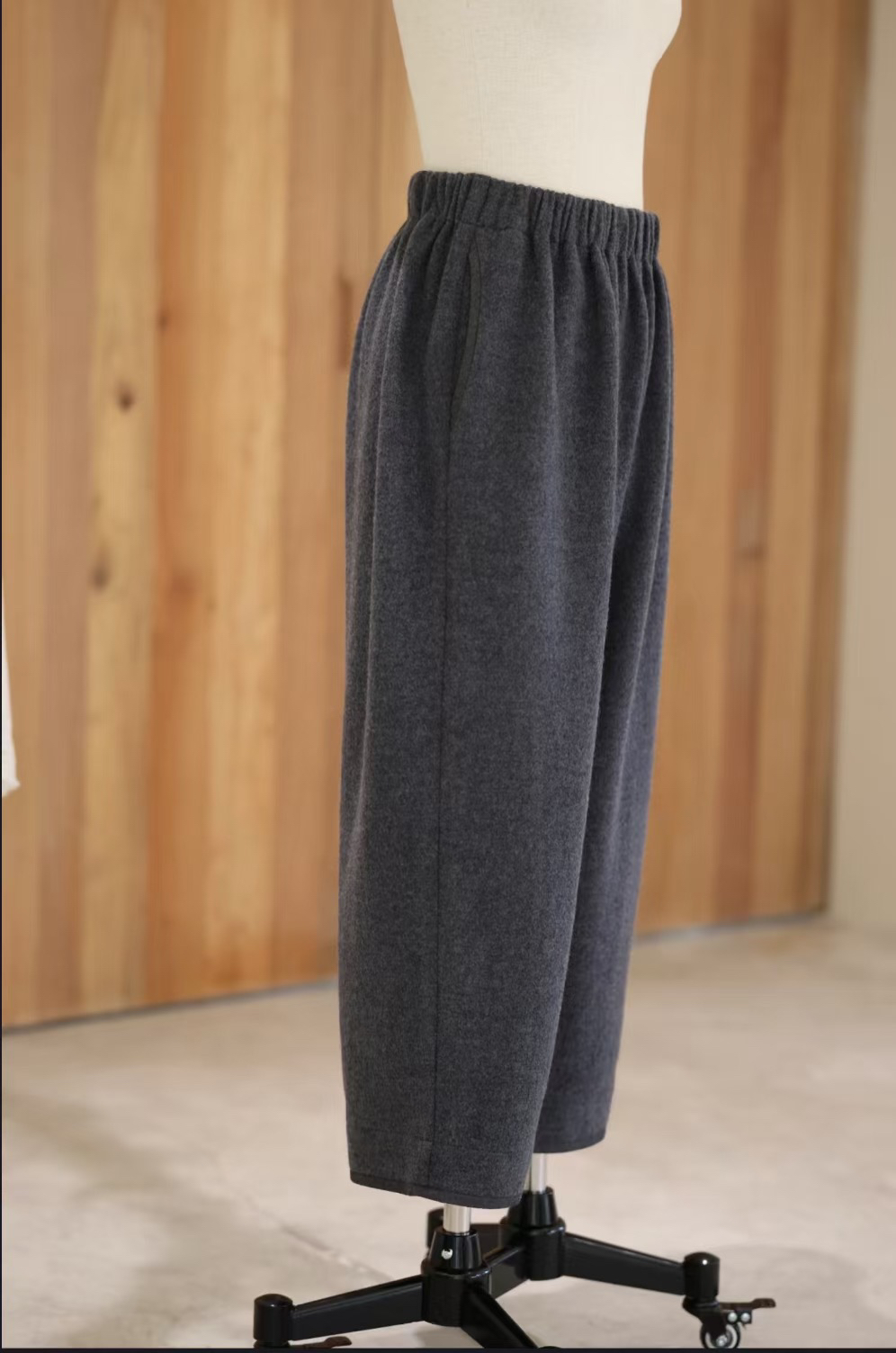 腰部臀部褶量丰富,脚口柔软有型。仅侧口袋。