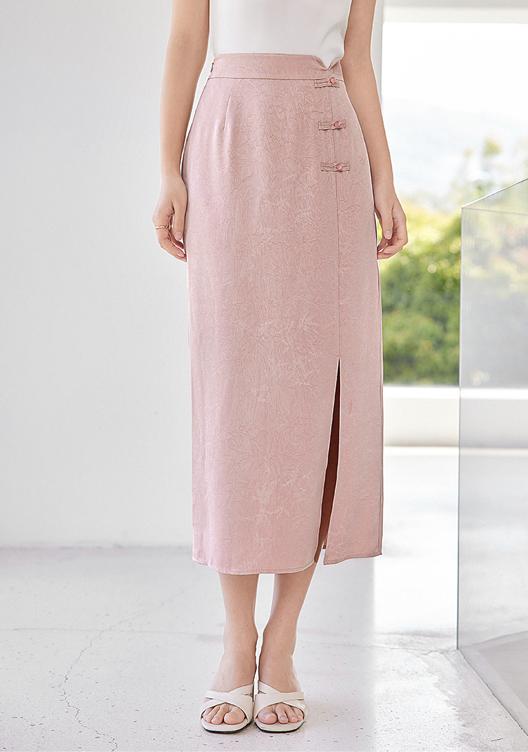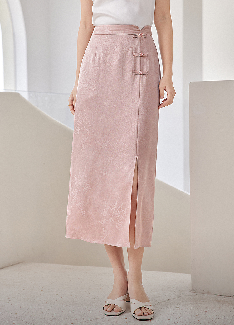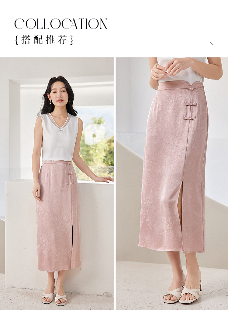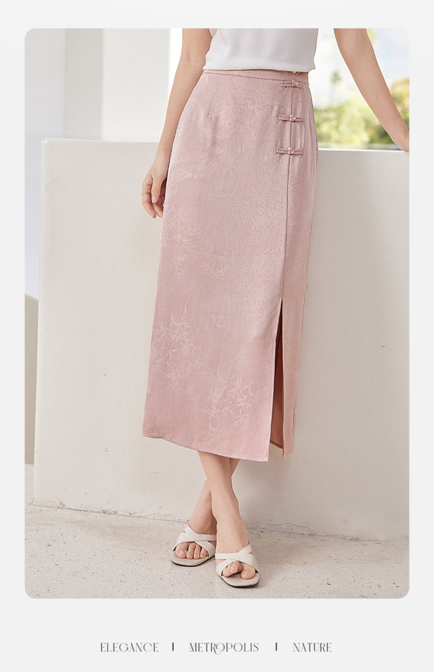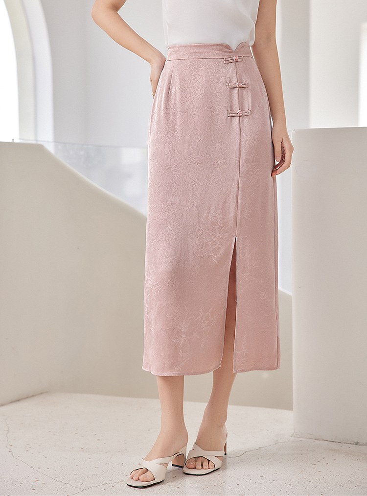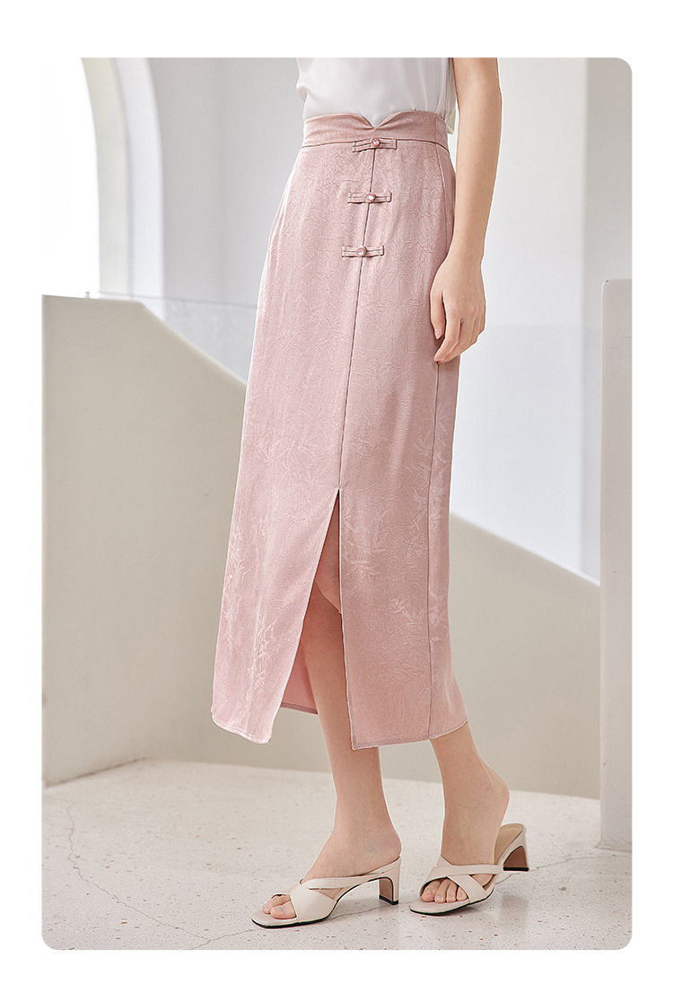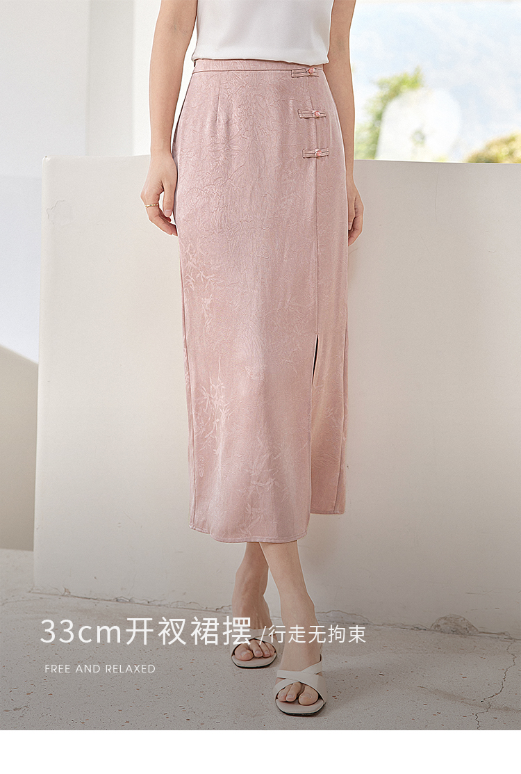 【专属特价】熙世界粉色新中式半身裙夏季2025新款国风提花开叉直筒包臀长裙