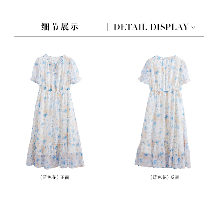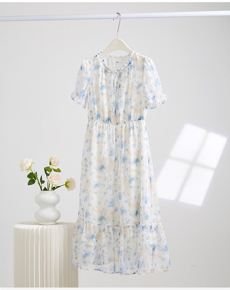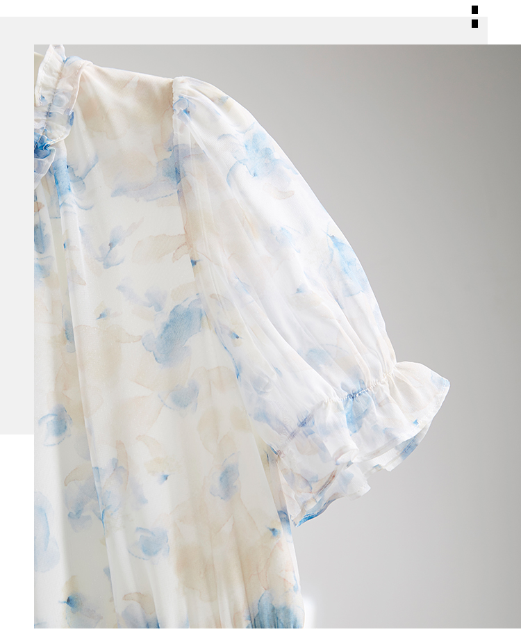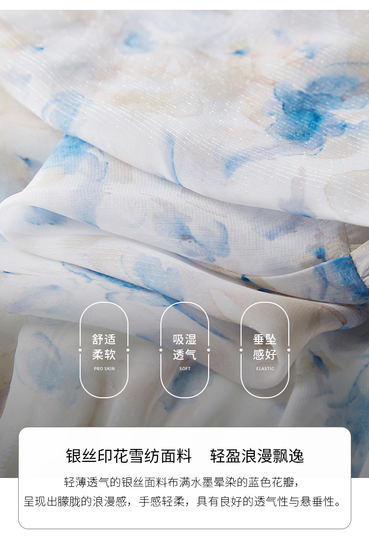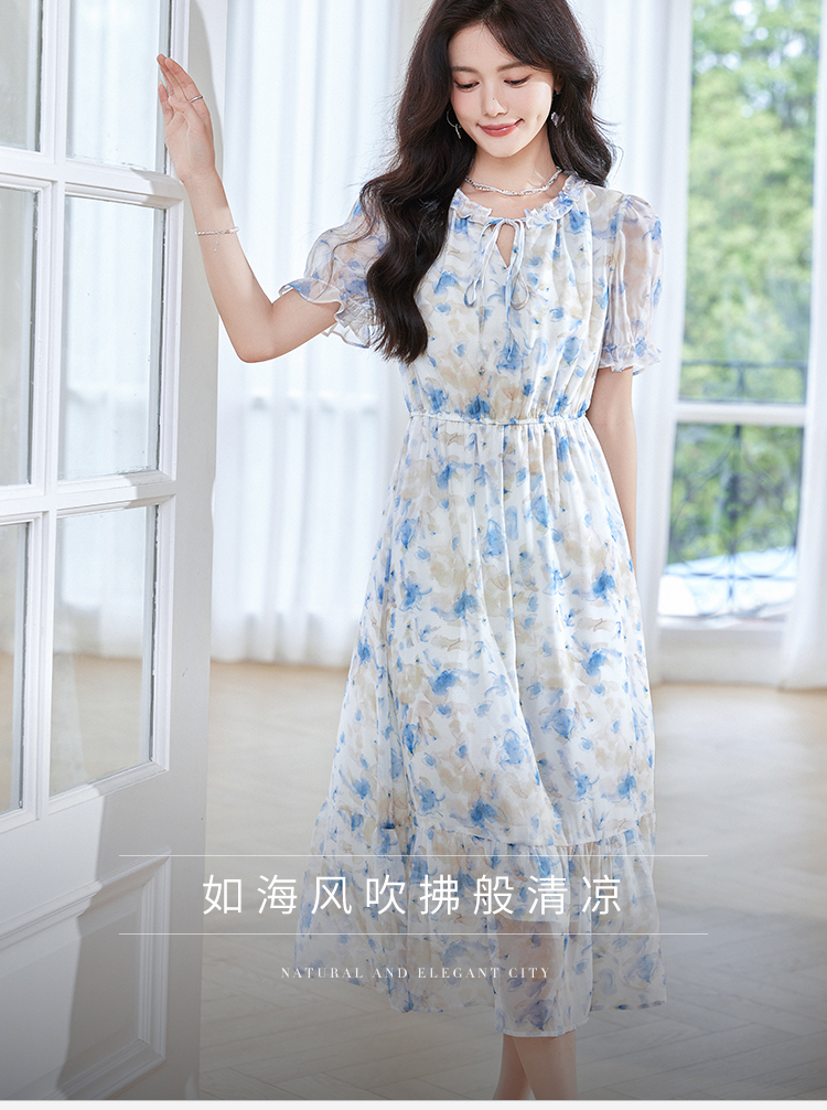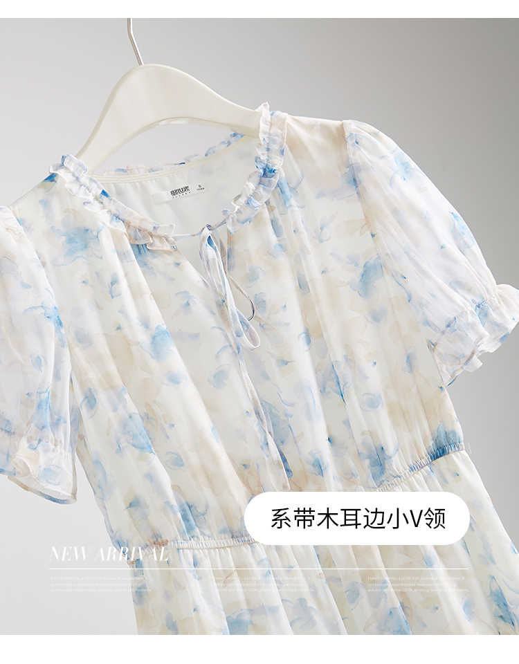 【专属特价】熙世界蓝色碎花雪纺连衣裙女2024夏季温柔风甜美气质别致漂亮裙子