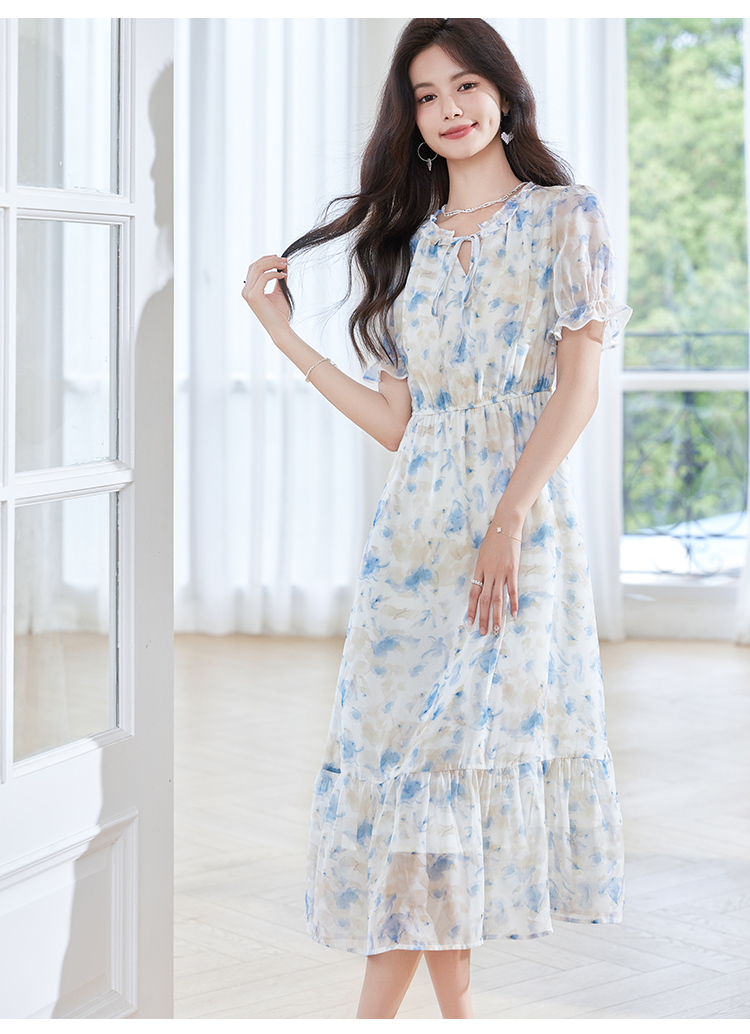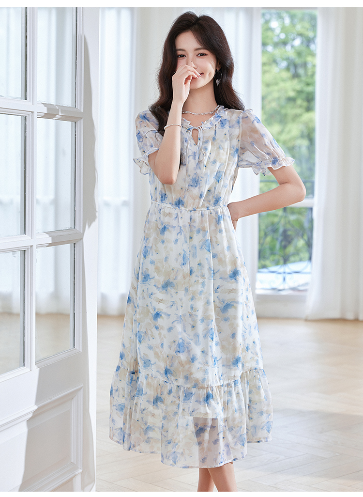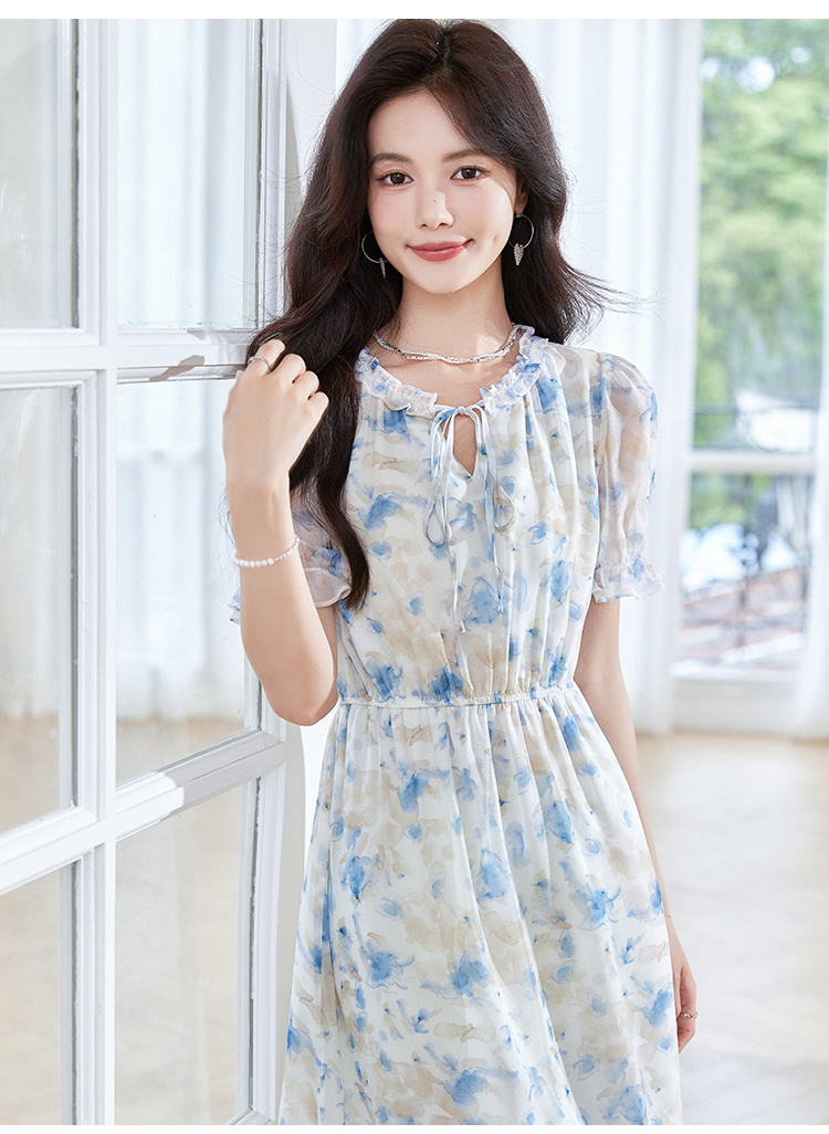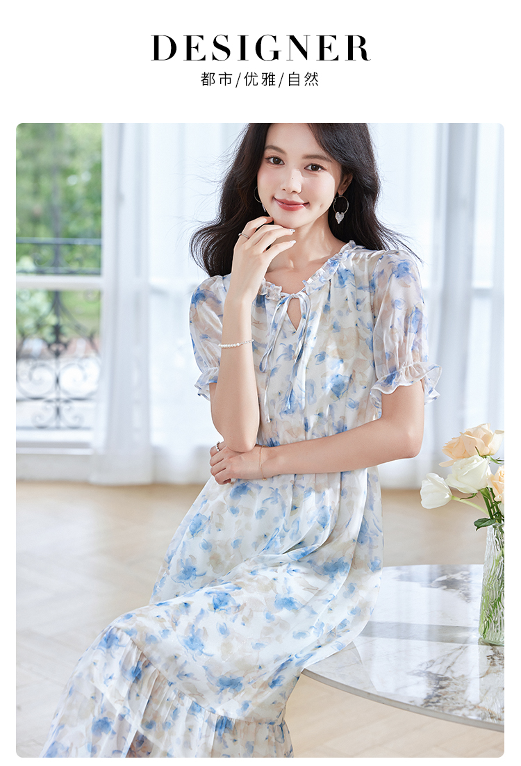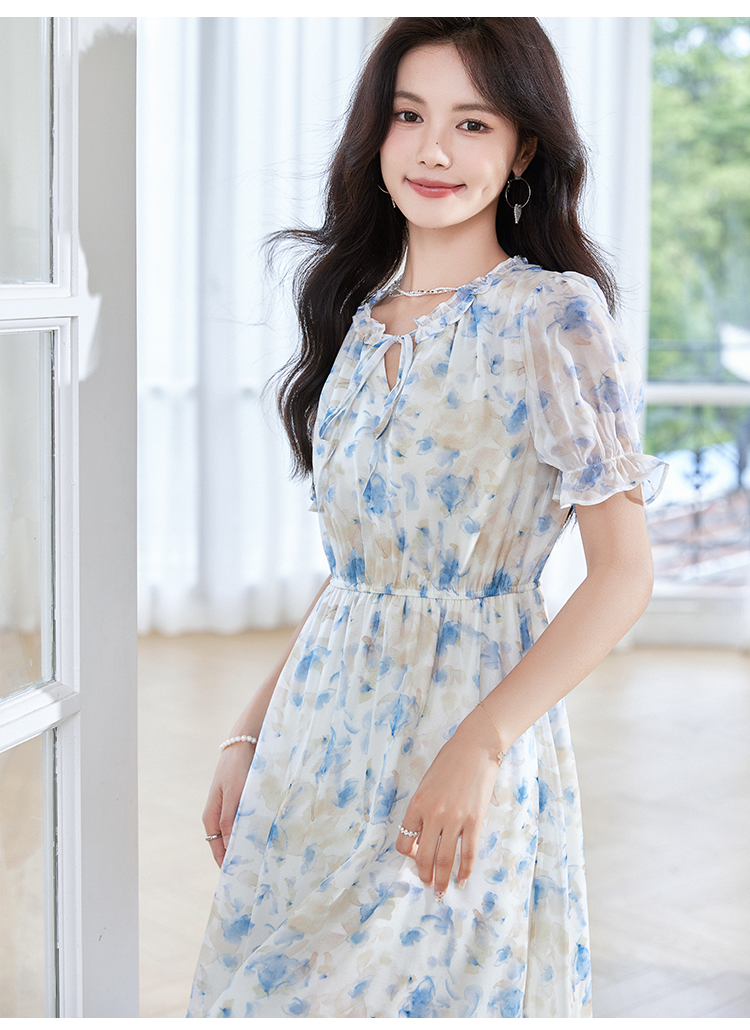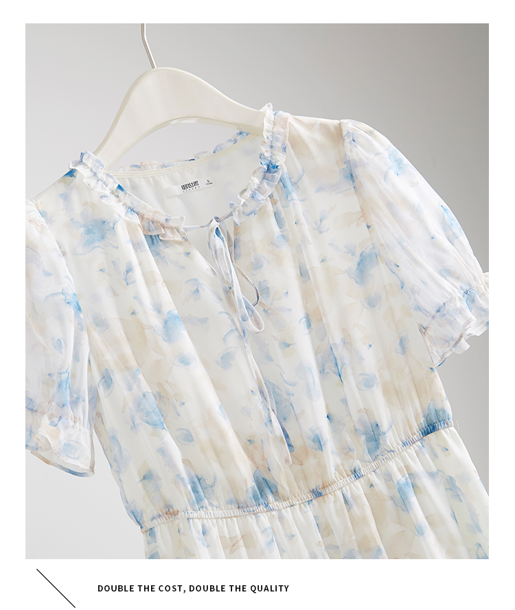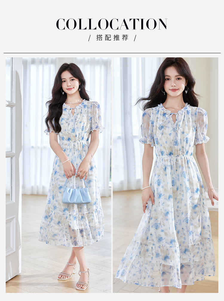 【专属特价】熙世界蓝色碎花雪纺连衣裙女2024夏季温柔风甜美气质别致漂亮裙子