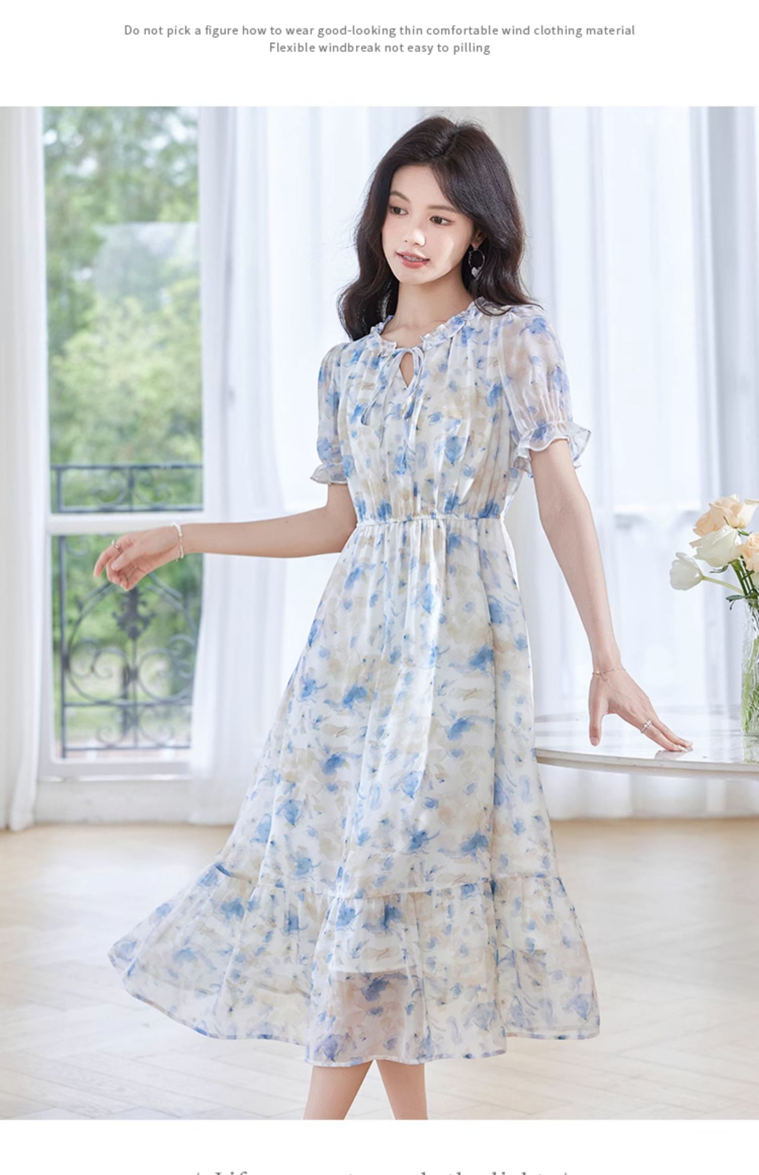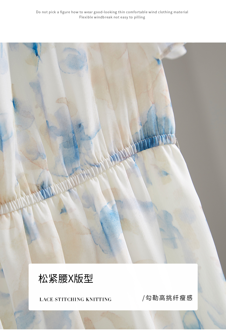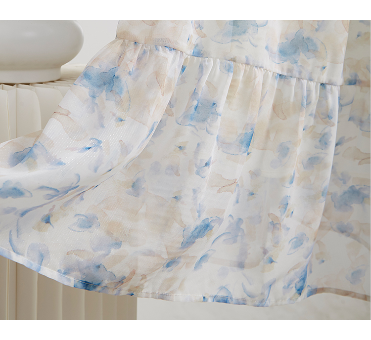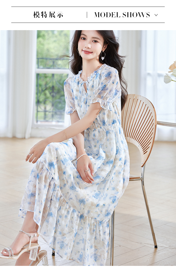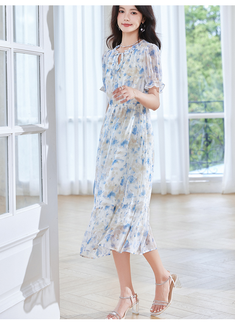 【专属特价】熙世界蓝色碎花雪纺连衣裙女2024夏季温柔风甜美气质别致漂亮裙子
