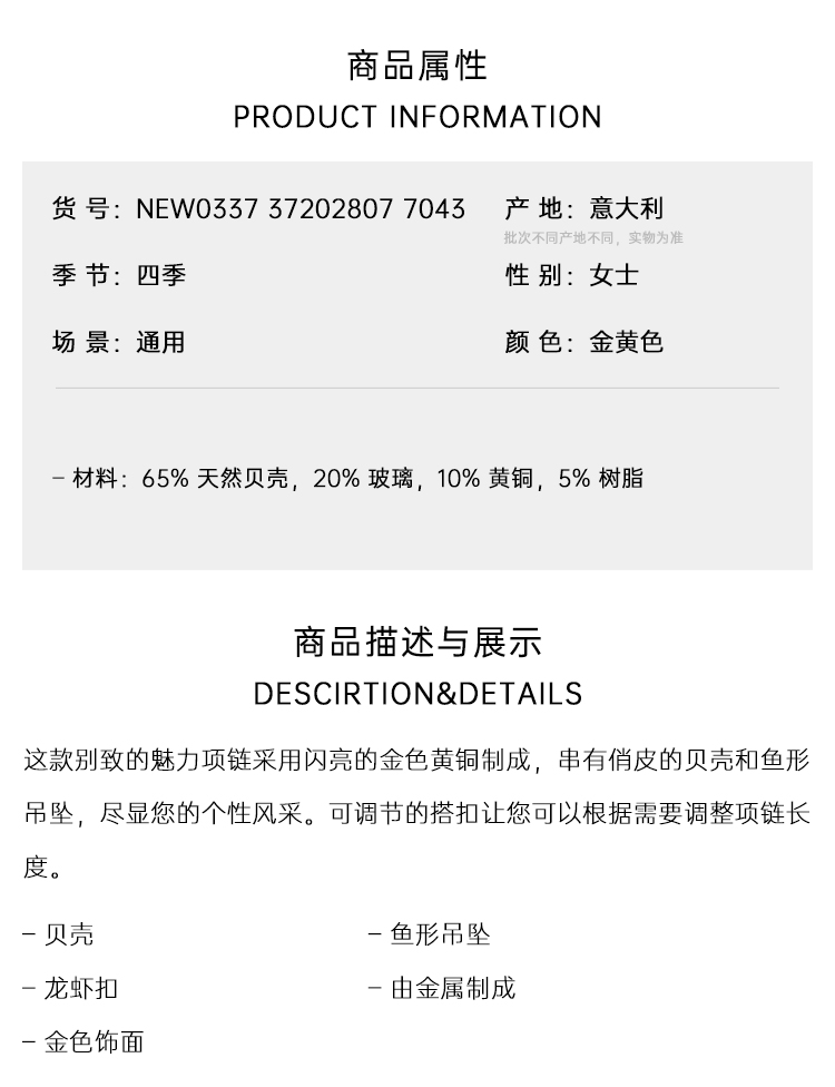 DSQUARED2 女士贝壳虾尾吊坠项链 金黄色 NEW0337 37202807 7043