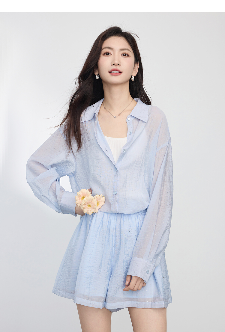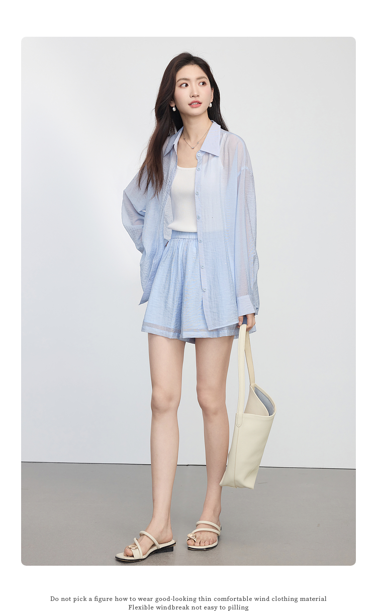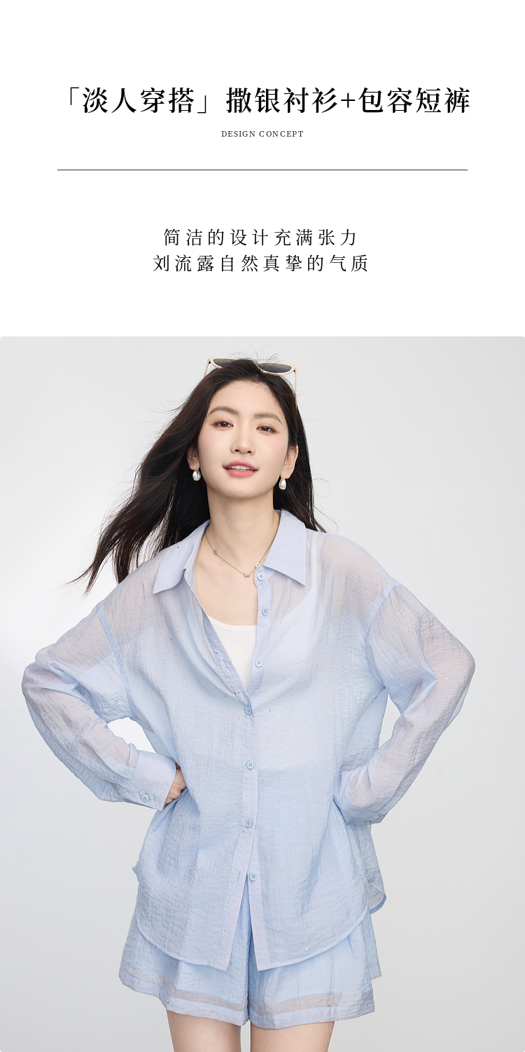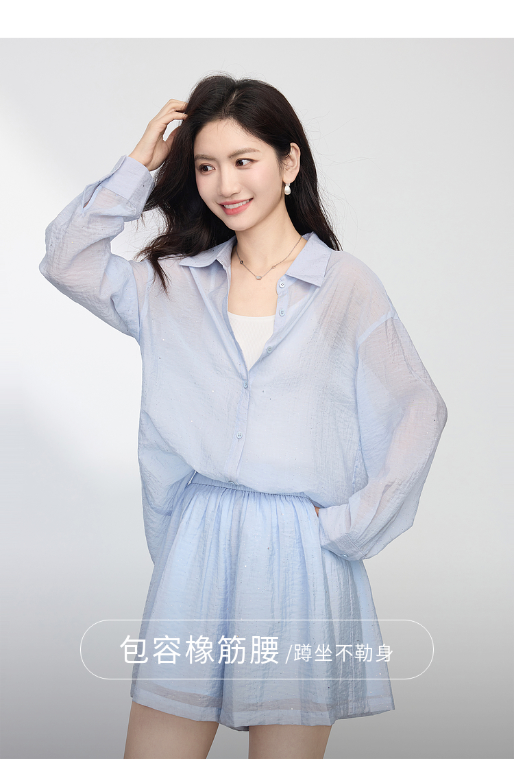 【专属特价】熙世界淡人穿搭防晒衬衫套装夏日女装宽松减龄休闲衬衣短裤两件套