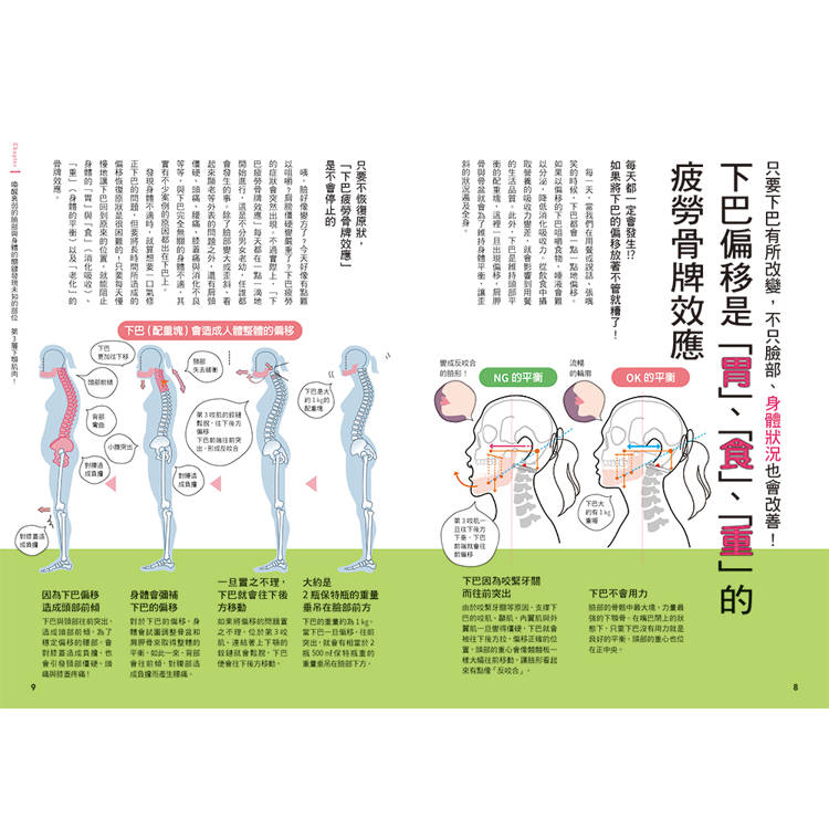 另外,因為新冠肺炎的關係,戴口罩已經成為日常生活中的一部分,其實幾乎沒有人注意到,隱藏在口罩底下的下巴正逐漸變得越來越歪、越來越往下這件事,而下巴偏移是「胃」、「食」、「重」的疲勞骨牌效應,會引起許多健康方面的問題,不可輕忽!