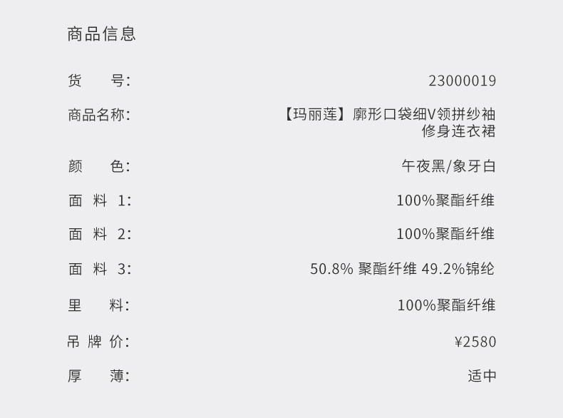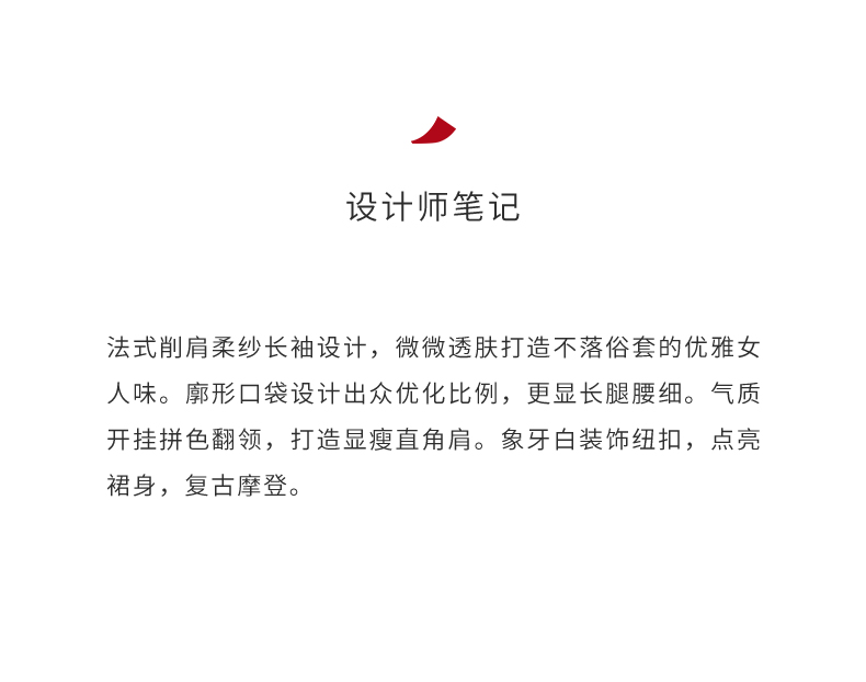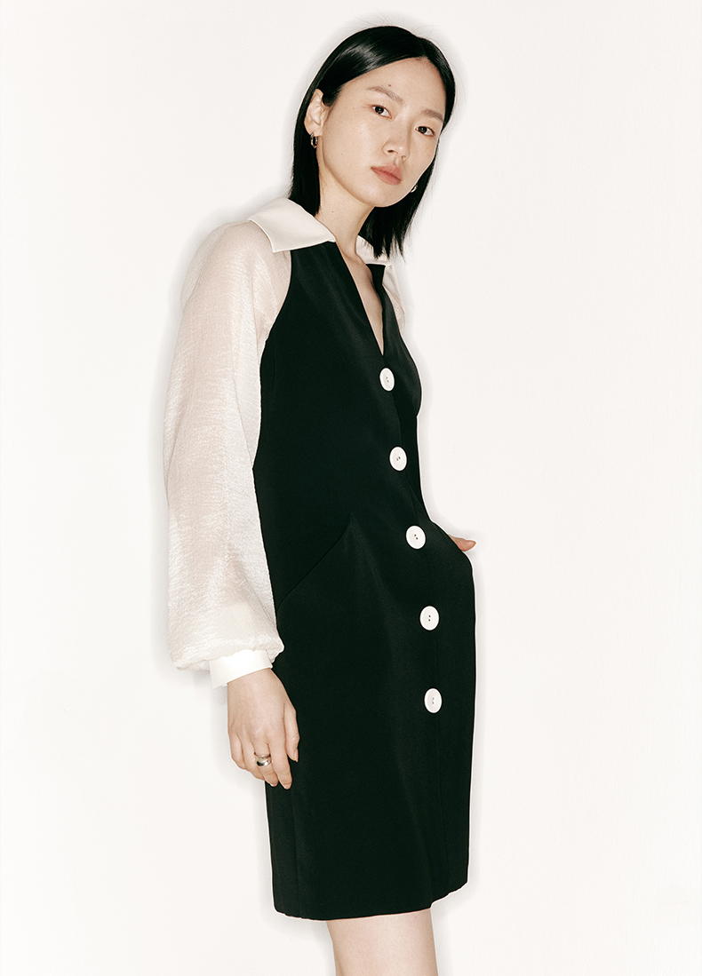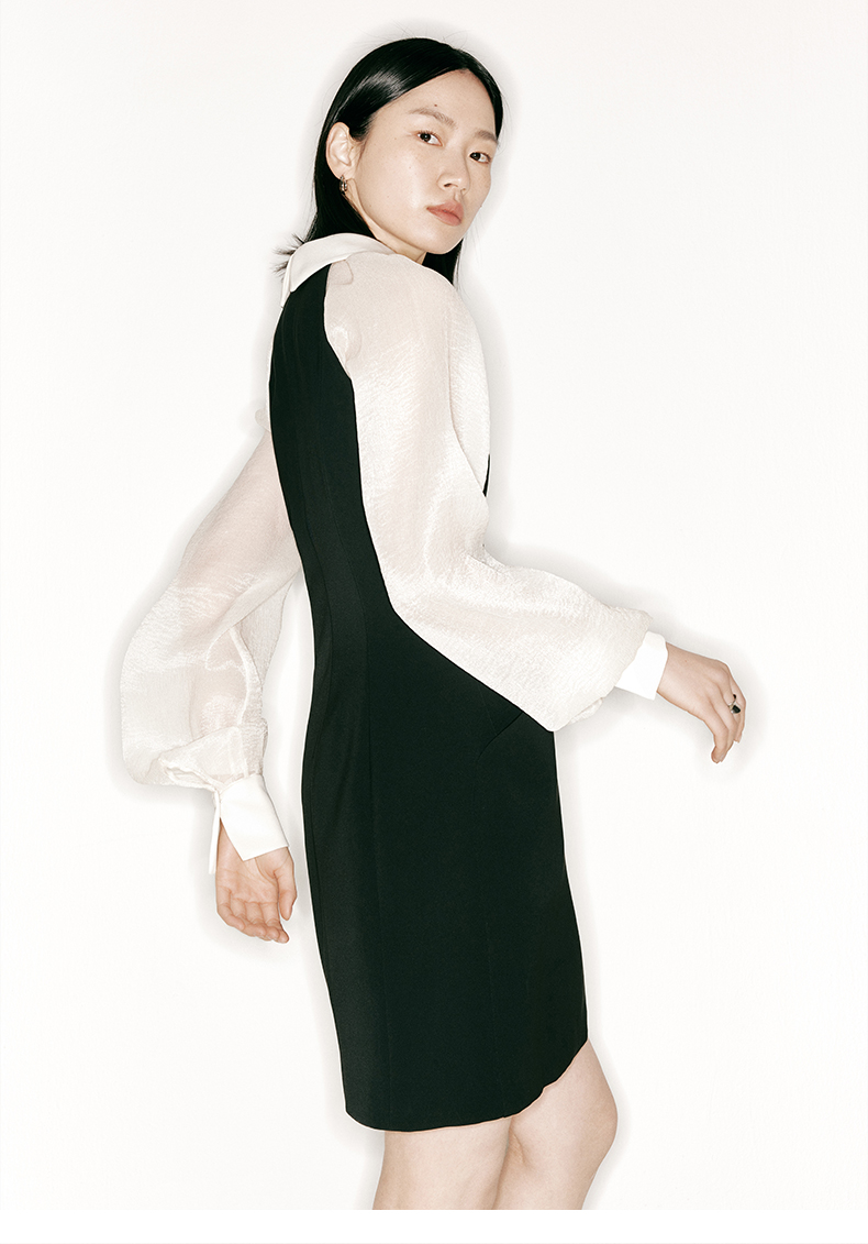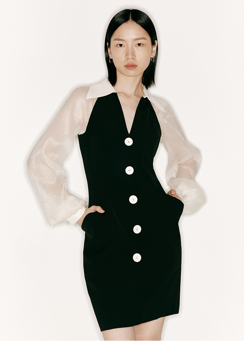 【玛丽莲】廓形口袋细V领拼纱袖修身连衣裙/23000019