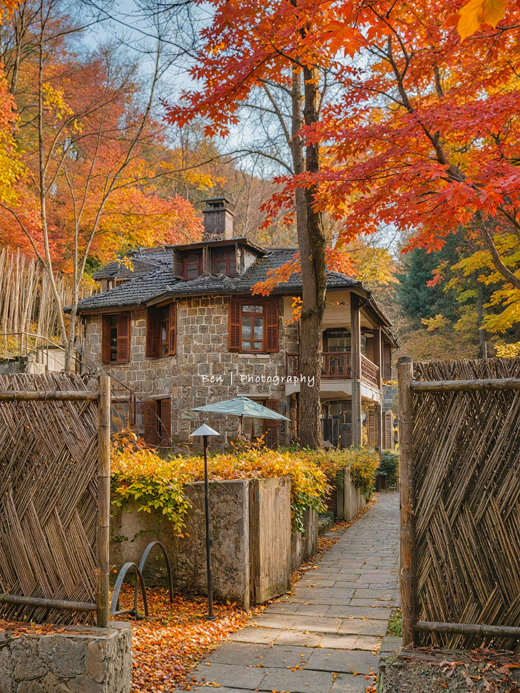 金黄的银杏与赤红的枫叶,交织成绚烂的锦缎点缀着起伏的山峦。阳光透过疏落的枝叶,在蜿蜒的石板小径上投下斑驳的光影,仿佛碎金洒落。