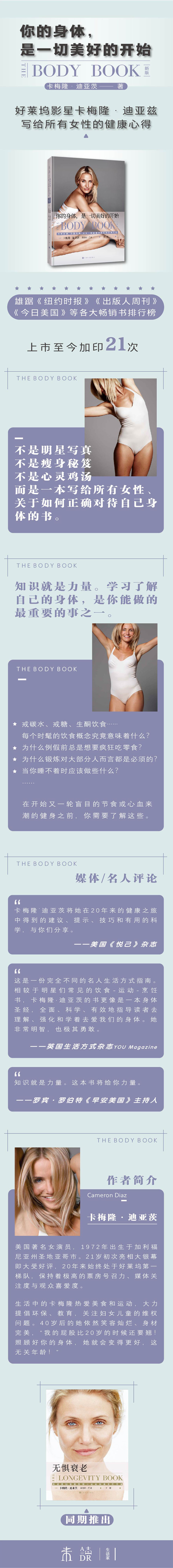 ★雄踞《纽约时报》《出版人周刊》《今日美国》等各大畅销书排行榜,美国亚马逊高分图书,自出版以来持续热卖,好评不断! ★好莱坞影星、美腿女神卡梅隆˙迪亚茨无私分享美丽秘诀,变健康永远比变瘦更重要! ★不是明星写真,不是瘦身秘笈,不是心灵鸡汤,而是一本写给所有女性、关于如何正确对待自己身体的书。 ★营养、健身、心理、医学多个领域专家为本书的专业性、科学性背书。