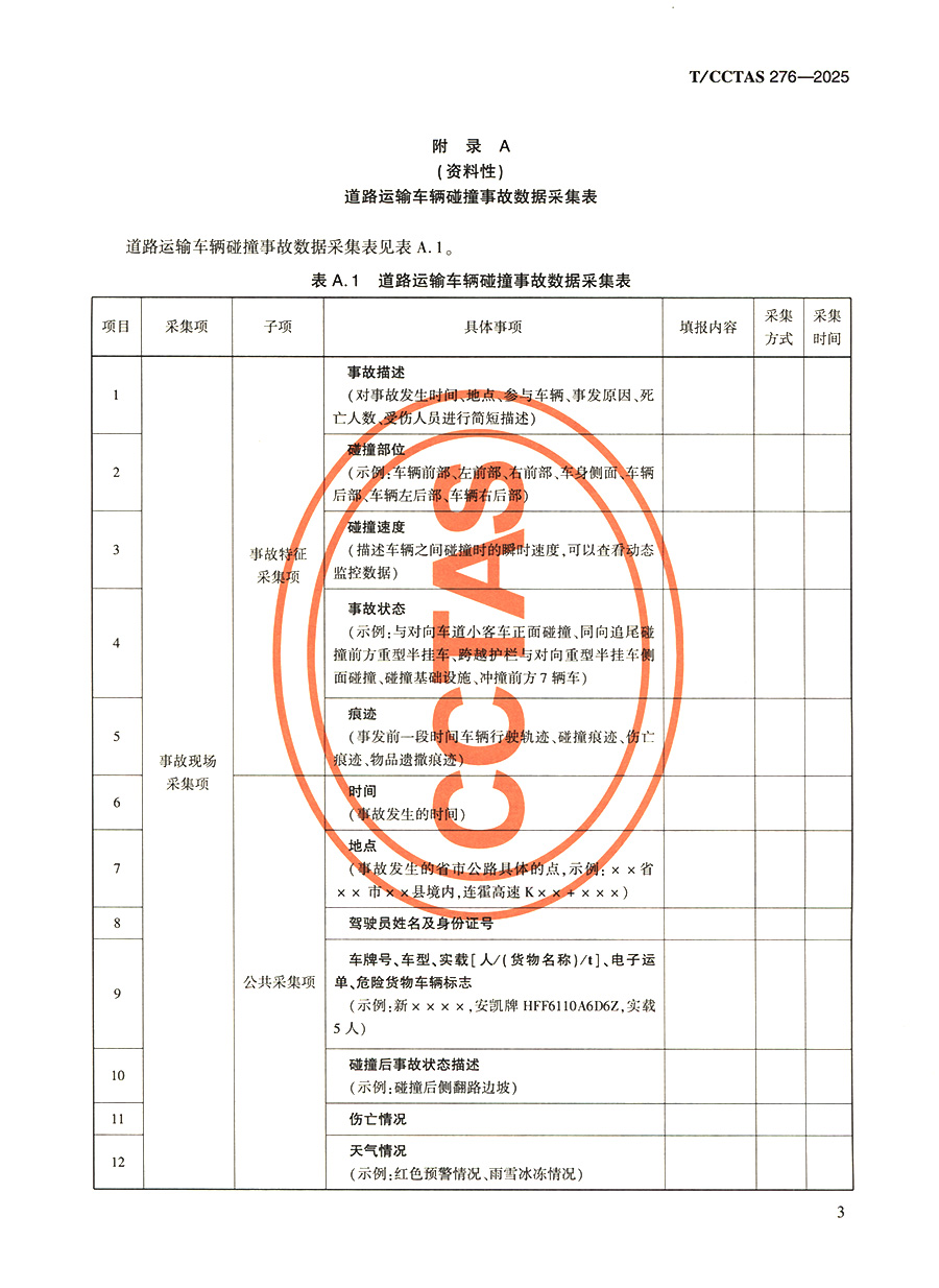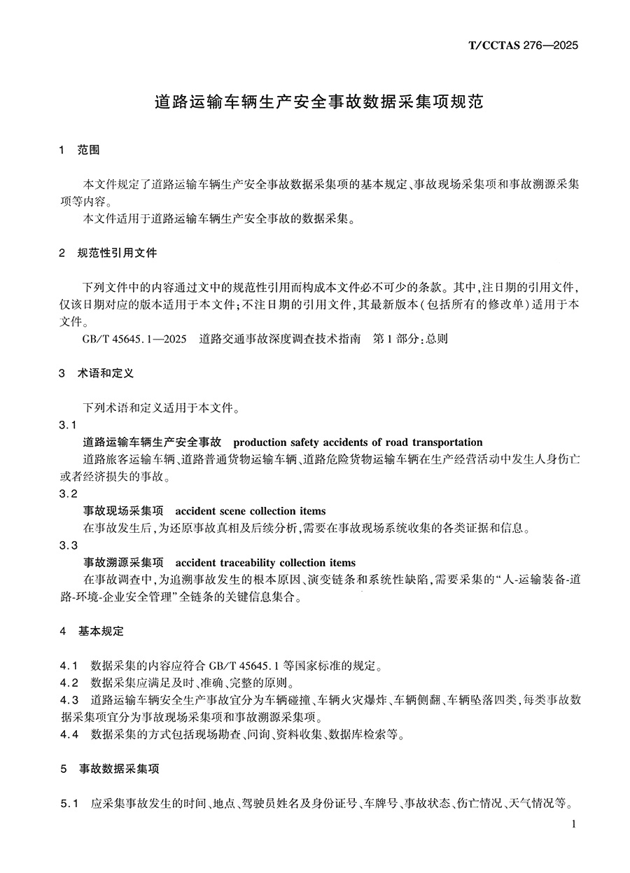 道路运输车辆生产安全事故数据采集项规范T/CCTAS 276—2025