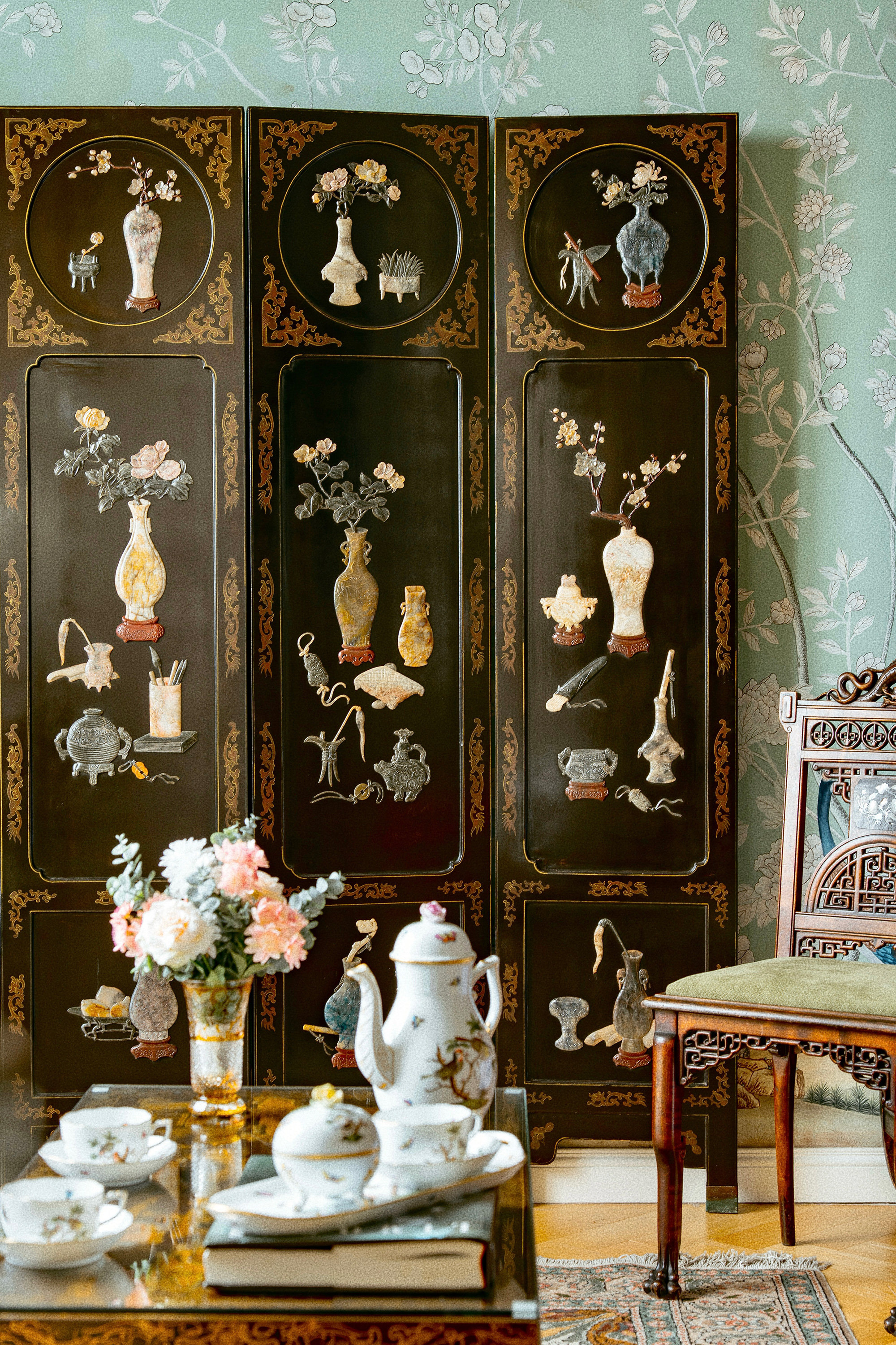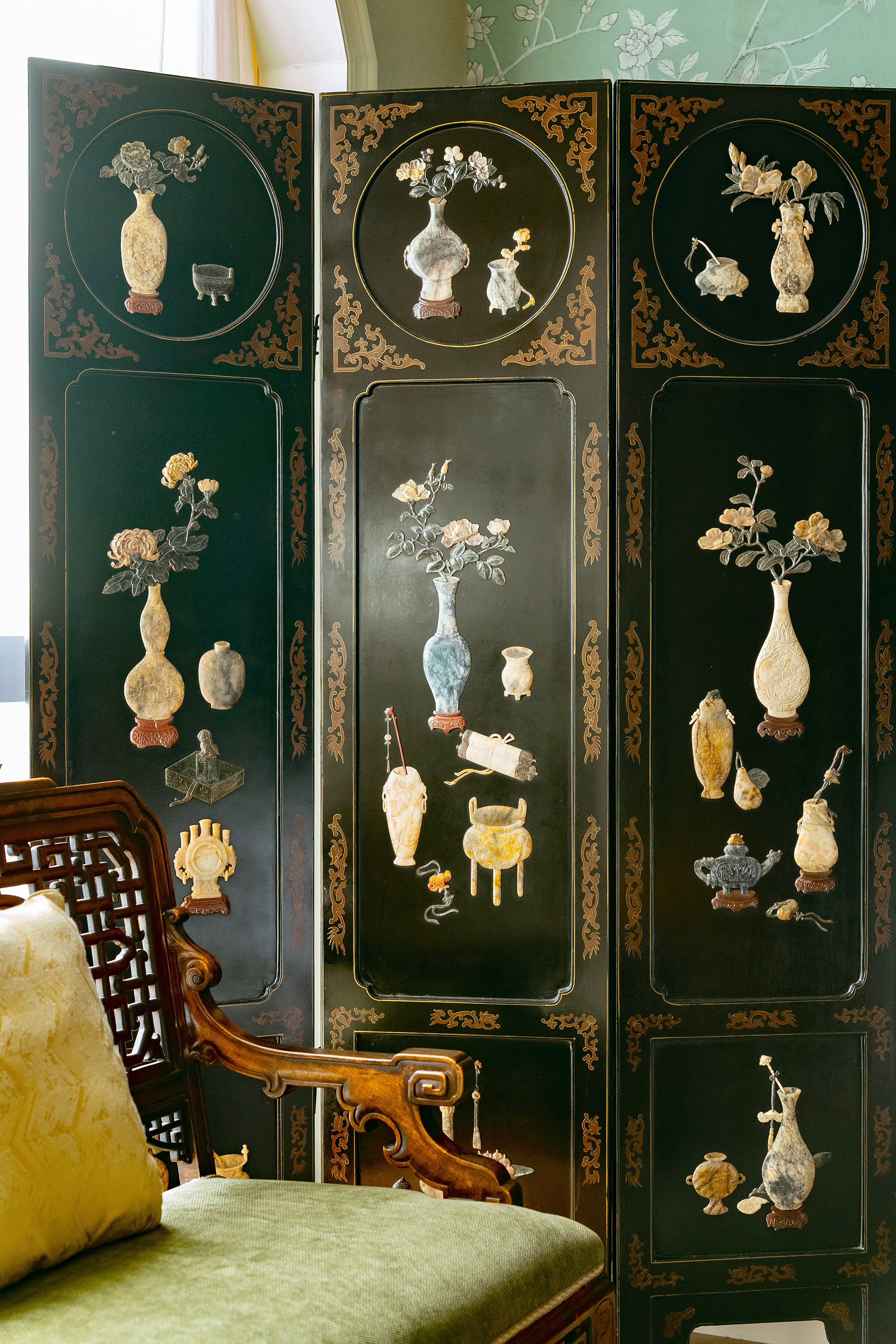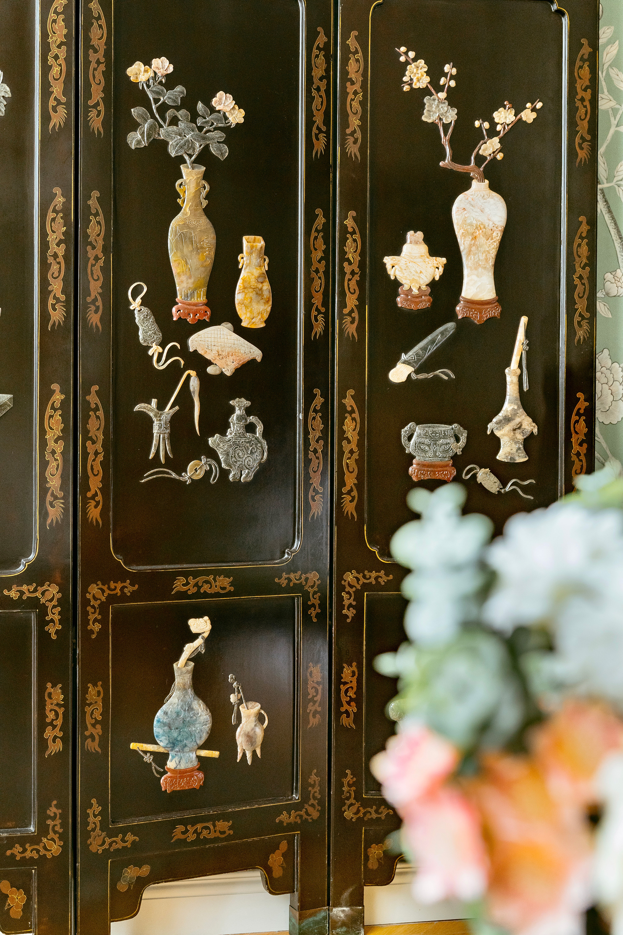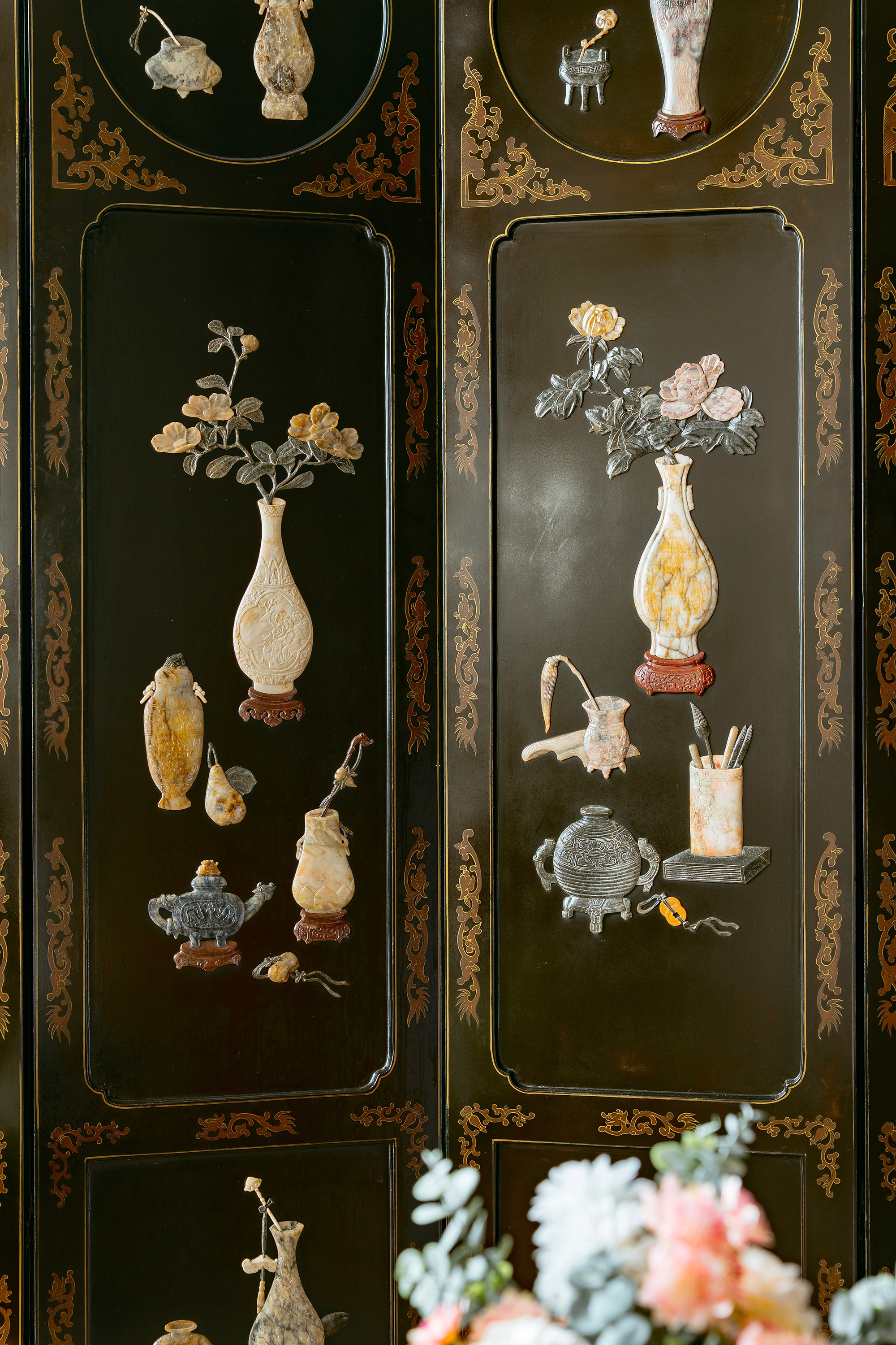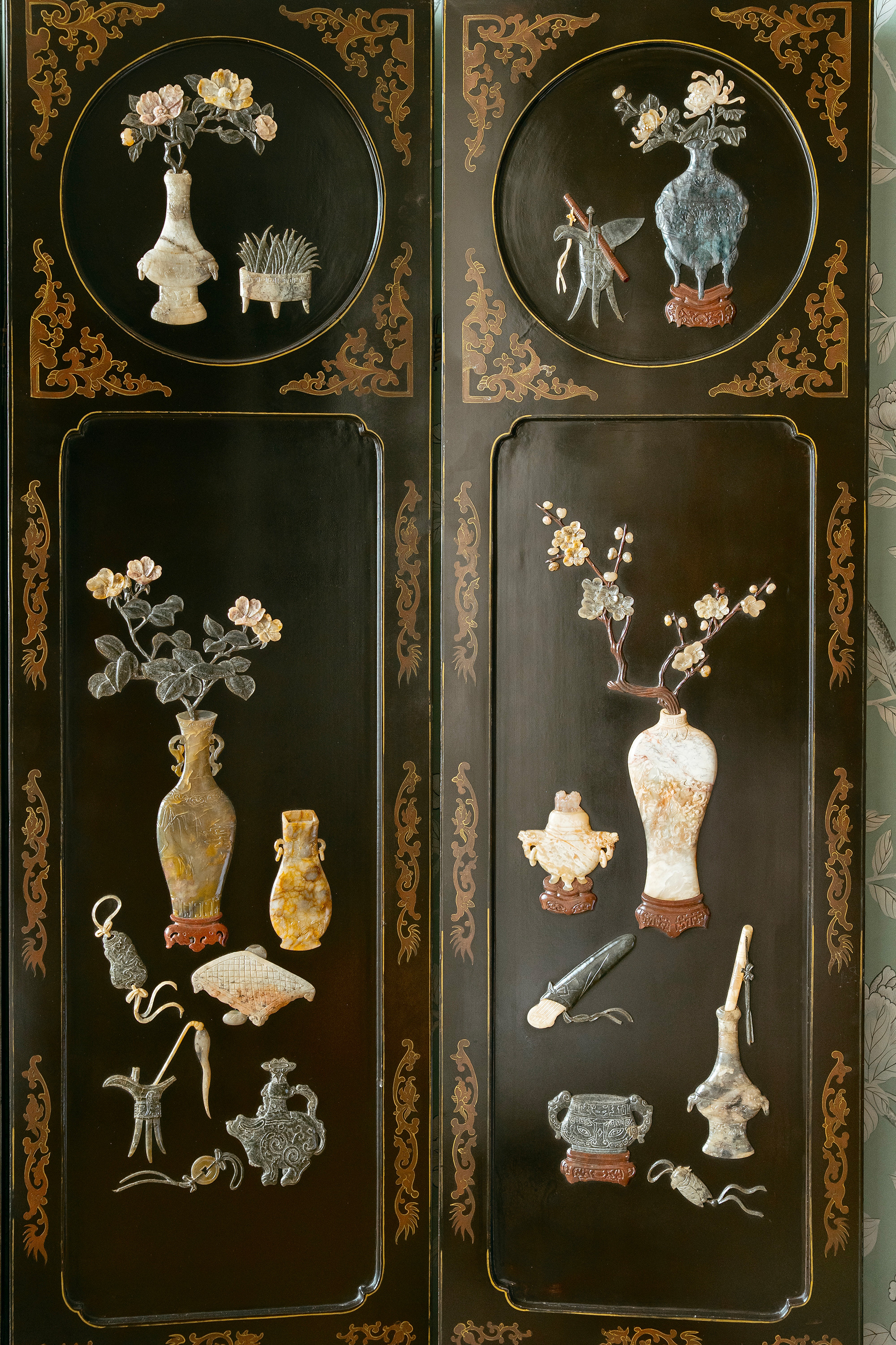 20世纪初期中国出品「清供博古」主题黑地漆木描金装饰硬石镶嵌双面六曲屏风