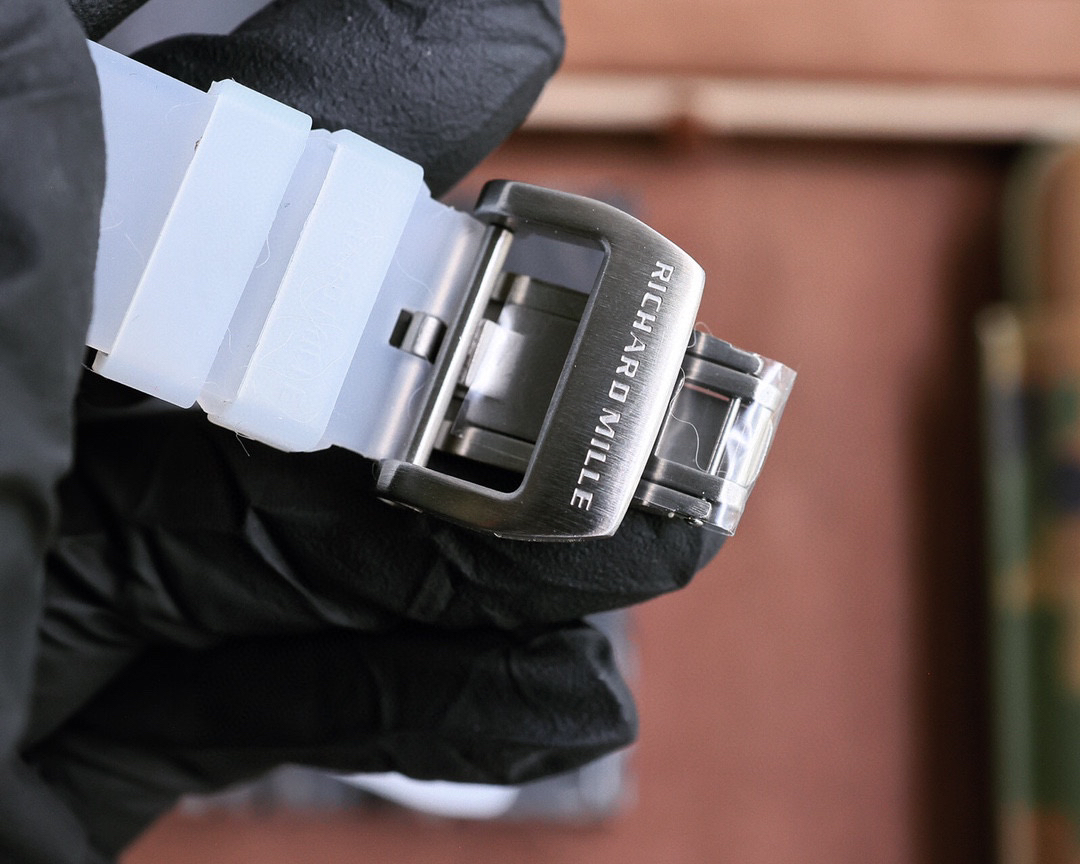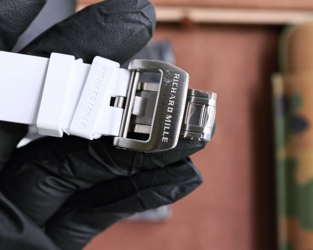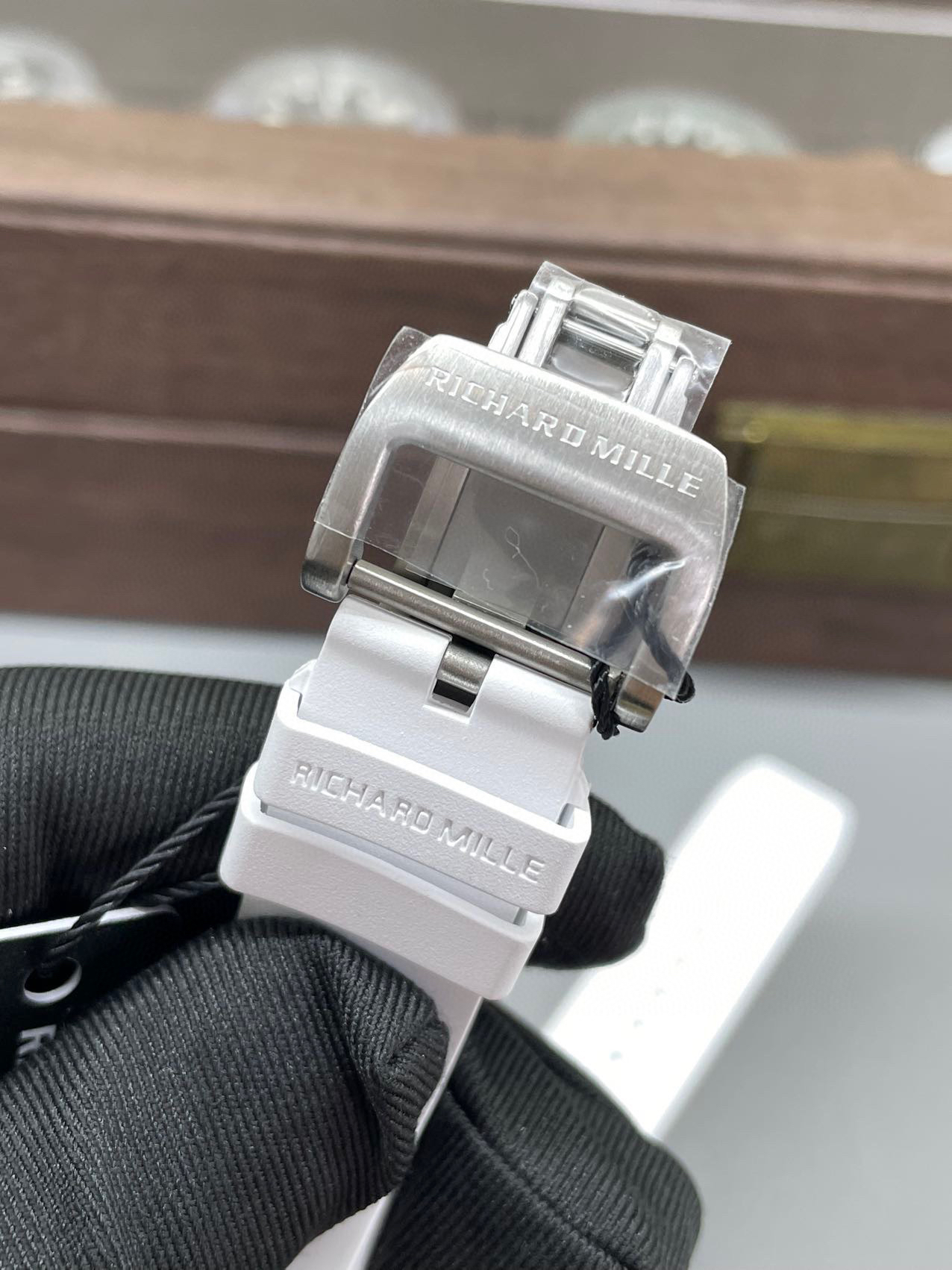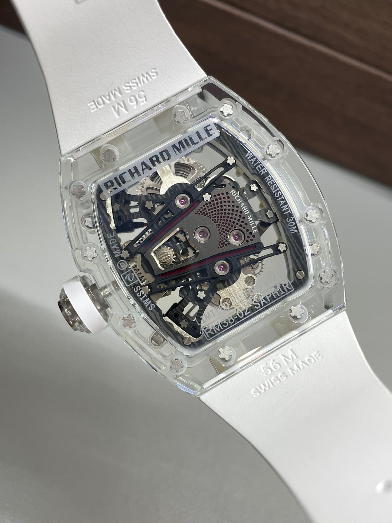 Equipped with RM 38-02 manual winding movement, swing frequency of 28800vph, providing 52 hours of power reserve. This movement is made of carbon fiber with a hollow bottom plate, which has excellent shock resistance. The bridge deck is still made of sturdy Grade 5 titanium material, and the small holes on the back are also decorated with pink elements.