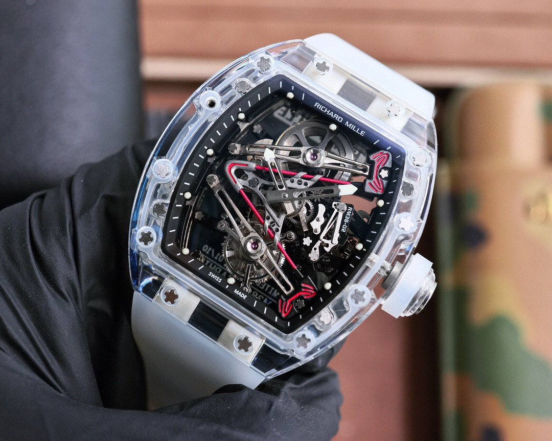 The crystal case allows for a 360 degree fully open view of the movement's complete operation, with a hollowed out bridge outlining a horizontal "V" shape on the dial. The pink hand drawn pattern comes from the club head used by Bubba Watson. The transparent shell fully showcases the beauty of machinery.