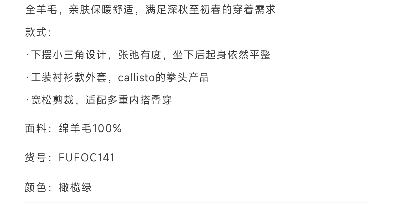 callisto橄榄绿全羊毛工装衬衫款外套