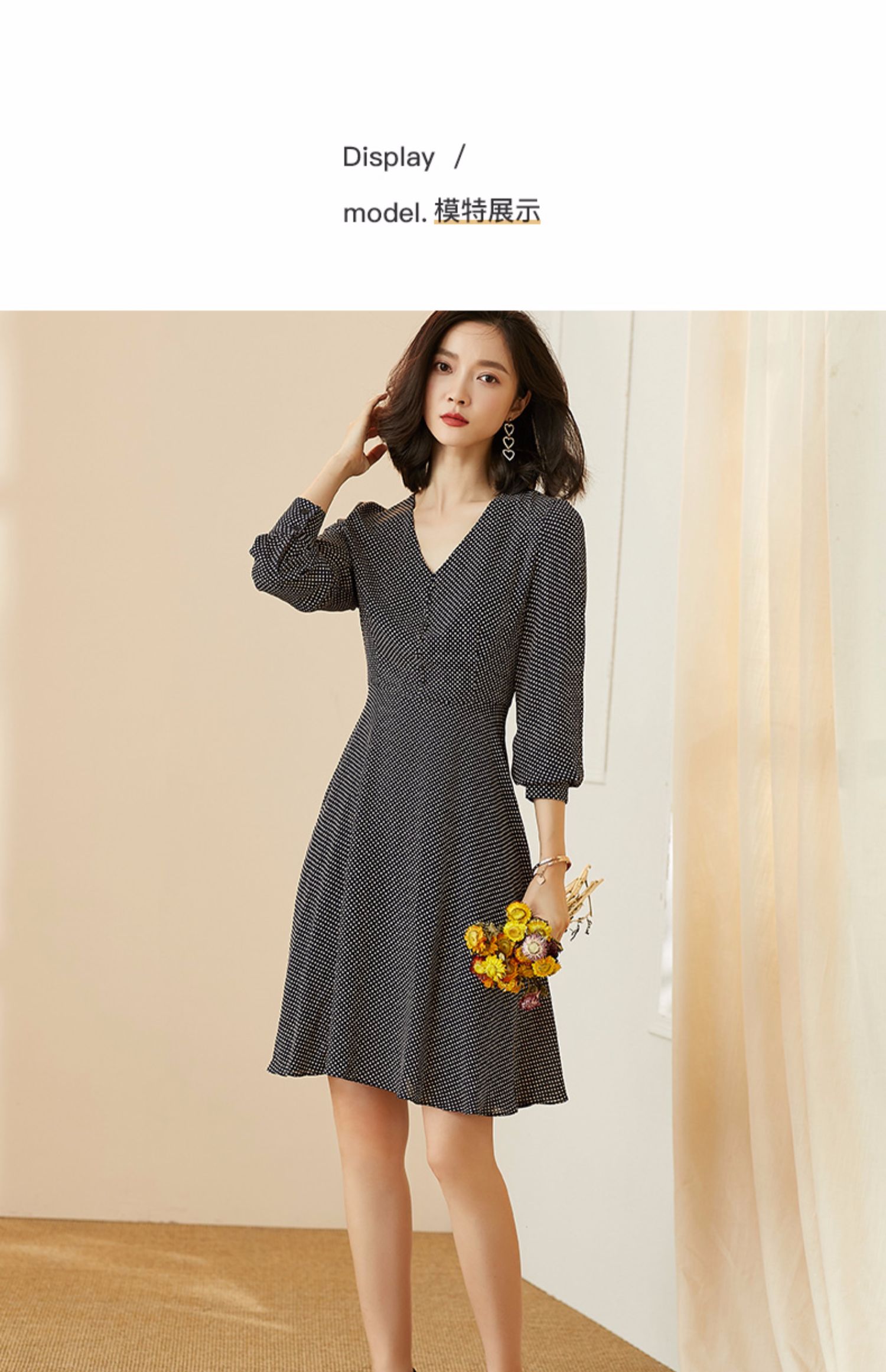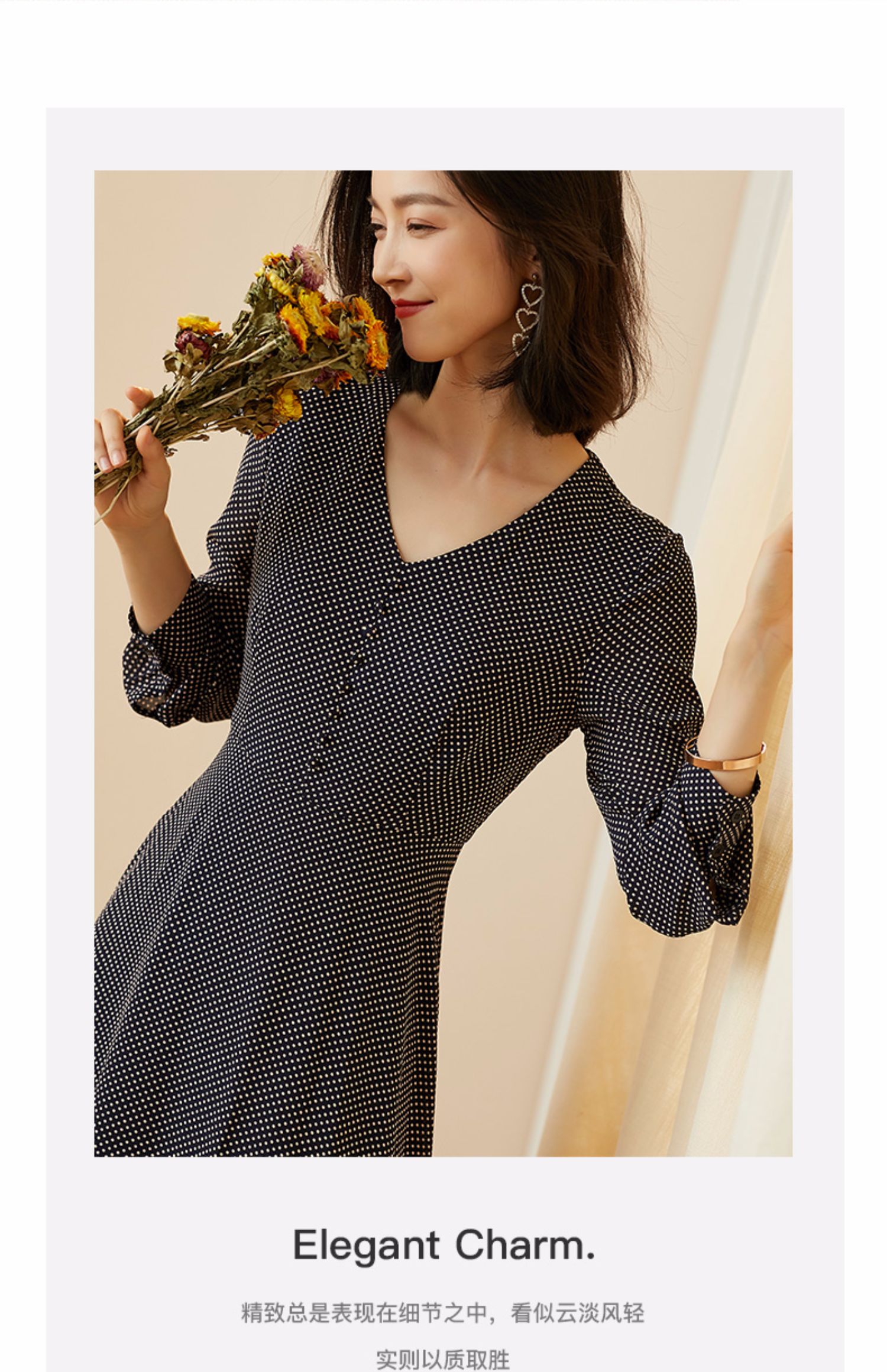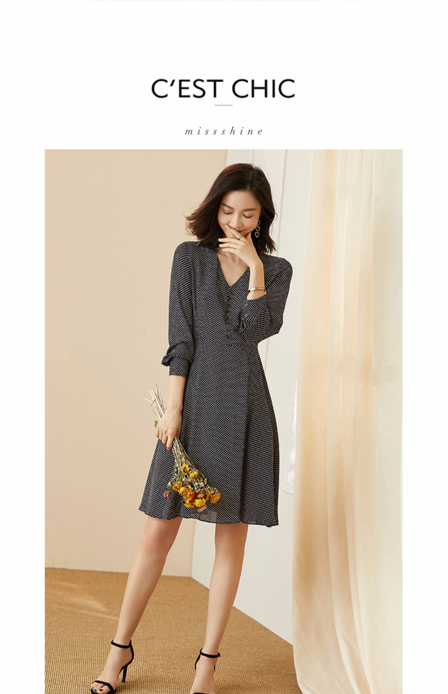 剩S 米思阳2021秋季新款复古波点雪纺裙修身显瘦v领长袖连衣裙2437