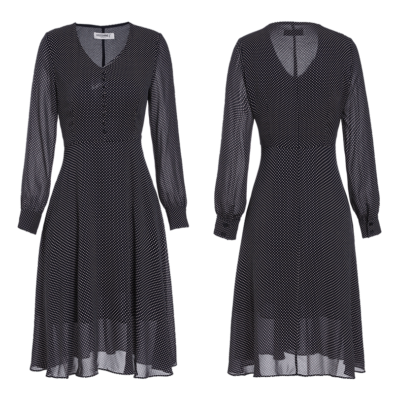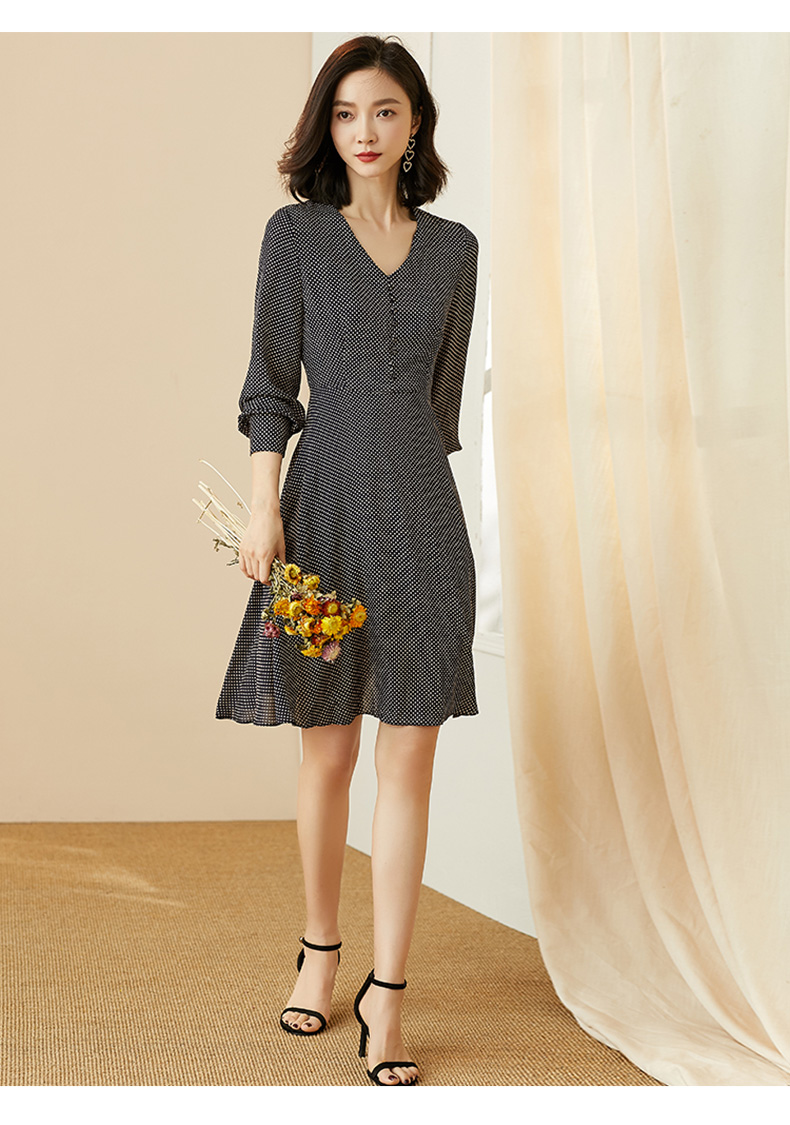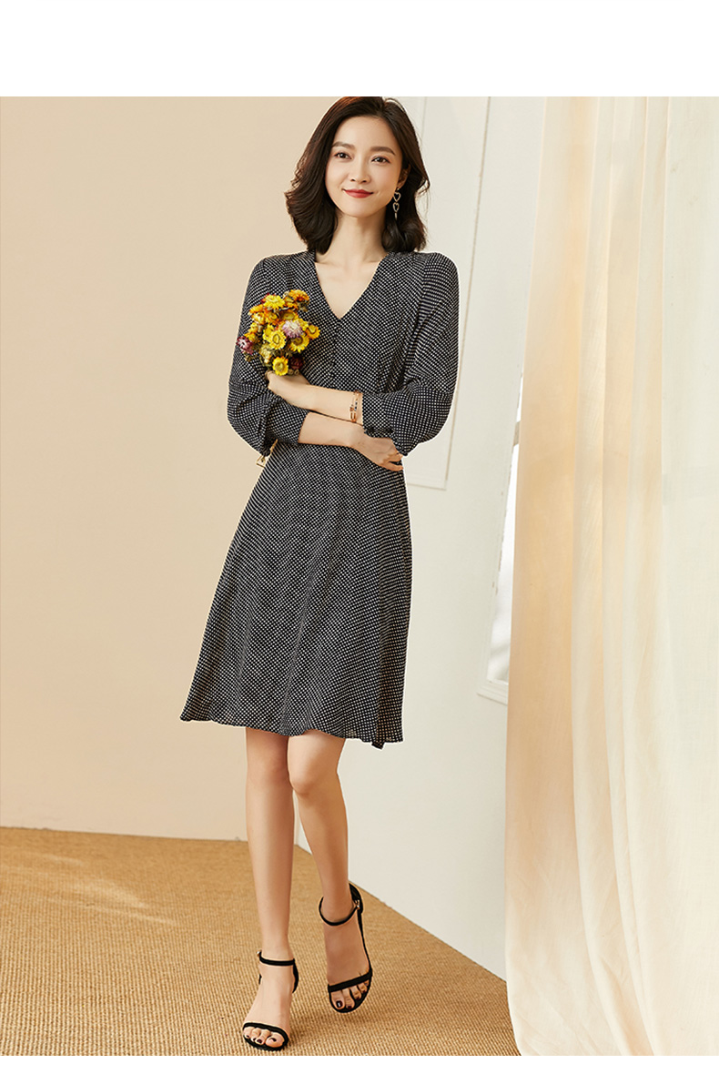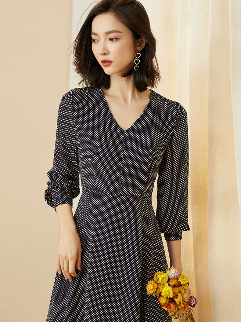 剩S 米思阳2021秋季新款复古波点雪纺裙修身显瘦v领长袖连衣裙2437