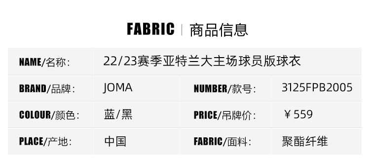 【送印号、广告】SFS荷马JOMA 22/23亚特兰大主场球员版球衣短袖足球服3125FPB2005