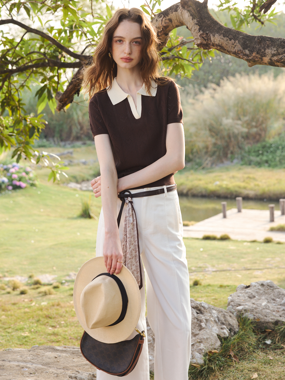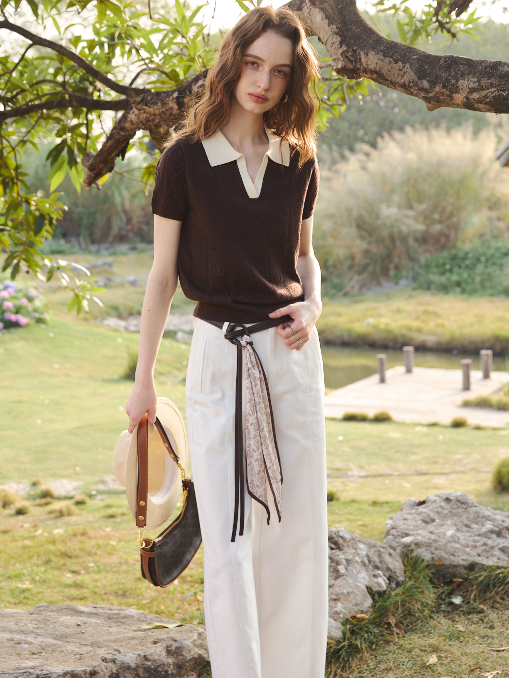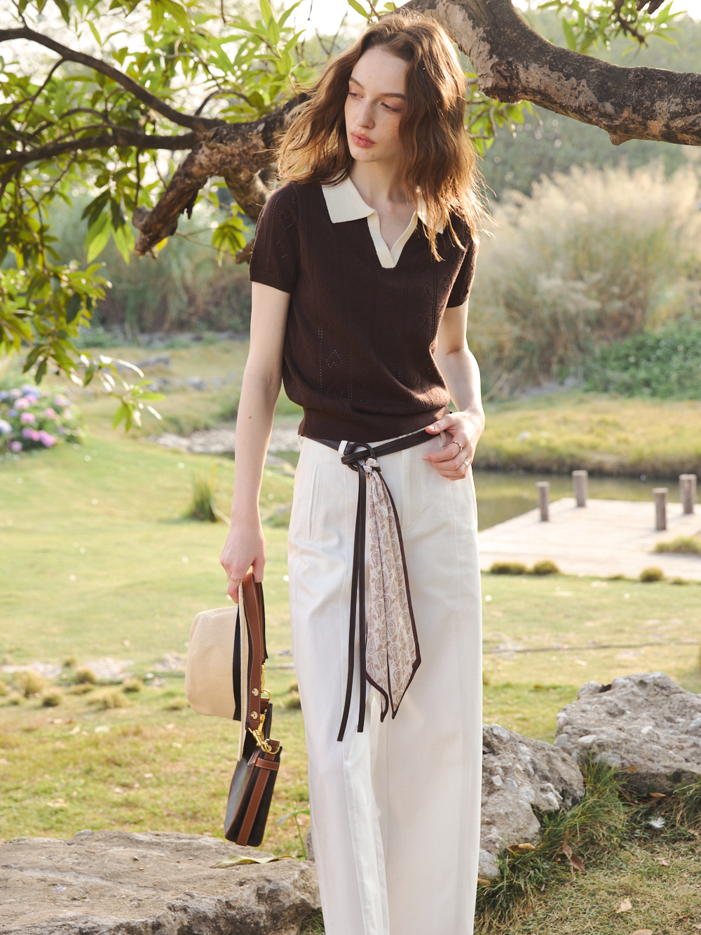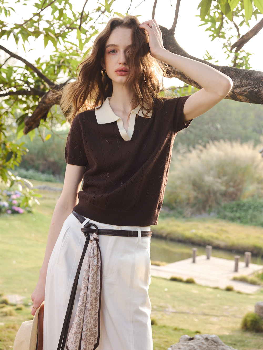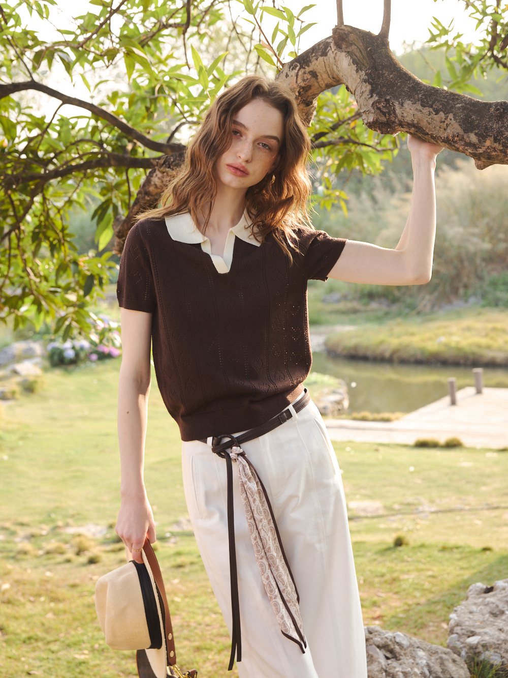 OLrain欧芮儿2026咖色T恤薄套头短袖小翻领针织上衣合身