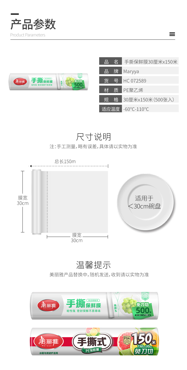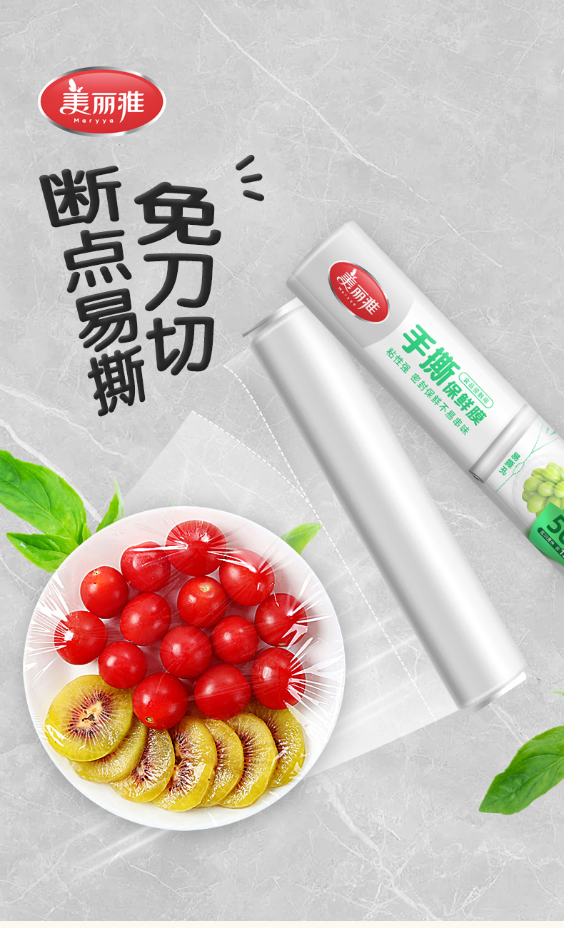 美丽雅手撕式保鲜膜防串味食品级易撕保鲜150米大容量