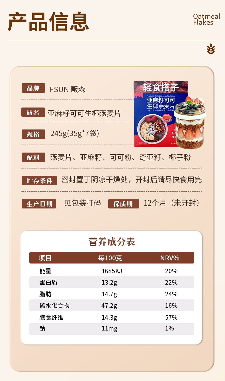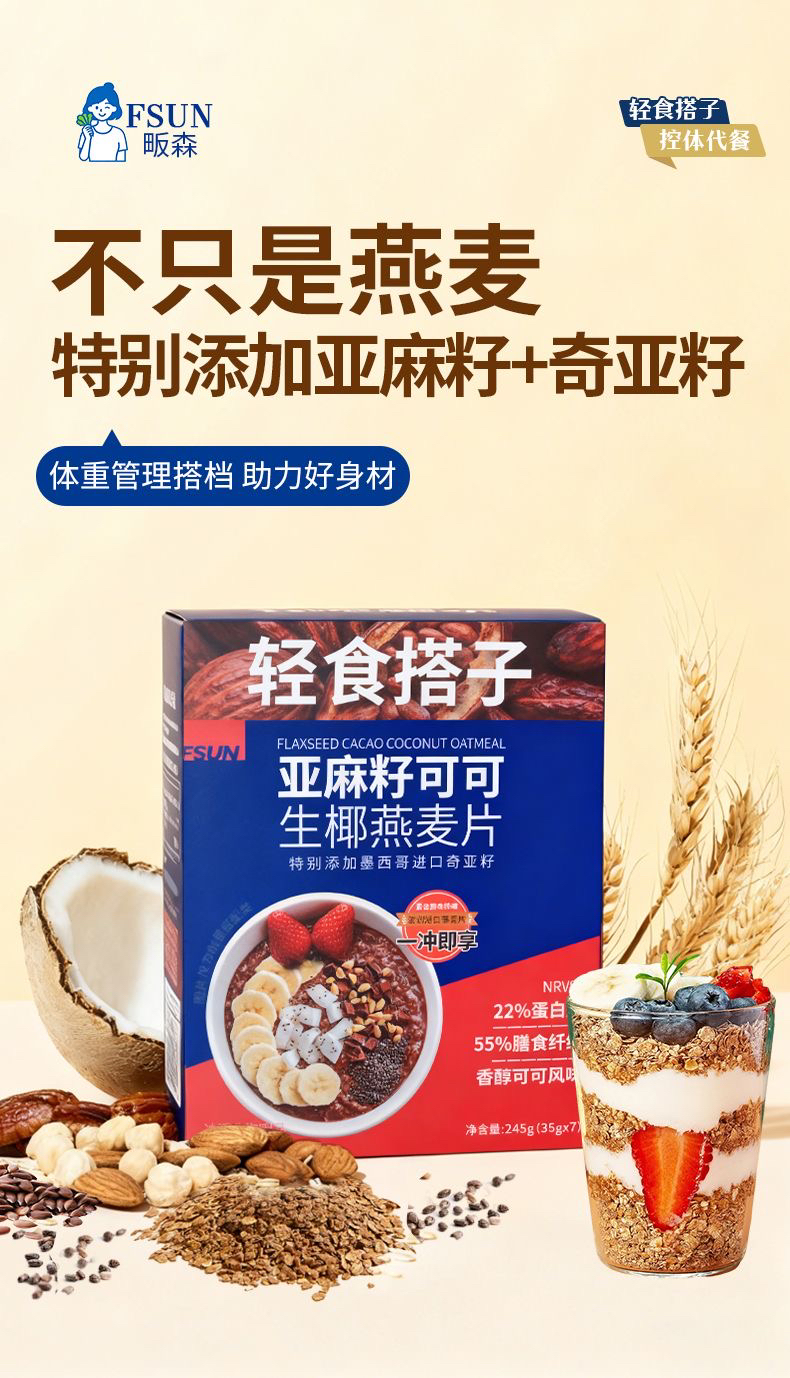 轻食搭子亚麻籽可可生椰燕麦片