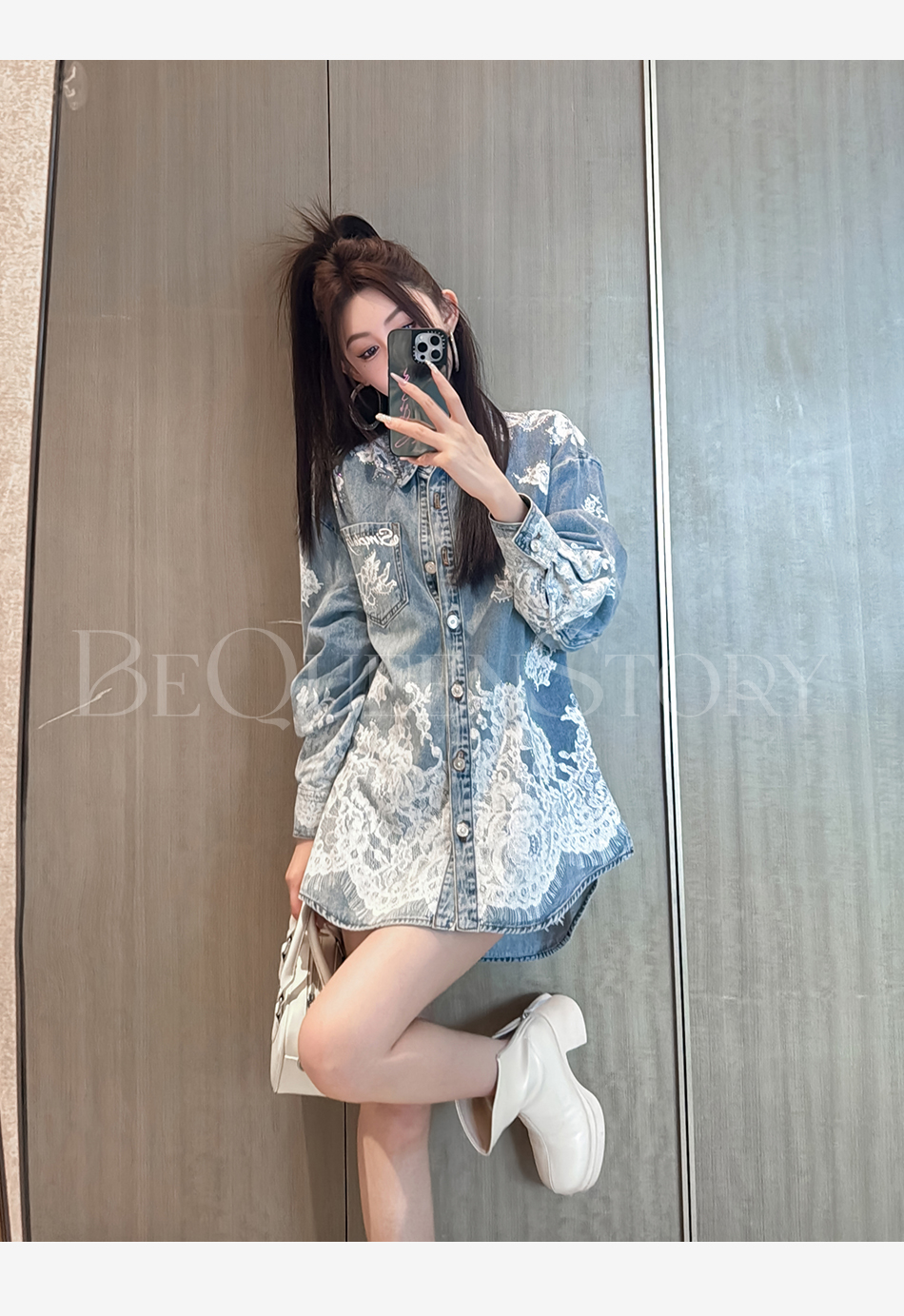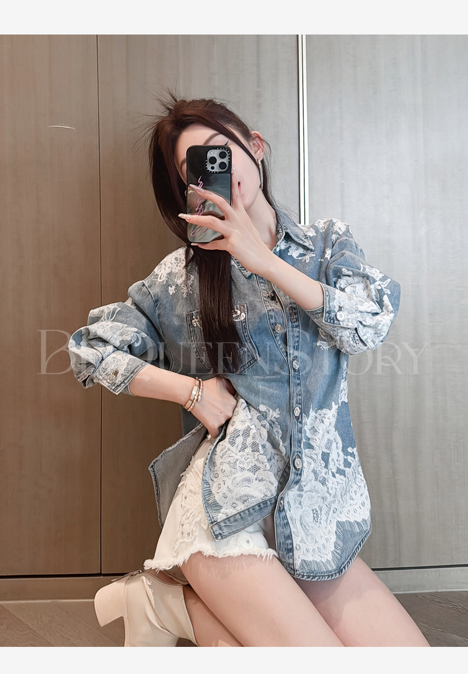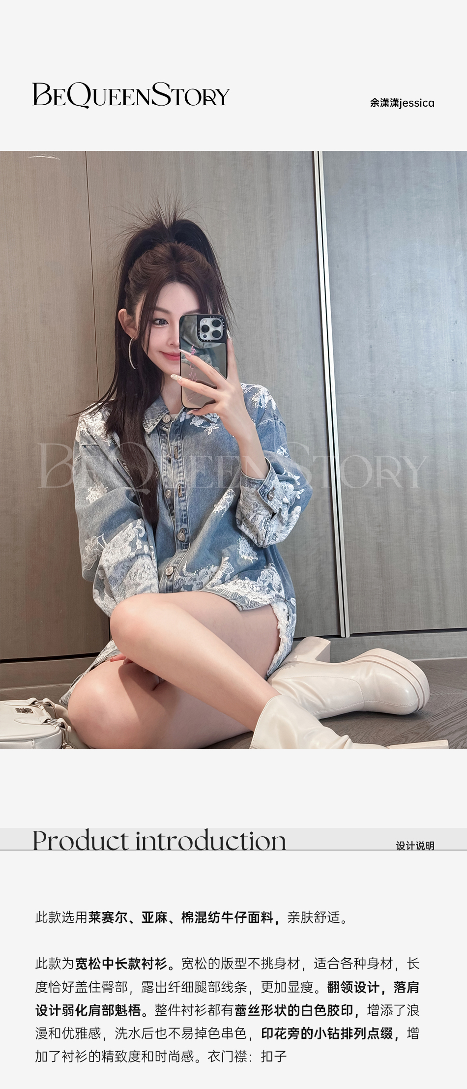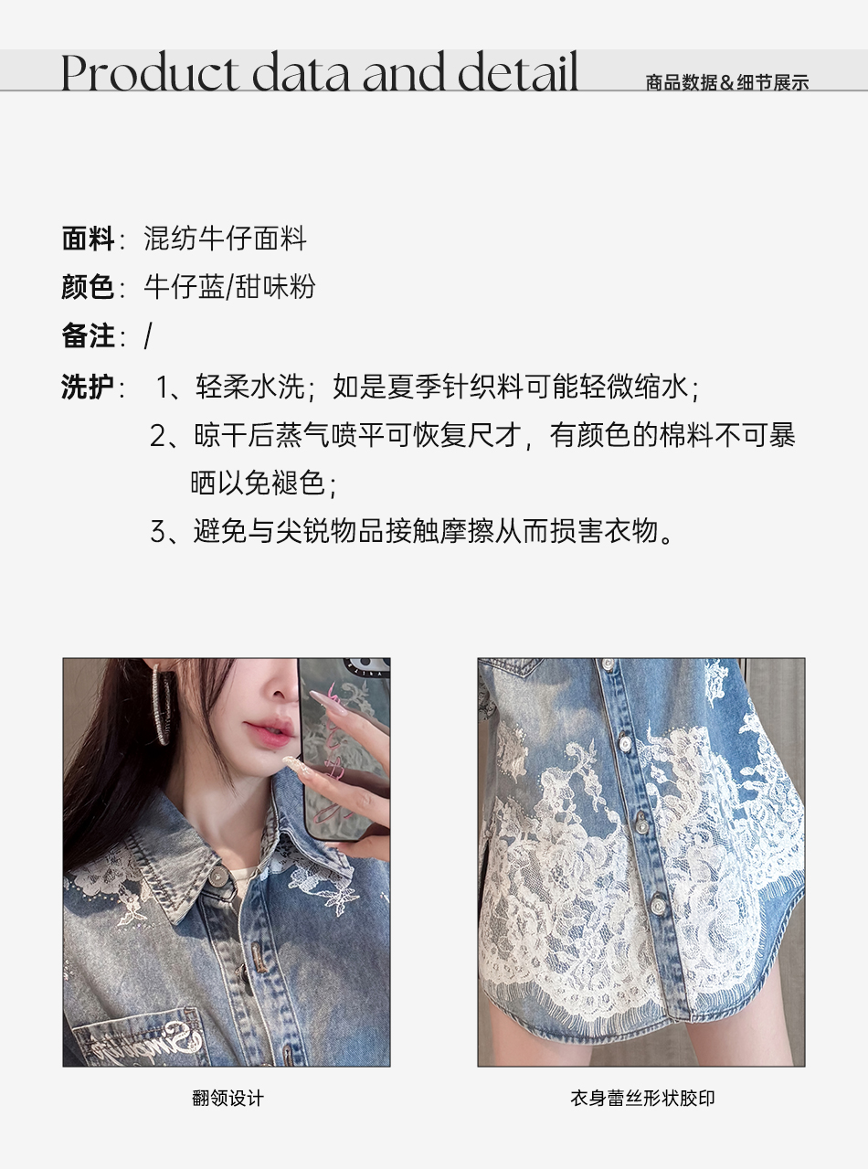 余潇潇【邂逅爱神】翻领印花蕾丝宽松中长款衬衫2025春季新款