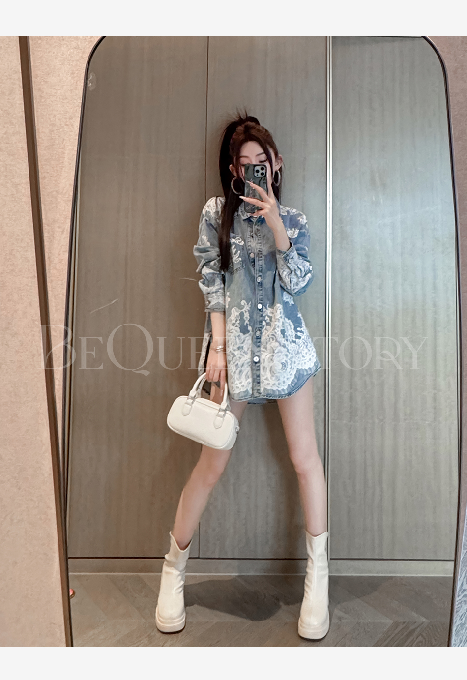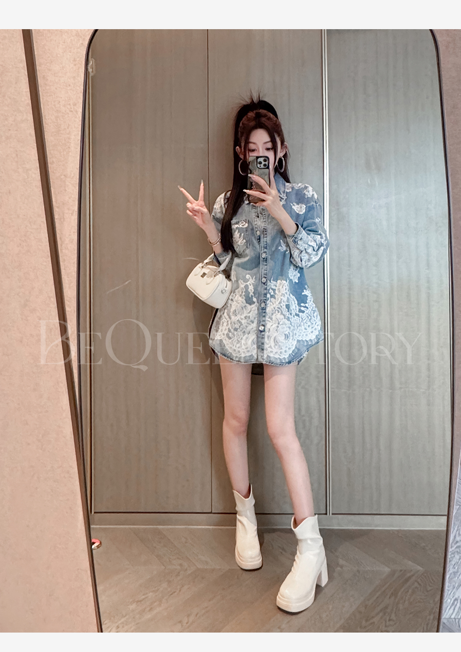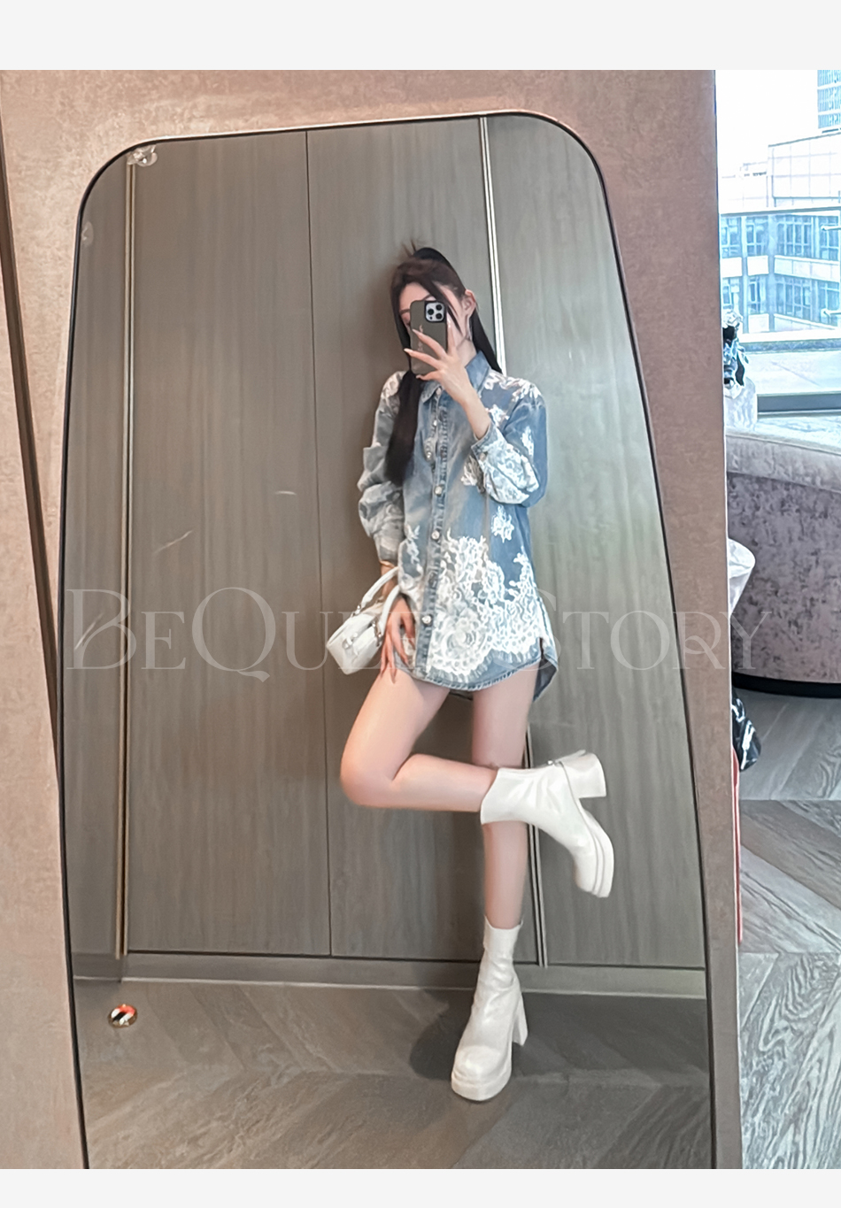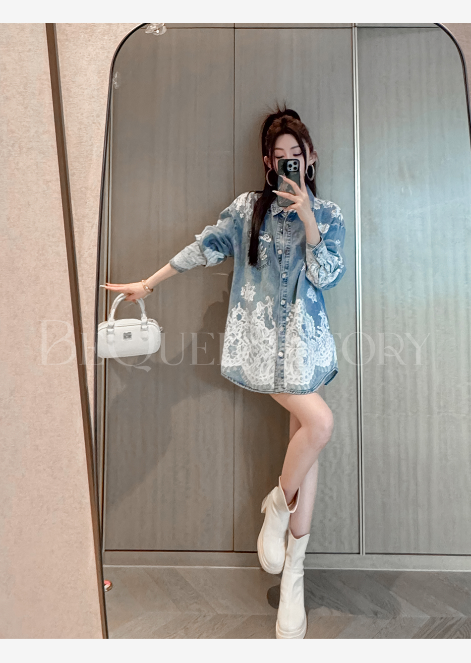 余潇潇【邂逅爱神】翻领印花蕾丝宽松中长款衬衫2025春季新款