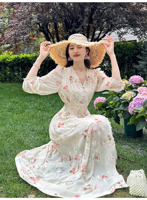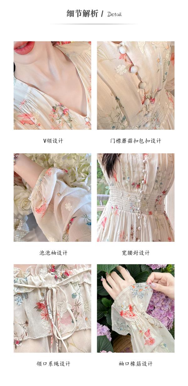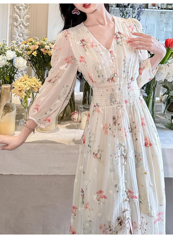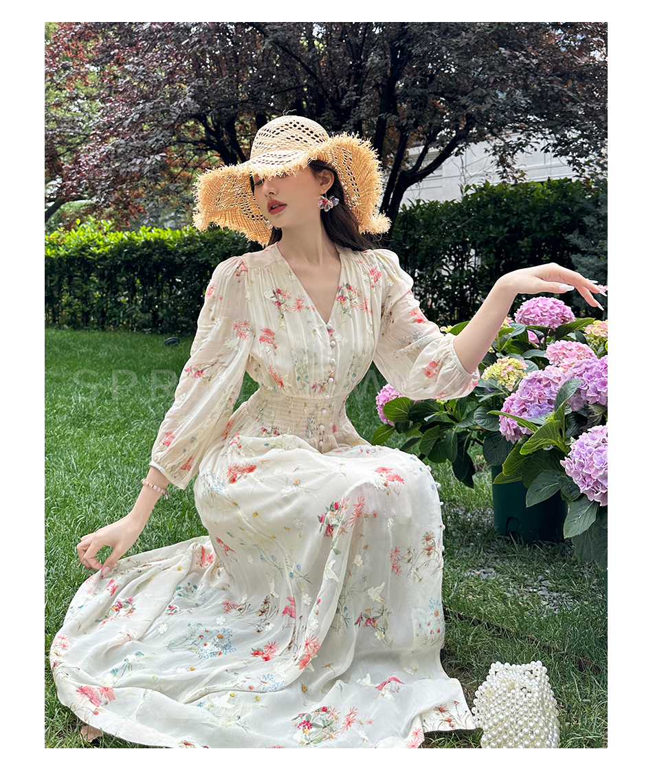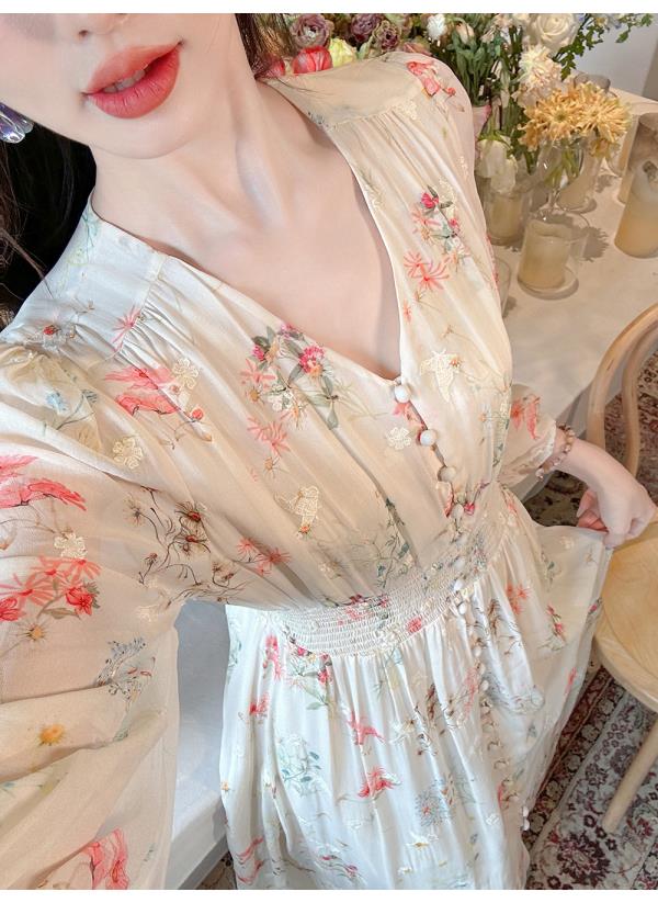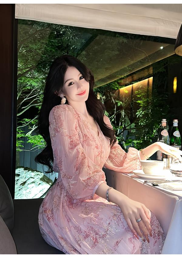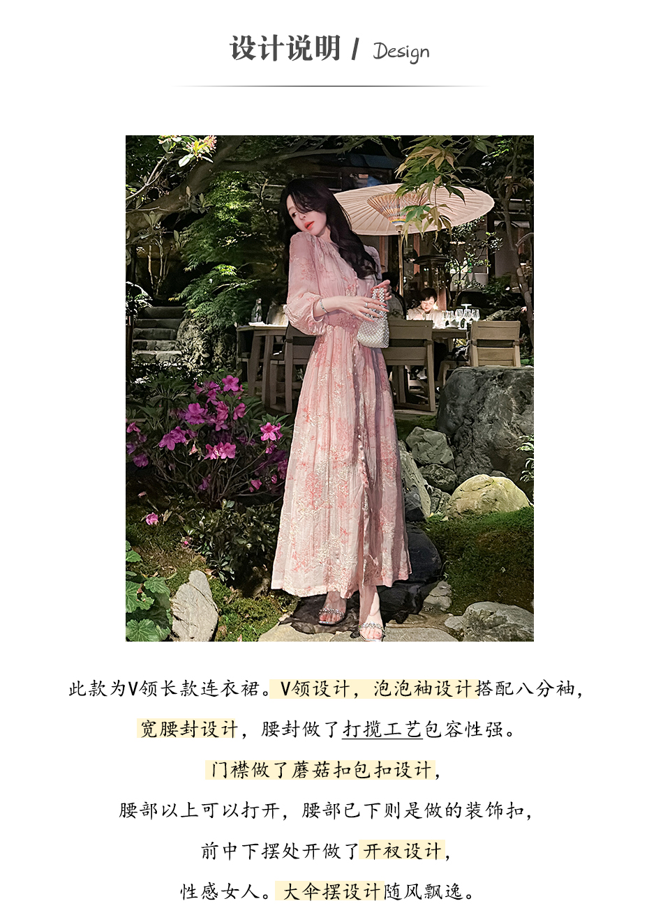 BeQueenStory【花神喜事】宽腰封金丝线立体刺绣V领长款连衣裙