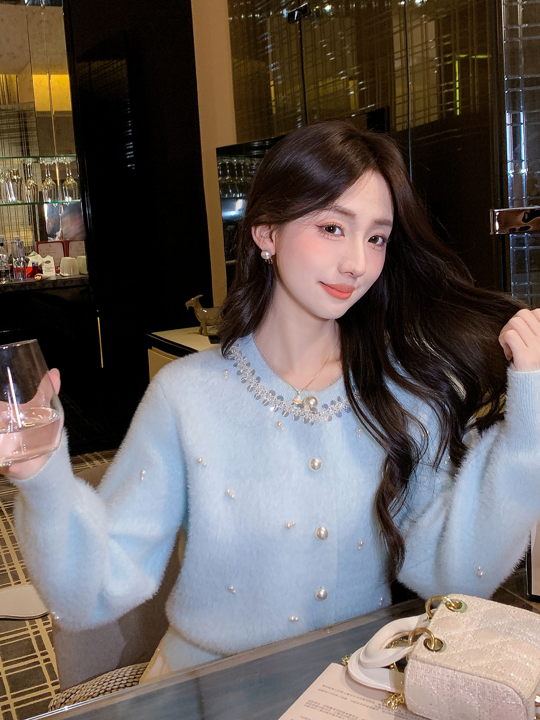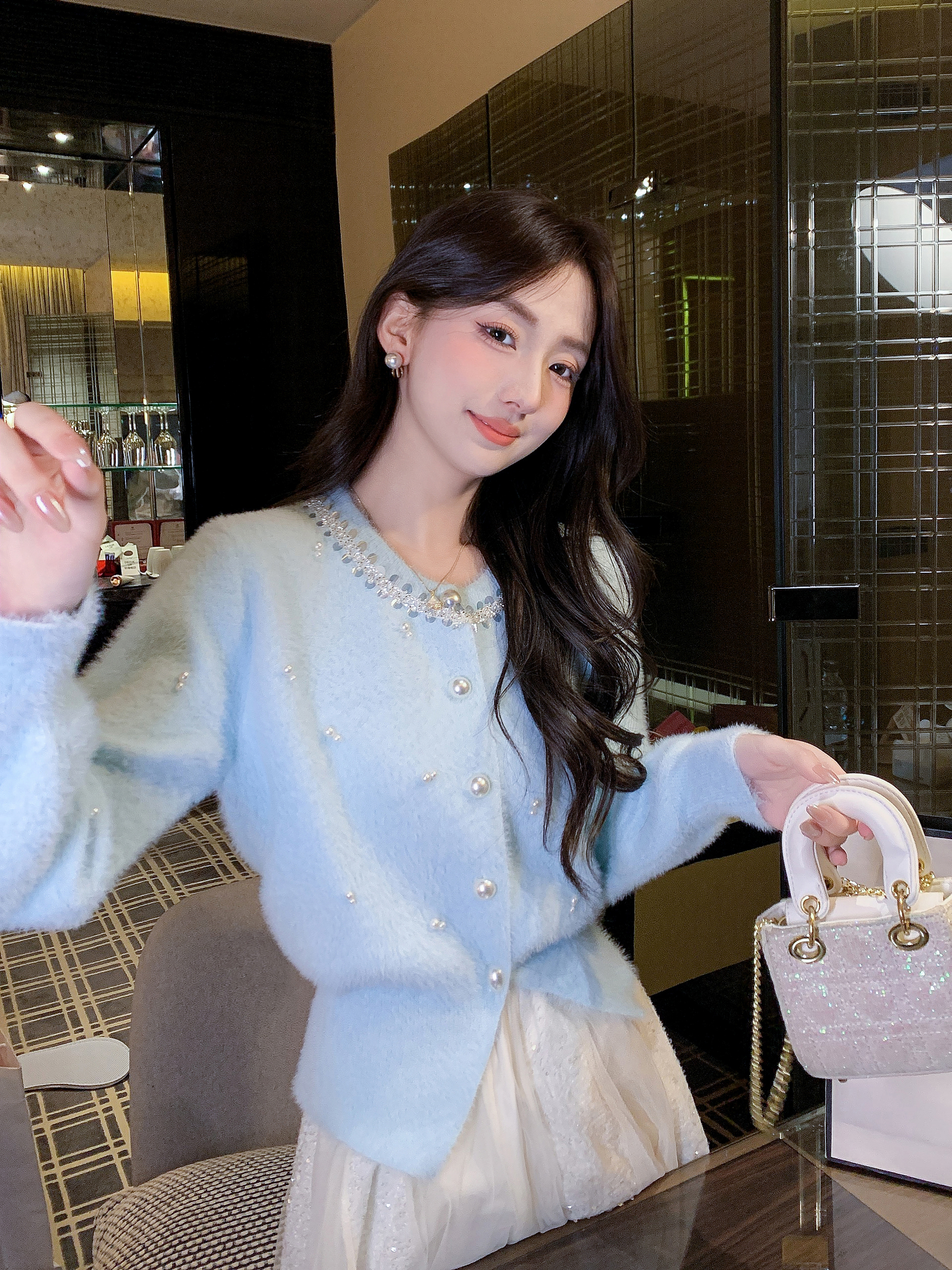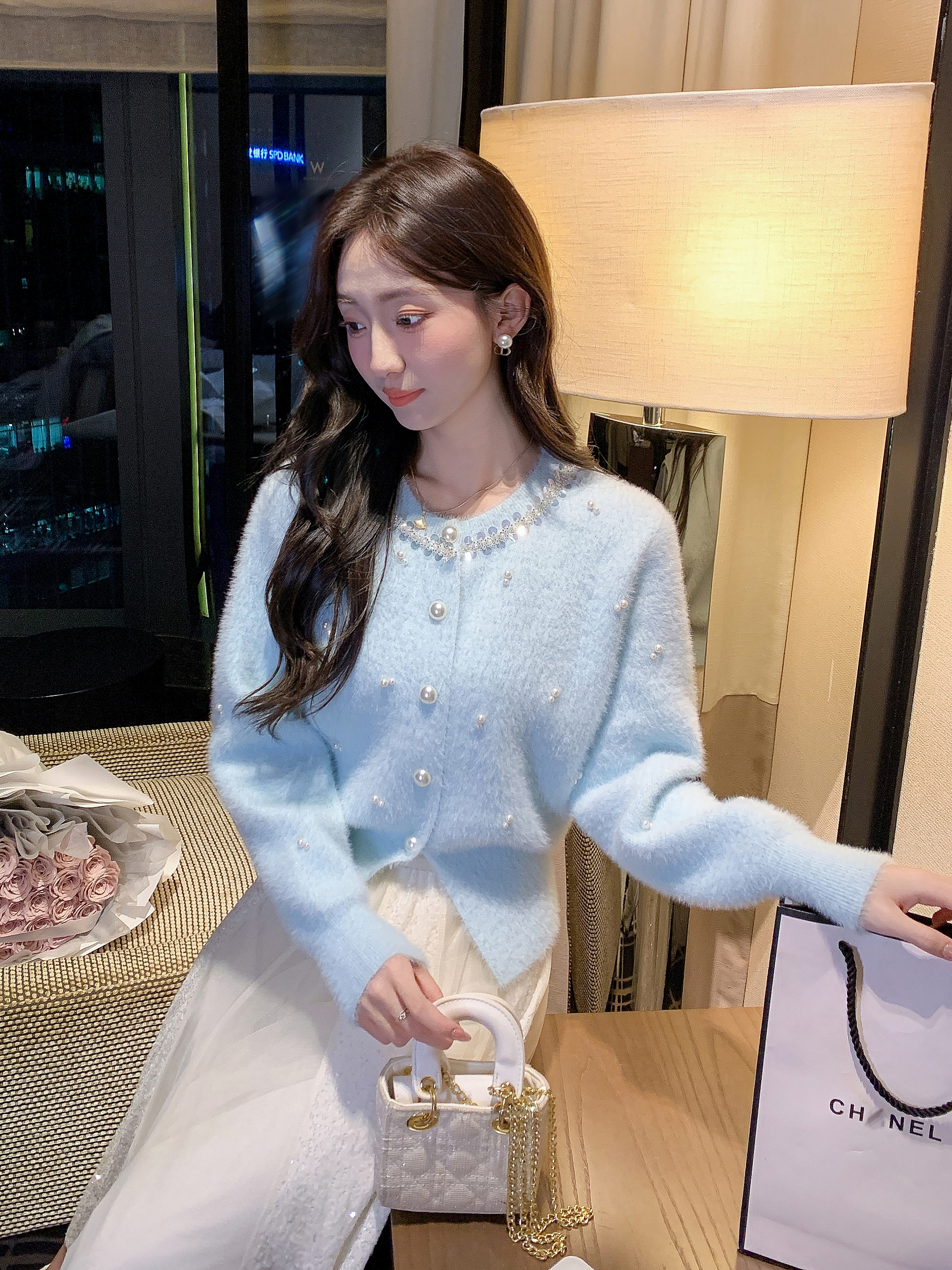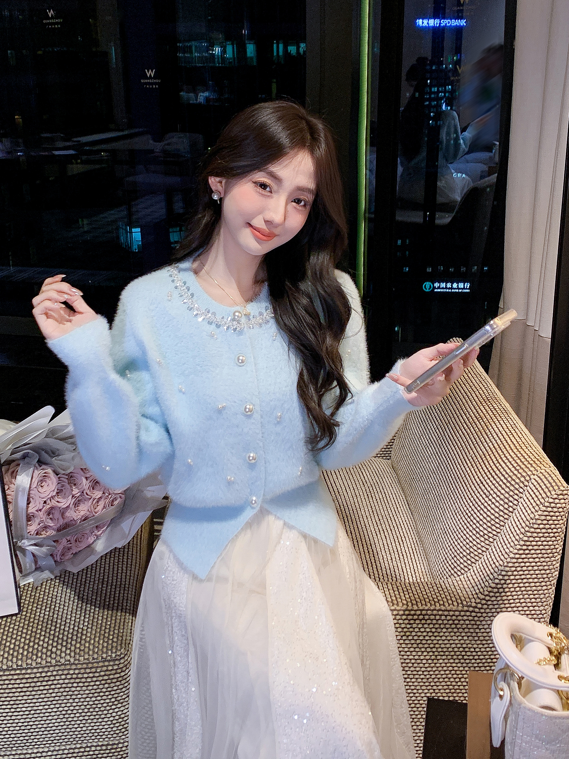张心子【降温周刊】圆领厚实毛绒满珠水貂毛开衫外套 U2511082