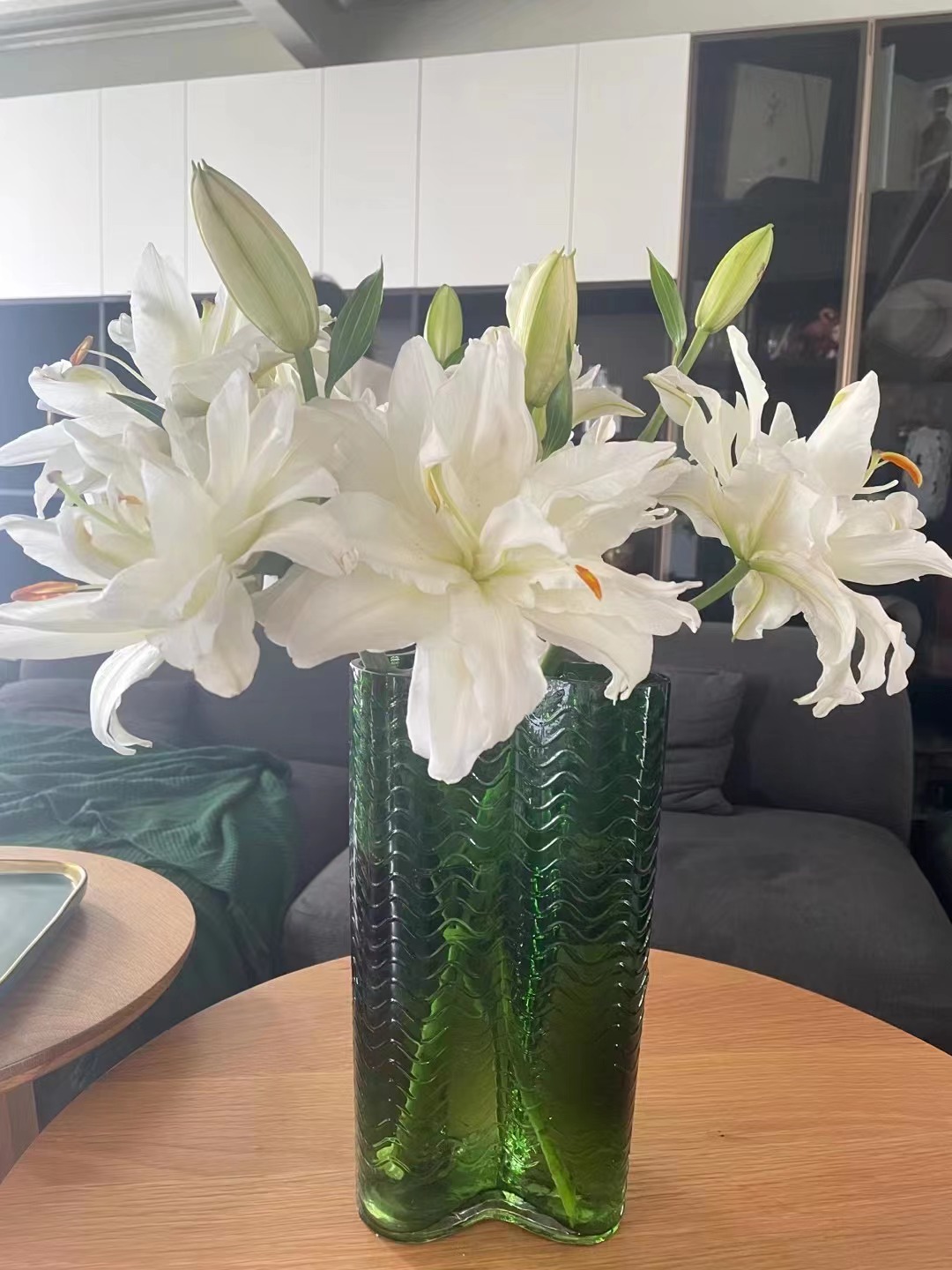 3、根据花瓶来适当的剪短你的百合,浅水位或者二分之一水位养护,大概10-15cm的水位就够了;