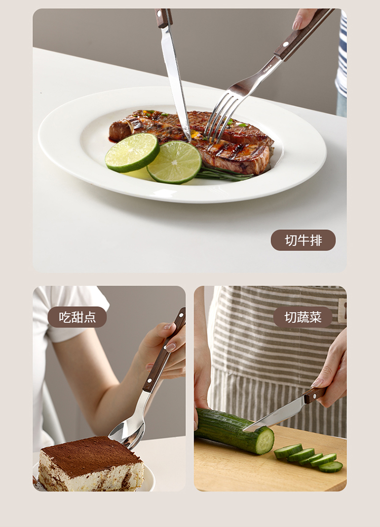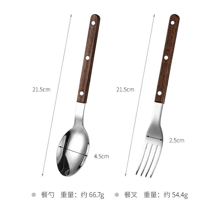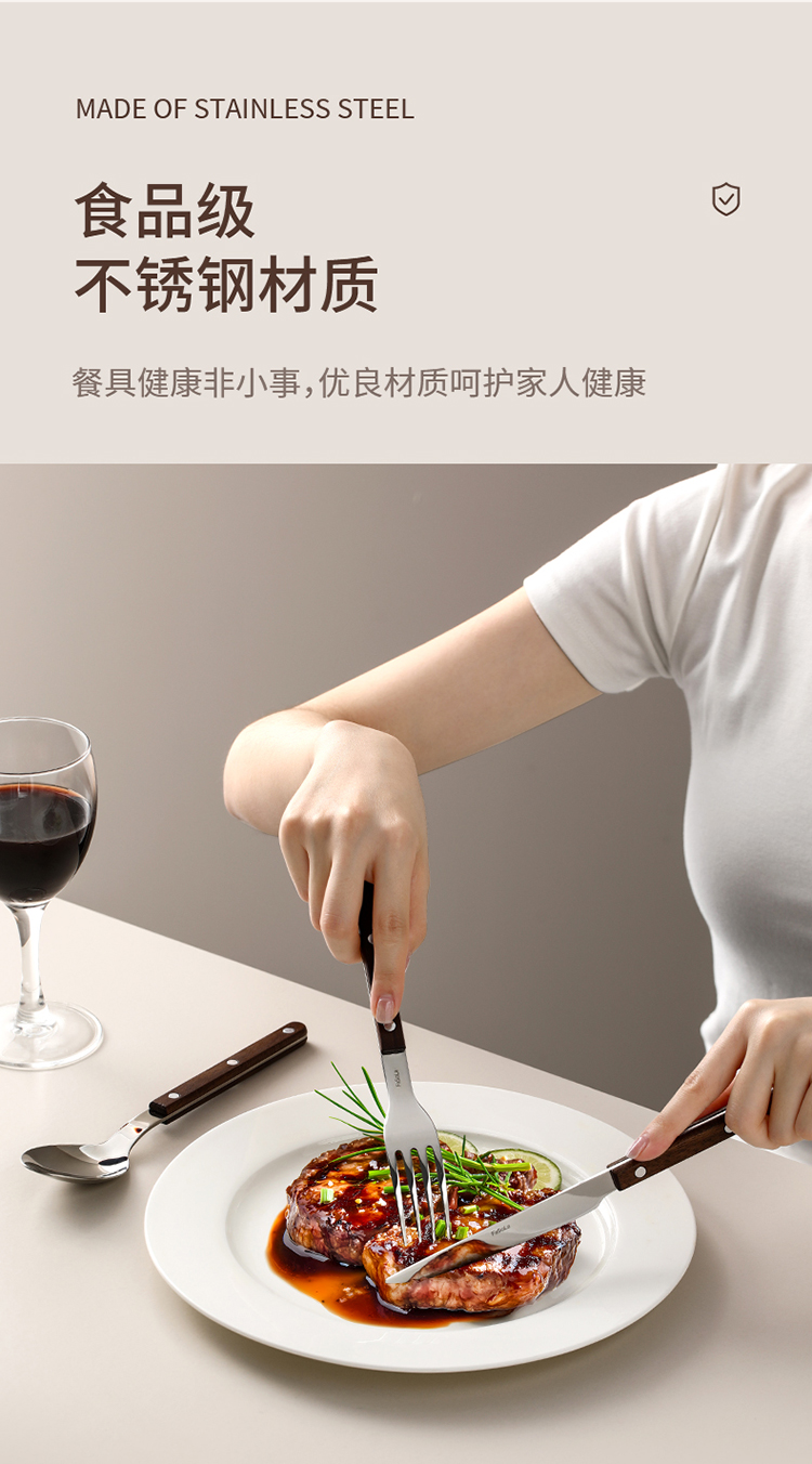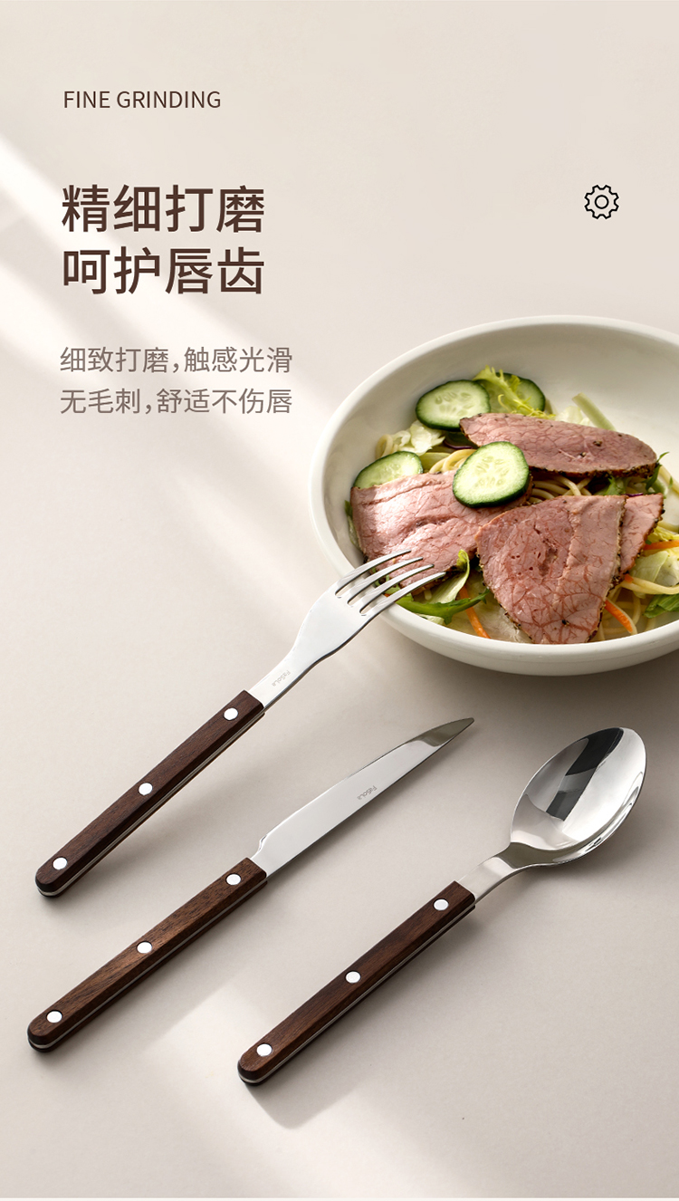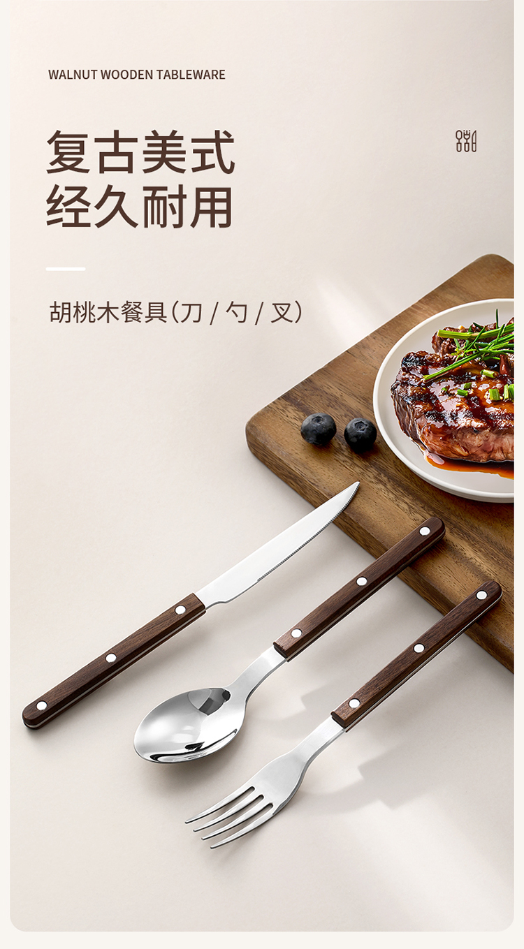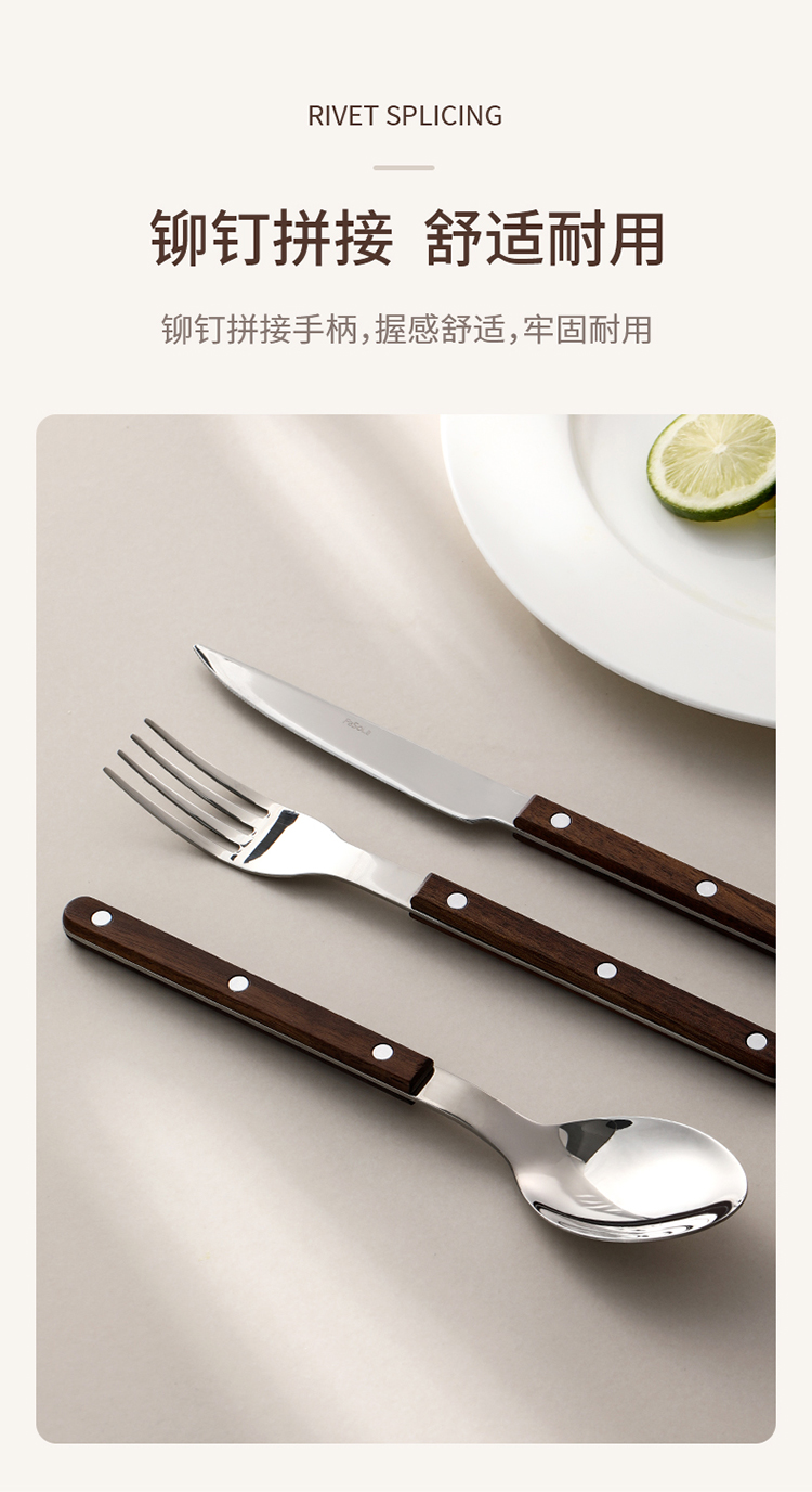 FaSoLa西餐刀叉勺三件套304不锈钢牛排刀叉复古高级感胡桃木餐具