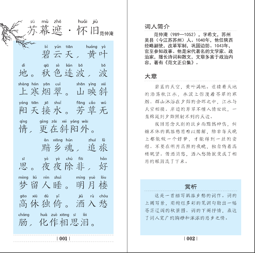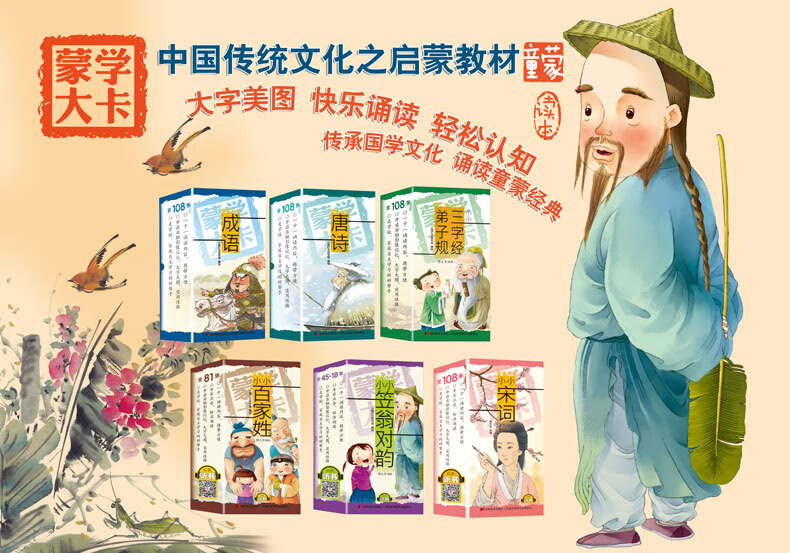 蒙学的概念,广义上泛指我国古代的幼儿启蒙教育,狭义上专指童蒙读本。经典的童蒙读本都是以防邪存诚、启蒙养正为主要目的,着重培养孩童认字和读写能力,提升文化知识储备,对其进行礼仪行止教育,是孩童学习传统文化知识与为人处世之道的有效途径。《蒙学大卡•小小宋词》共108张卡片,选取了宋代39位著名词人的106首词作,最后两张卡片是盒卡的目录。盒卡中前106张卡片,一卡一内容,携带方便;正面是宋词的内容,大字注音,开启右脑影像记忆,实用性强,是学校、家庭自主学习的好帮手。