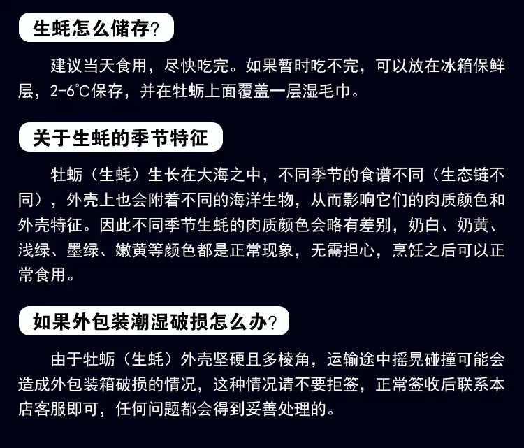 ⚠生蚝都是当天净化池打捞当天发走,现在天气热,温度高,生蚝表皮一些微生物在箱子里面会有海腥味,签收一定及时拿出来食用,只要五天之内签收都是没有问题的,介意味道的勿拍哦