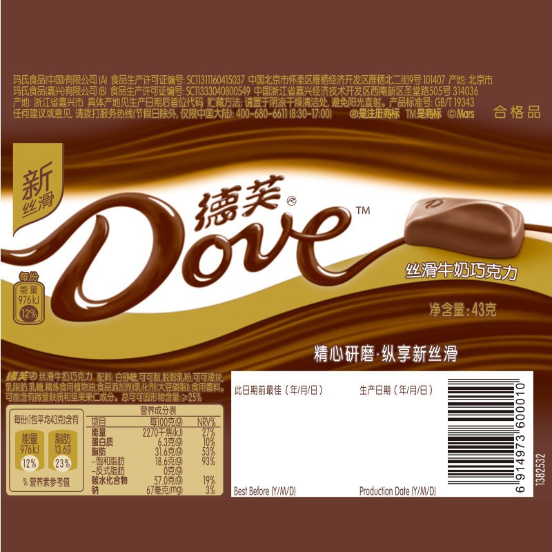 【食品酒水】德.芙巧克力牛奶纯黑白巧克力43g*12整盒装榛仁排块礼盒散装糖果