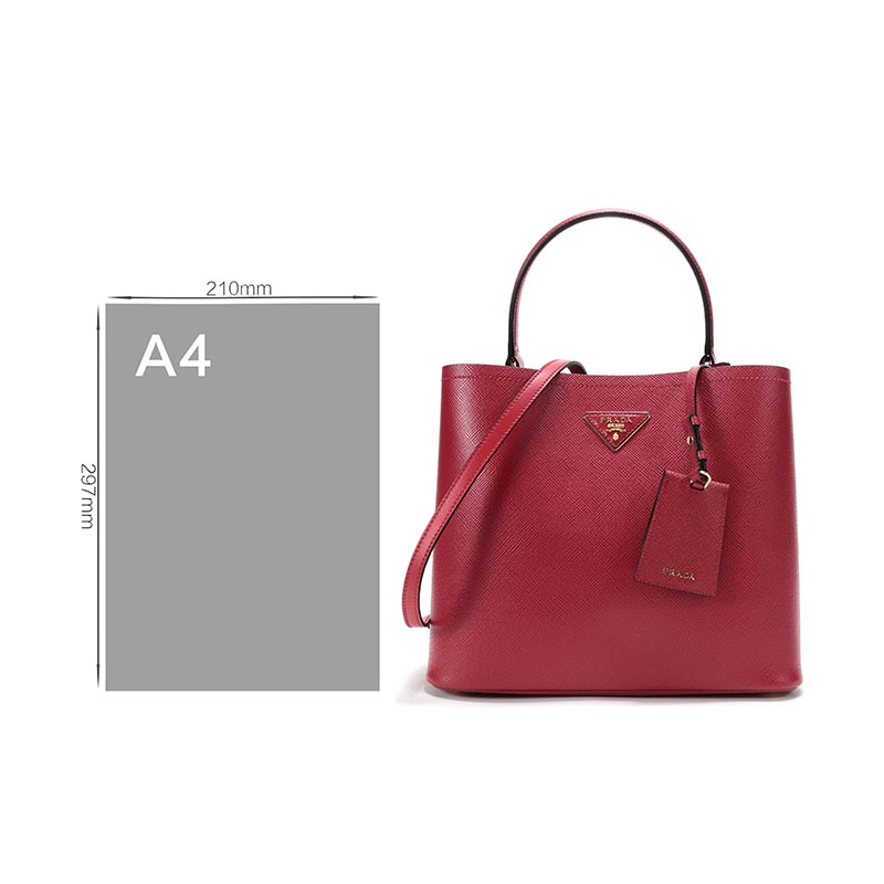 ![]() | 品牌:PRADA/普拉达 产地:意大利等国(批次不同、产地不同) 款式:女士 产品颜色:红色 材质:牛皮 产品结构:开放式包口,吸扣开合,内置2个主袋,1个隔层 产品尺寸:宽约27cm,高约24cm,厚约13.5cm,可拆卸可调节肩带长约120cm,宽约1.2cm(注:所有尺寸皆为手工测量,存在误差,请以实物为准!)