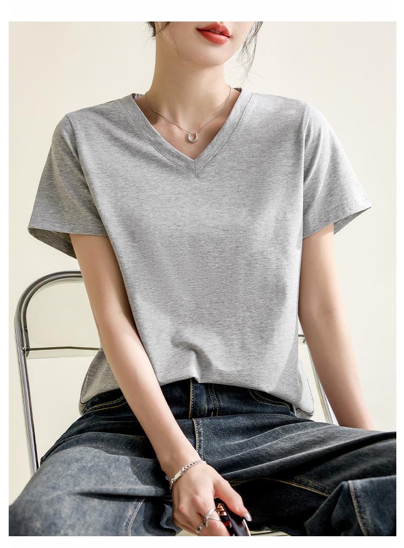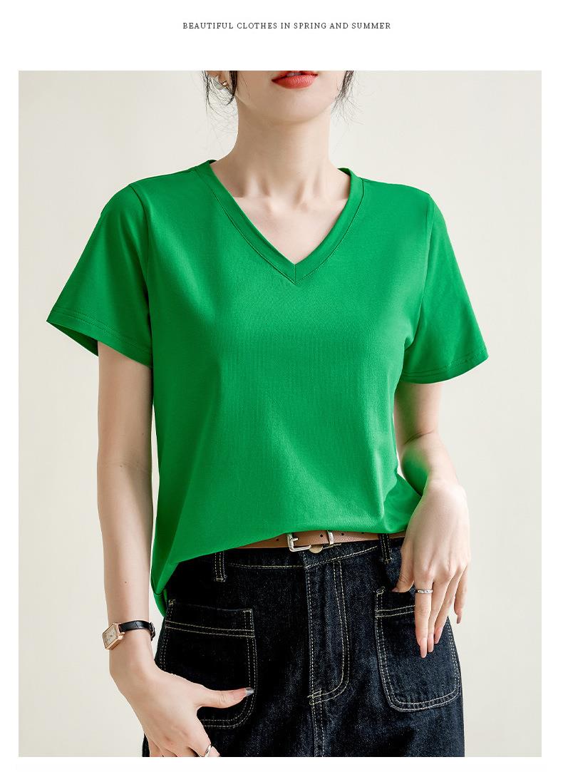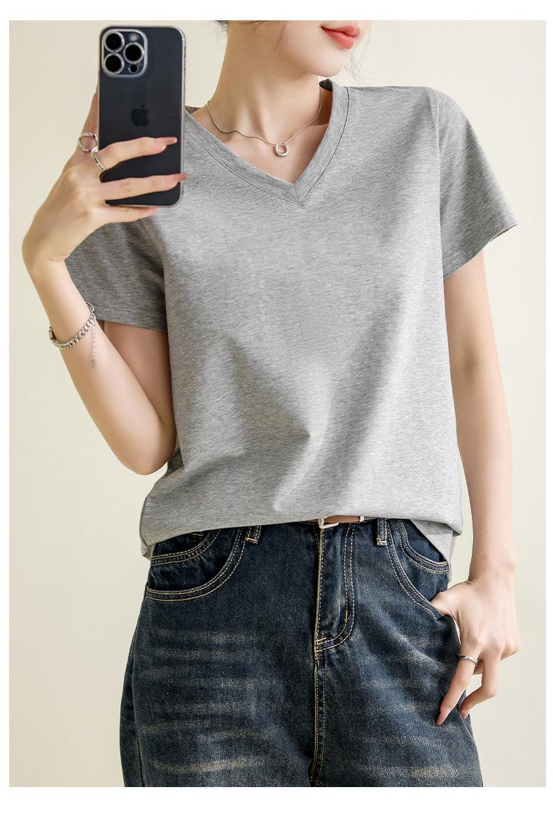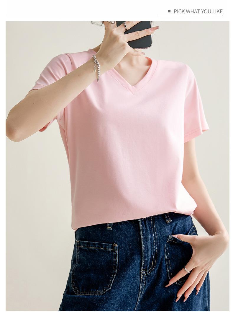 气质纯色正肩V领棉T恤女2024春夏新款宽松显瘦内搭套头短袖上衣