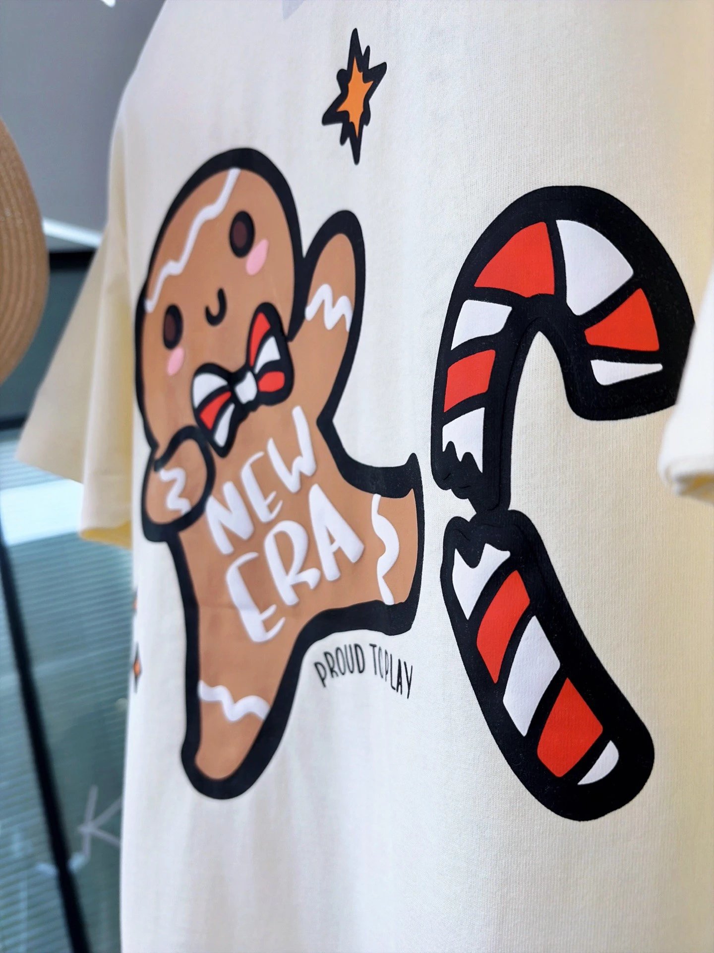 线下限定款纽亦华卡通趣味风T恤,奶油黄底色搭配立体发泡印花的姜饼人款式,小落肩款!?