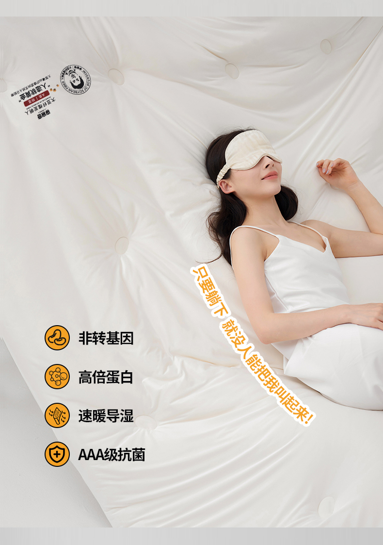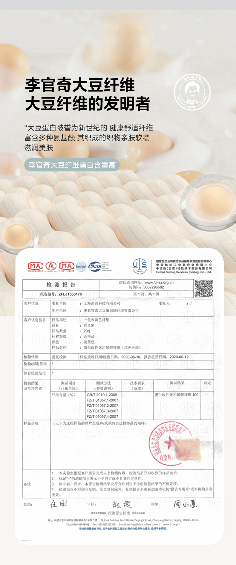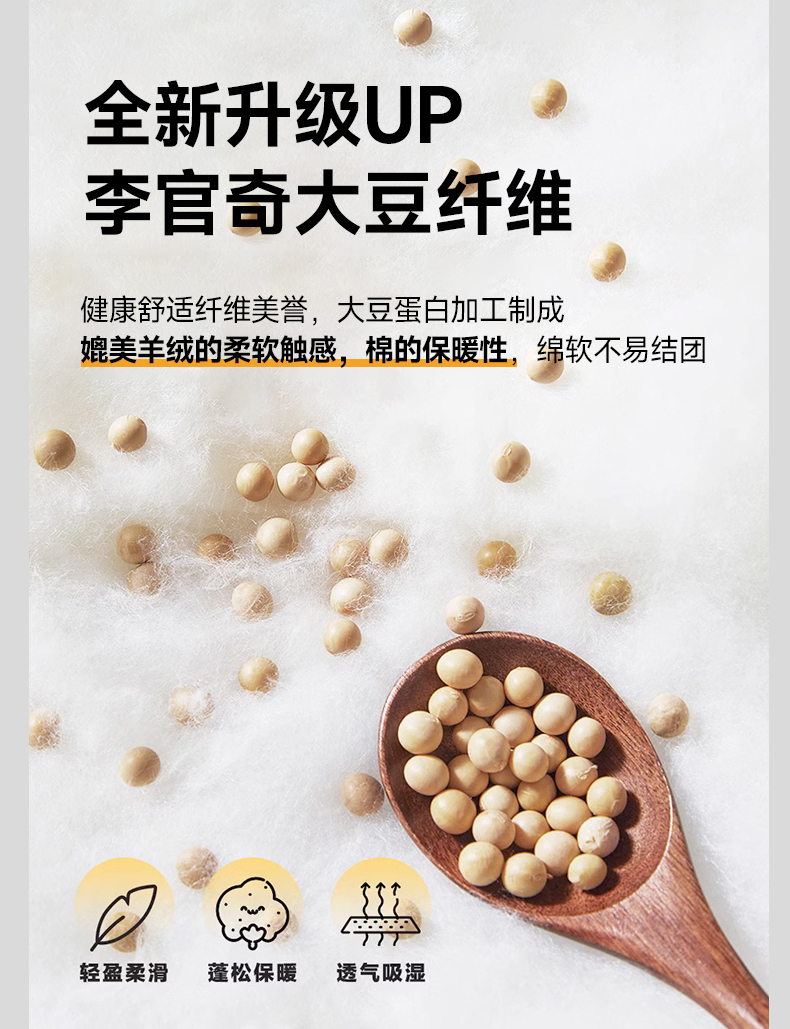 这样既能保持了大豆纤维吸湿透气、不易生虫滋生细菌等特性,同时又有了超细聚酯纤维带来保暖轻盈、蓬松透气的舒适感。